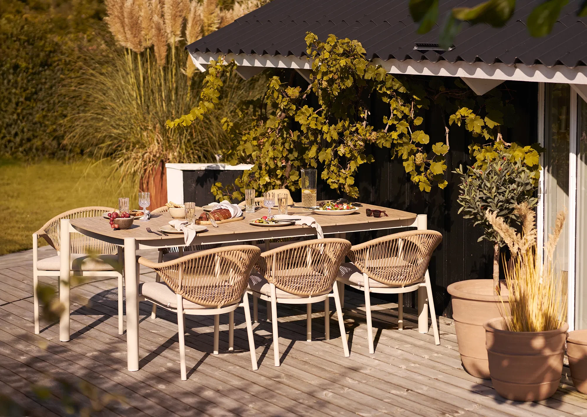 Abela valgomojo lauko baldų komplektas leidžia sukurti stilingą ir patogią terasos valgomojo zoną, kurioje susitinka funkcionalumas, natūralūs tonai ir modernus dizainas.