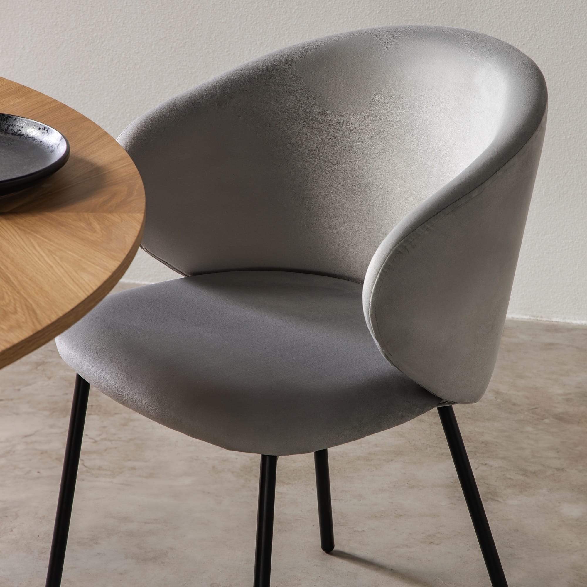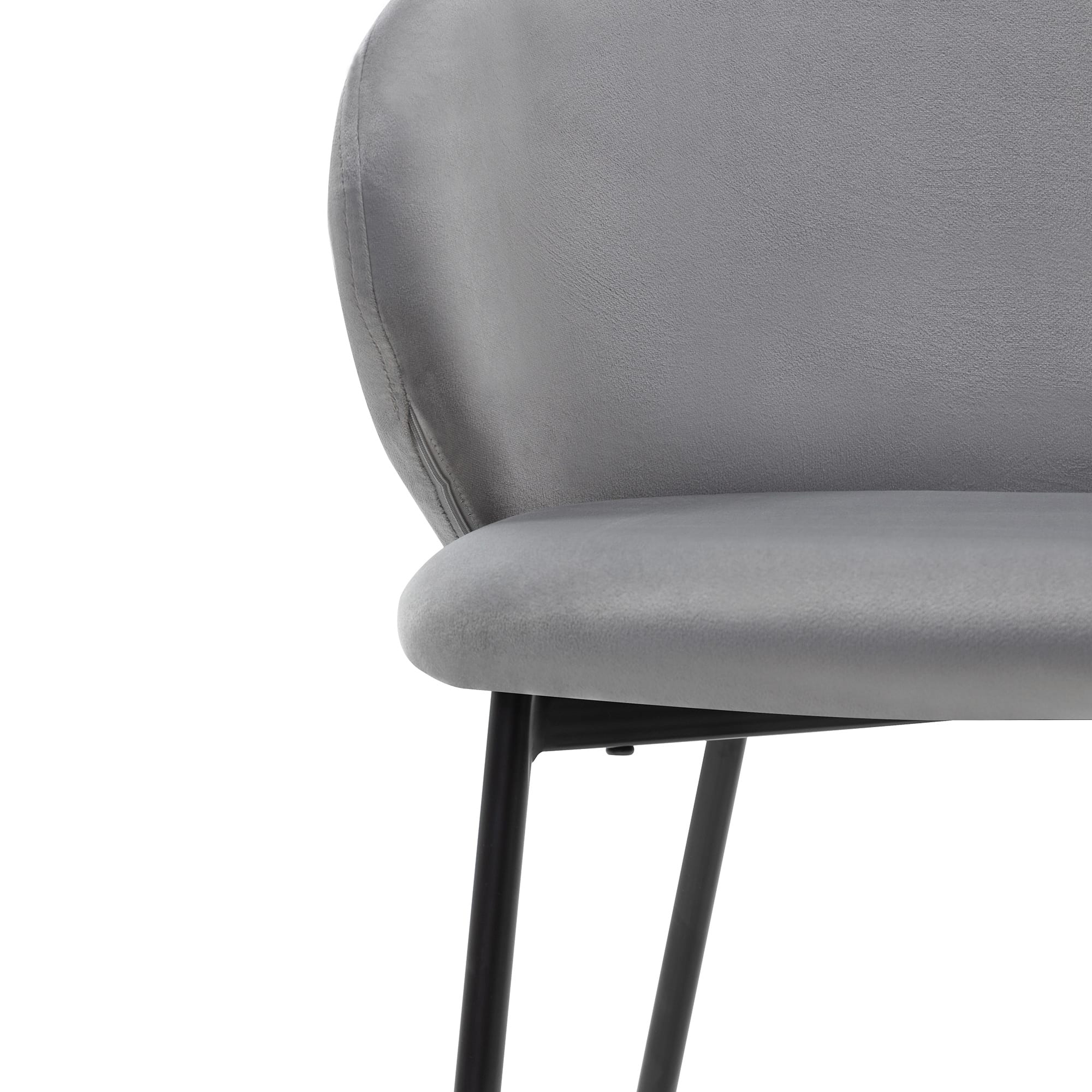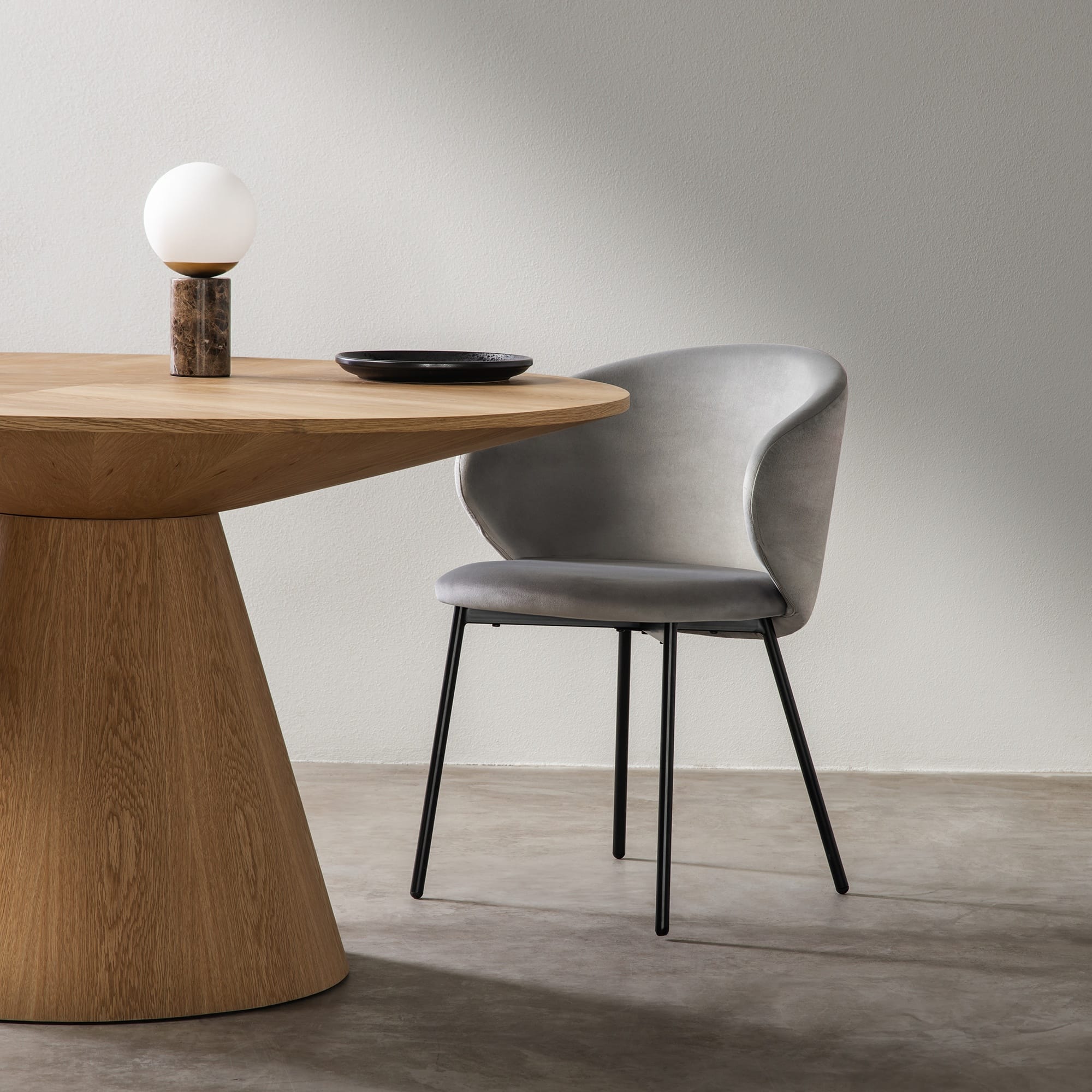 Adrano Grey kėdė – tai šiuolaikinės elegancijos ir subtilaus kontrasto išraiška. Jos pilkas aksominis audinys sukuria prabangos pojūtį, o juodos metalo kojelės suteikia tvirtumo ir modernumo balansą.