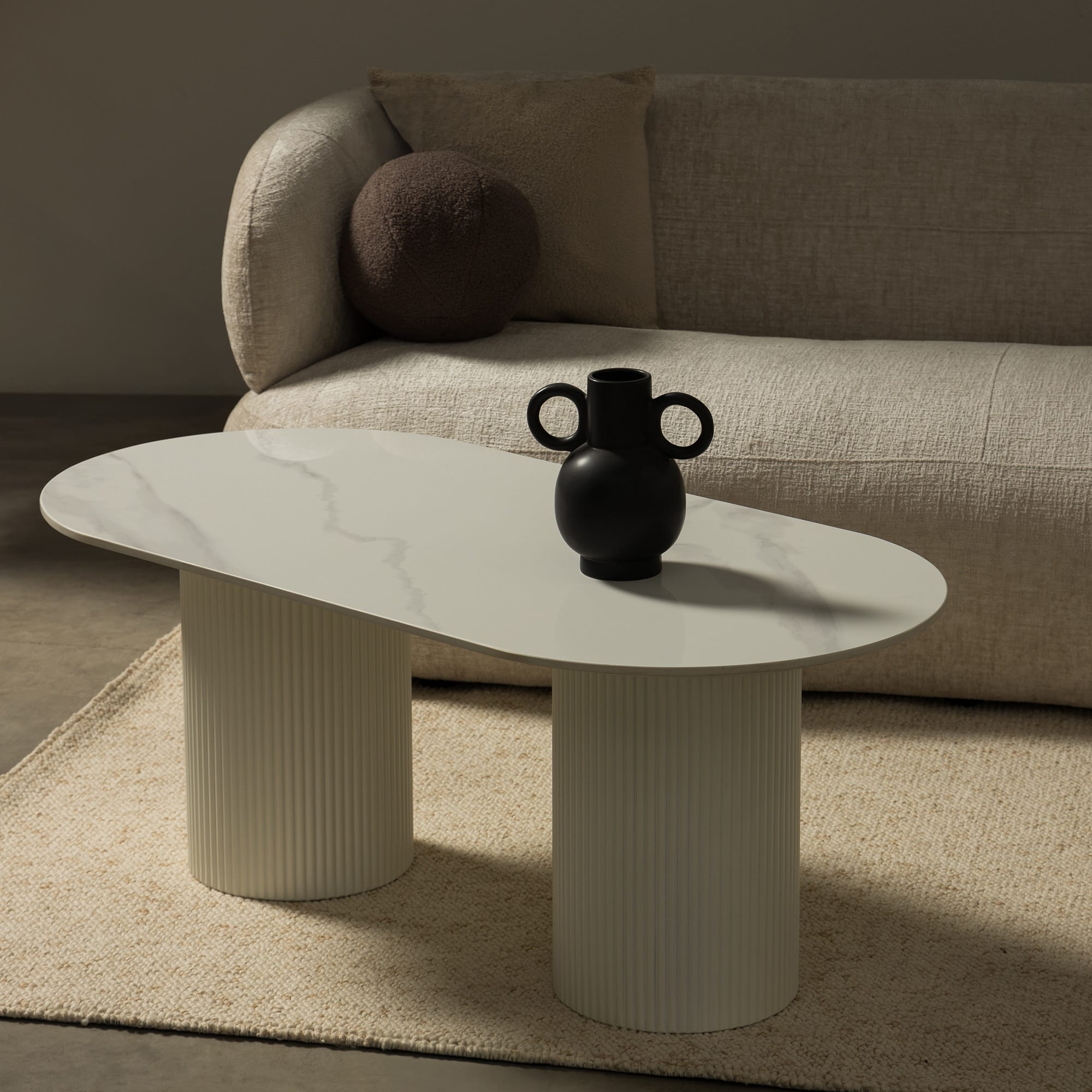 Apulia kavos staliukas – marmuro efektas, šviesos žaismas ir lamelėmis dekoruotos linijos, kurios suteikia interjerui modernios prabangos pojūtį.