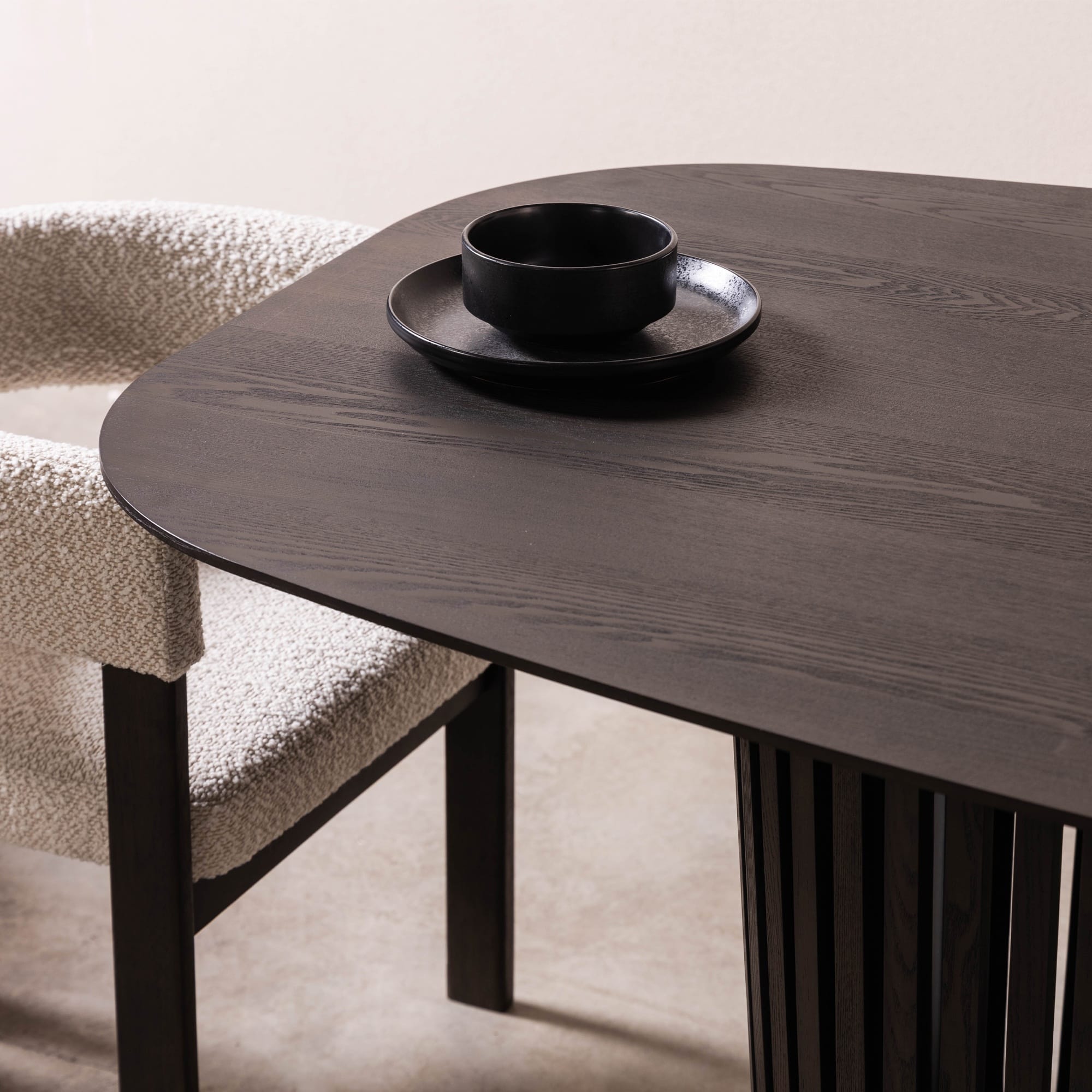 Stalas pagamintas iš baldinės plokštės, dengtos uosio faneruote. Paviršius išlaiko natūralų medienos pojūtį, kartu leidžiant išgauti sodrų juodą atspalvį be dirbtinumo.