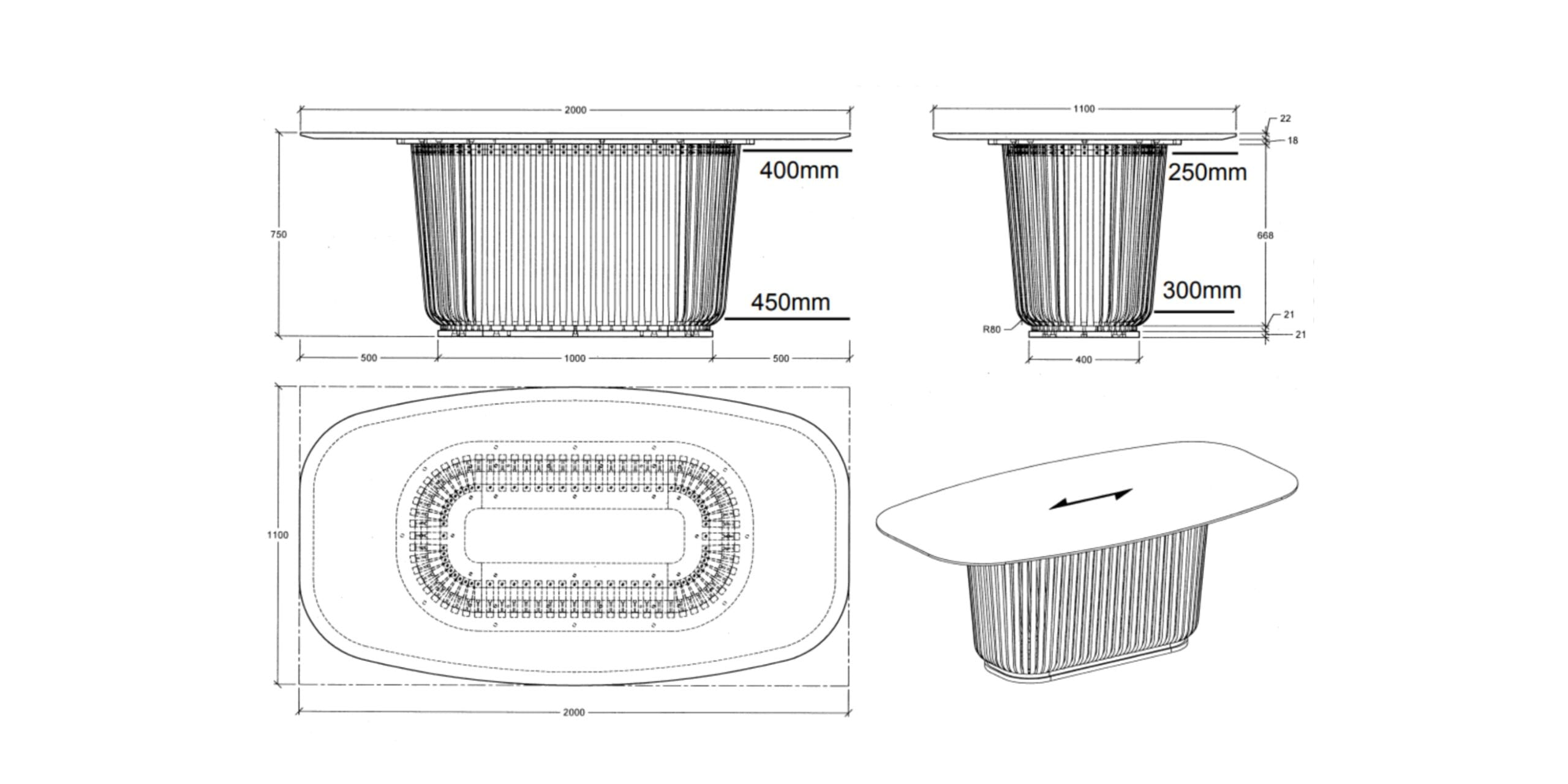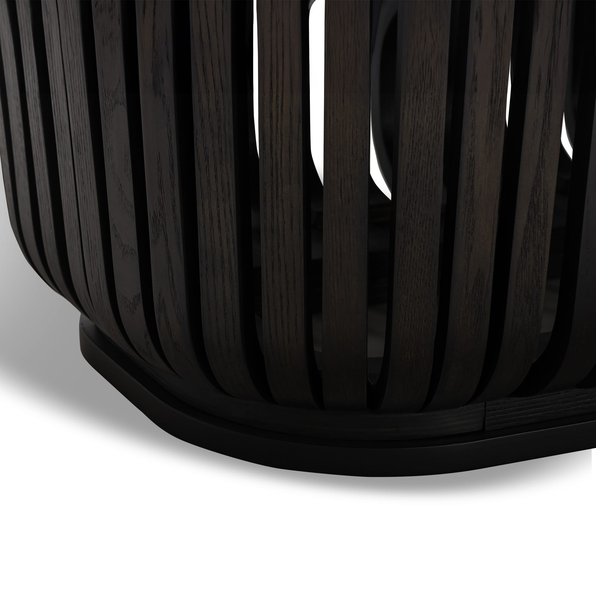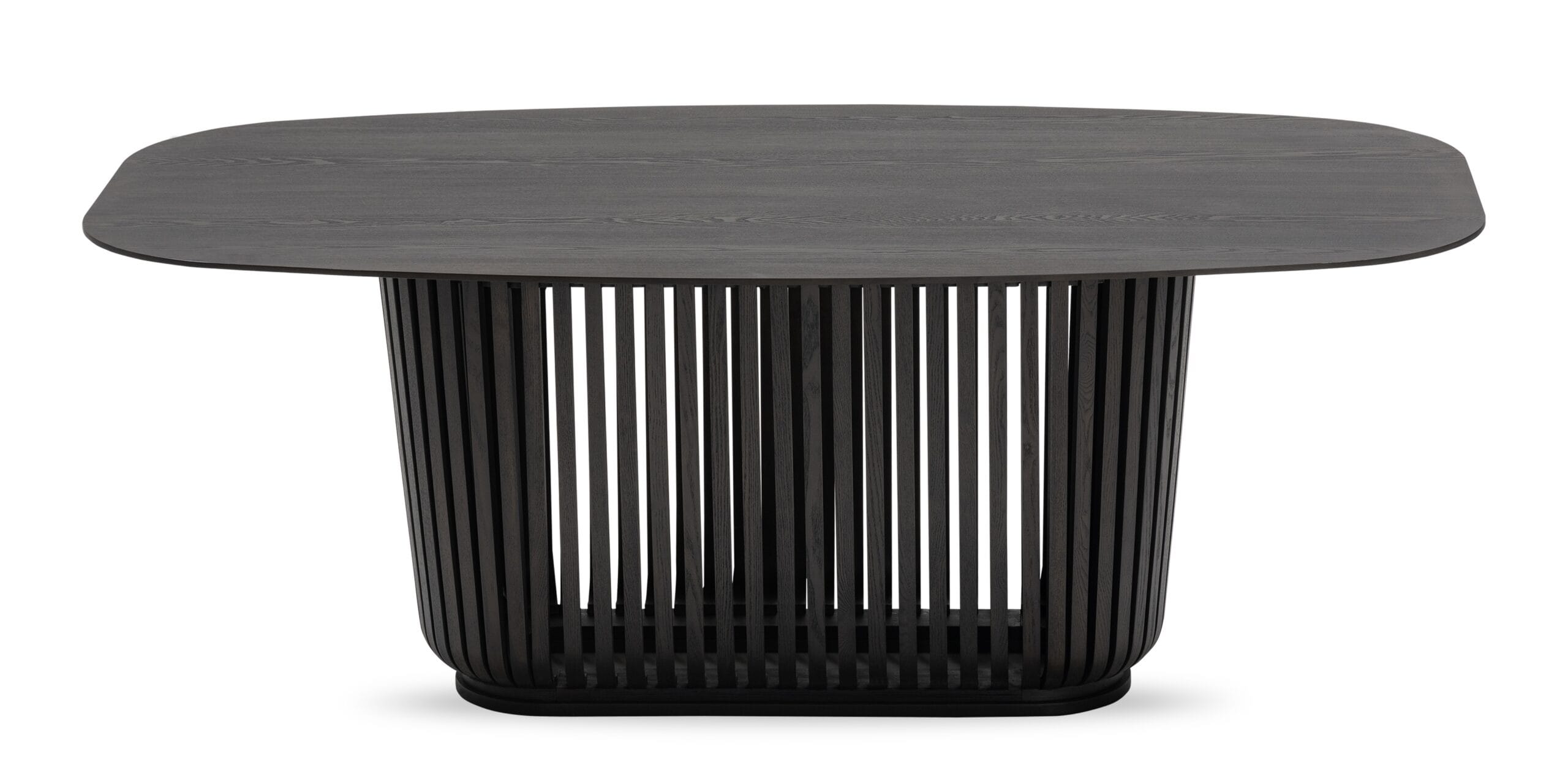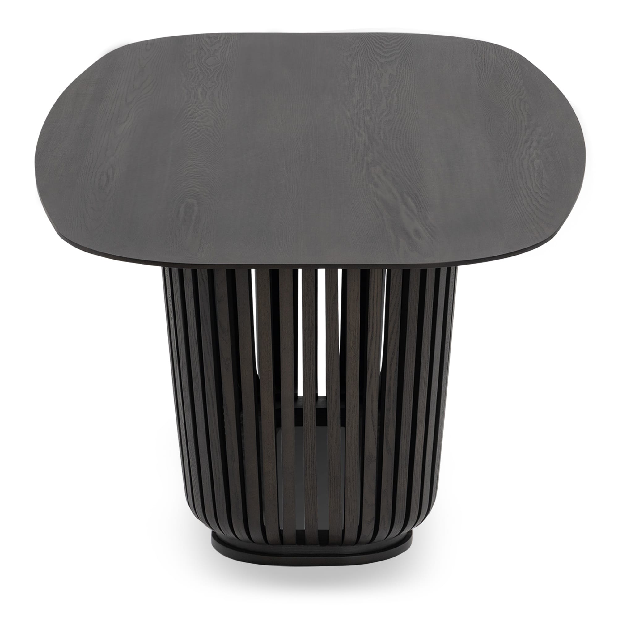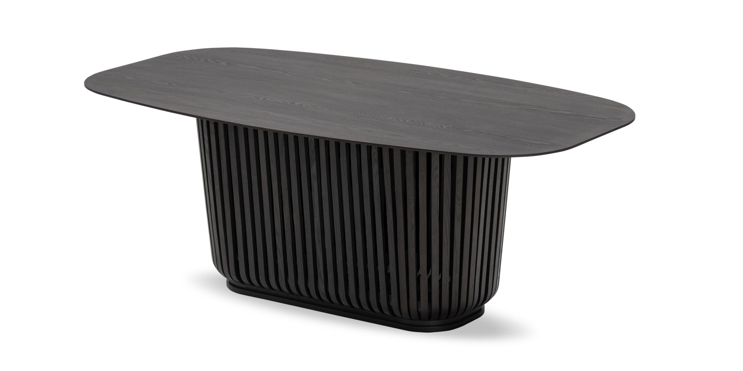 Pagrindas dekoruotas vertikaliomis lamelėmis, kurios suteikia stalui architektūrinio ritmo ir gylio. Šis sprendimas leidžia stalui atrodyti skulptūriškai, bet neperkrautai. Konstrukcija vizualiai tvirta ir subalansuota.