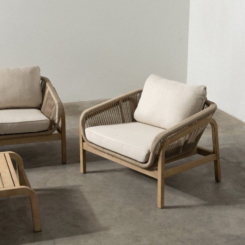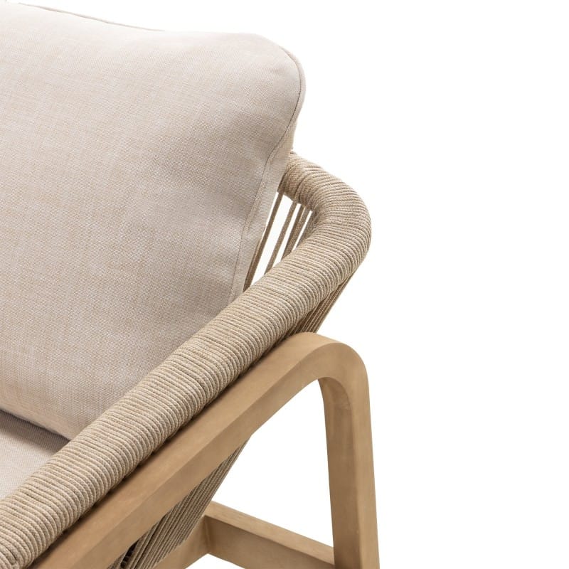 Sėdynė, atlošas ir porankiai suformuoti iš pintos virvelės, kuri suteikia konstrukcijai lengvumo ir aiškų vizualinį identitetą.