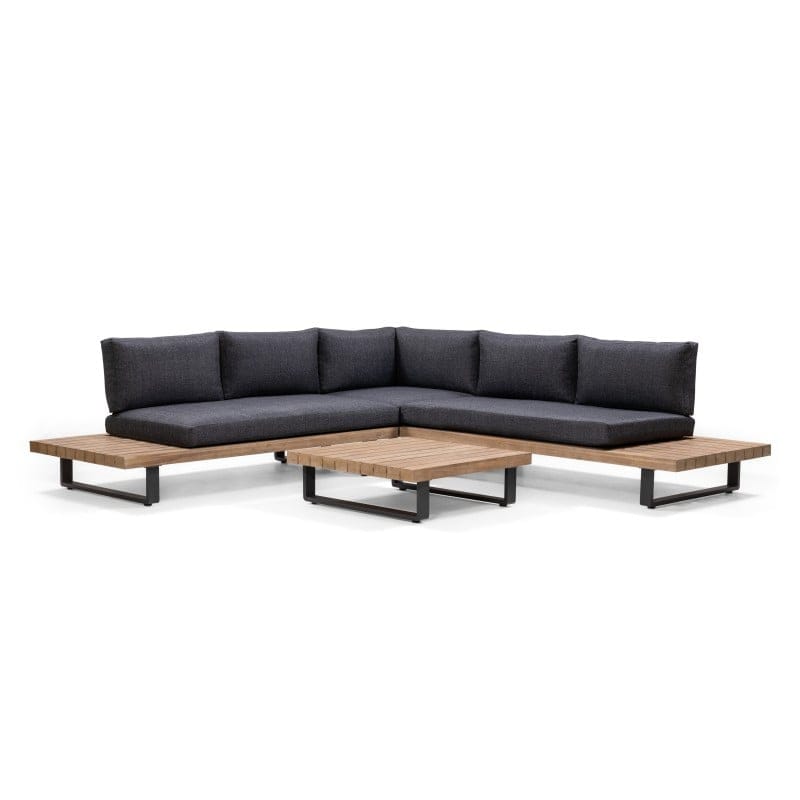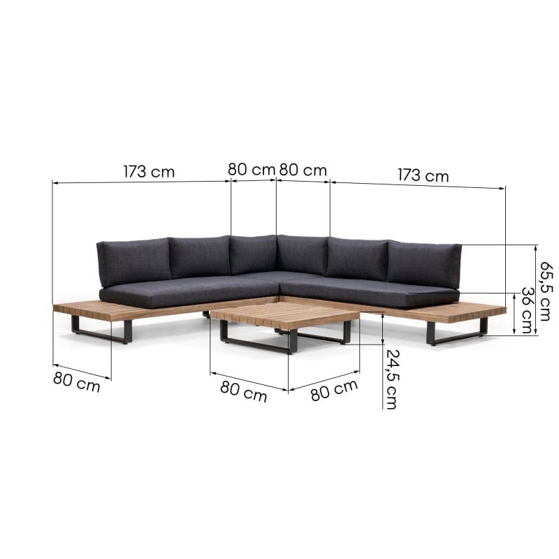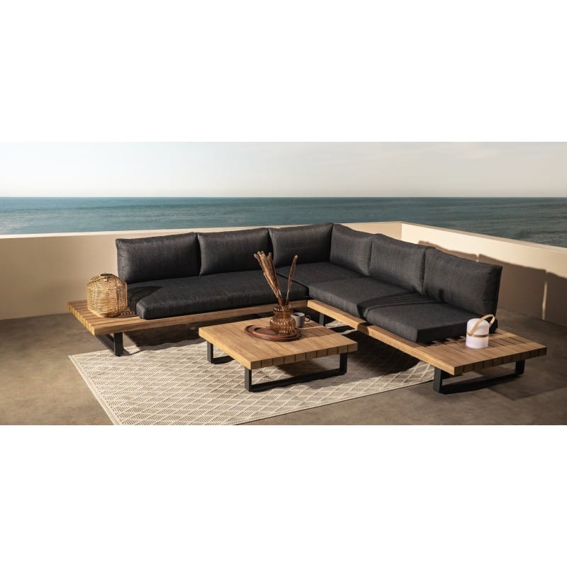 Borgo Dark lauko baldų komplektas išsiskiria aiškia forma, tvirta konstrukcija ir apgalvotu funkcionalumu, kuris leidžia sukurti vientisą terasos poilsio zoną. Kampinė sofa su integruotais elementais atrodo stabiliai ir proporcingai, todėl erdvė iš karto įgauna struktūrą.