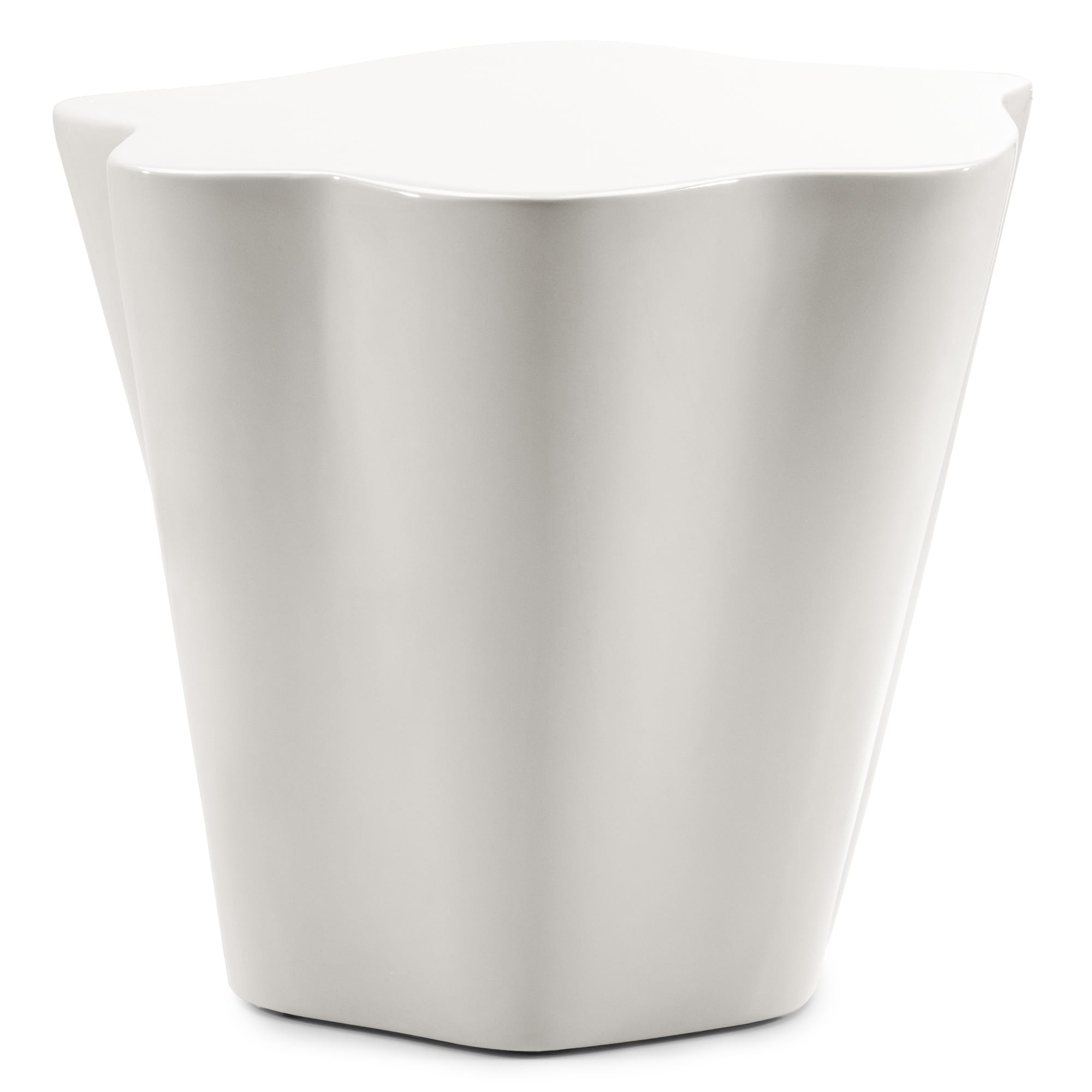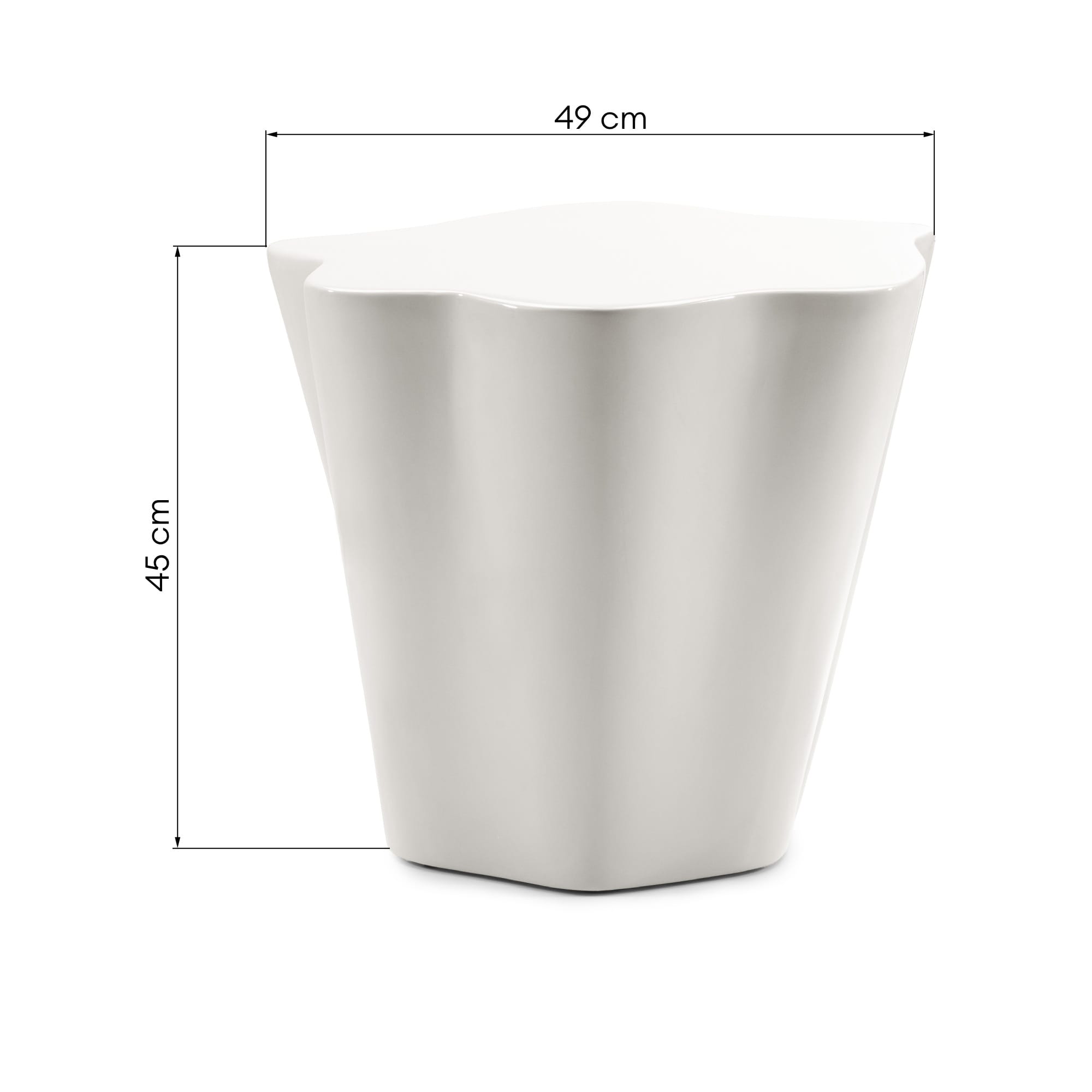 Staliukas pagamintas iš magnio oksido – patvarios ir stabilios medžiagos, dažnai pasirenkamos skulptūriškiems interjero objektams. Ši medžiaga suteikia baldui masyvumo pojūtį, tačiau išlaiko švarią, vientisą išvaizdą. Blizgi apdaila sustiprina paviršiaus gylį ir subtiliai reaguoja į natūralią bei dirbtinę šviesą.
