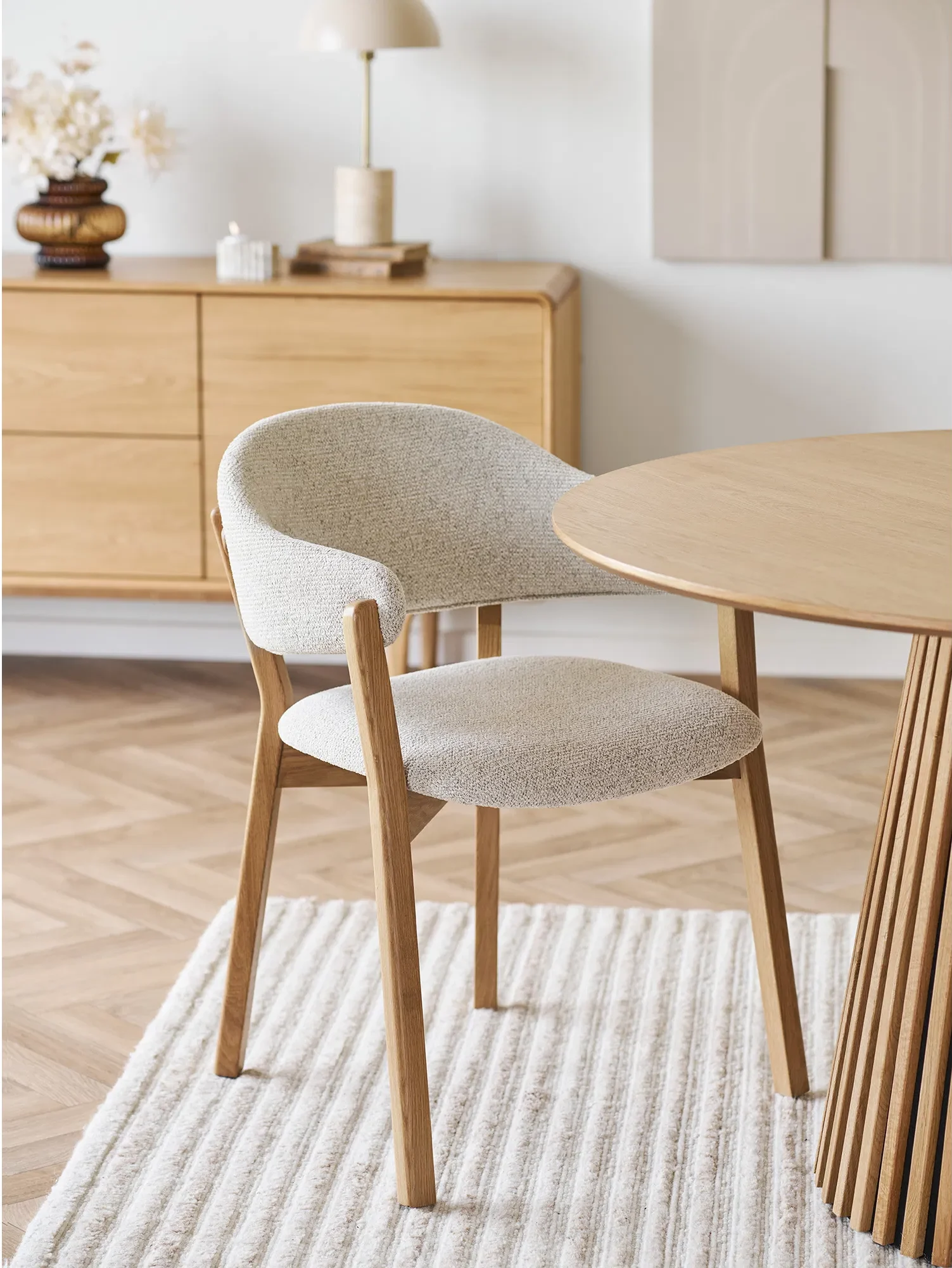 Dunkirk Comfort valgomojo kėdė geriausiai dera su natūralaus medžio, cream, smėlio ir soft grey tonais. Ji puikiai atrodo prie ąžuolo, tamsesnio medžio ar akmens paviršiaus stalų, o interjerą galima papildyti tekstiliniais kilimais, minimalistiniais šviestuvais ir subtiliais dekoratyviniais akcentais. Stilistiškai kėdė tinka japandi, moderniam minimalizmui ir šiuolaikiškai elegancijai.