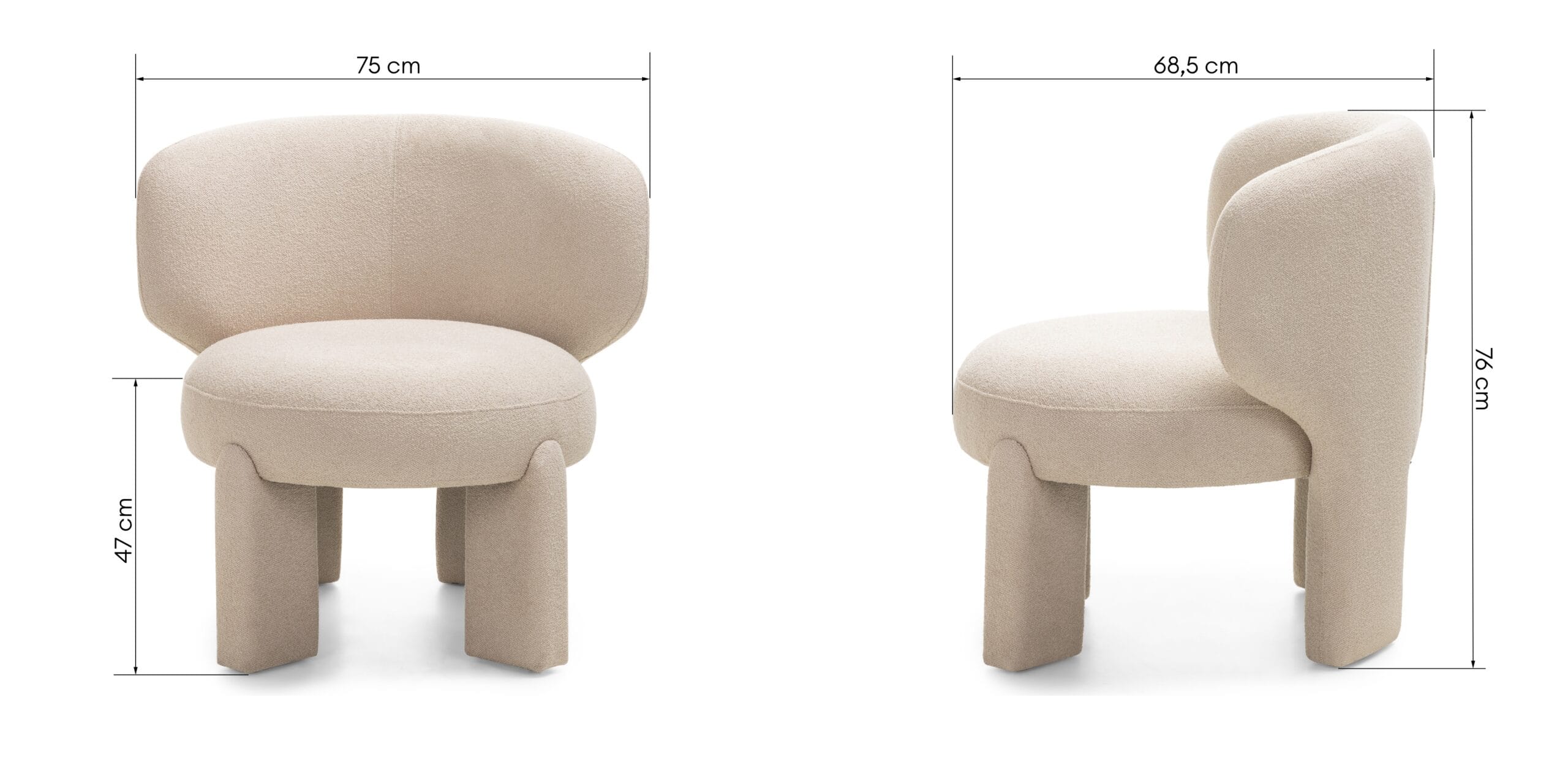 Elaine Beige Boucle – tai fotelis, kuris nekonkuruoja su erdve. Jis joje lieka.