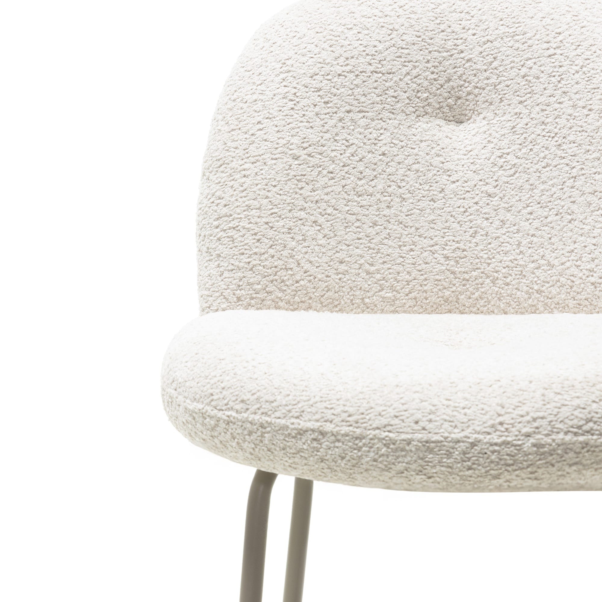 Minkštas, švelnus audinys ne tik malonus liesti, bet ir vizualiai šildo erdvę. Minkštas paminkštinimas prisitaiko prie kūno formų, todėl net ilgesnis sėdėjimas tampa malonus. Apvalus atlošas švelniai apgaubia nugarą, o metalinis pagrindas, padengtas šviesaus smėlio tonu, užtikrina tvirtumą ir vizualinį vientisumą.