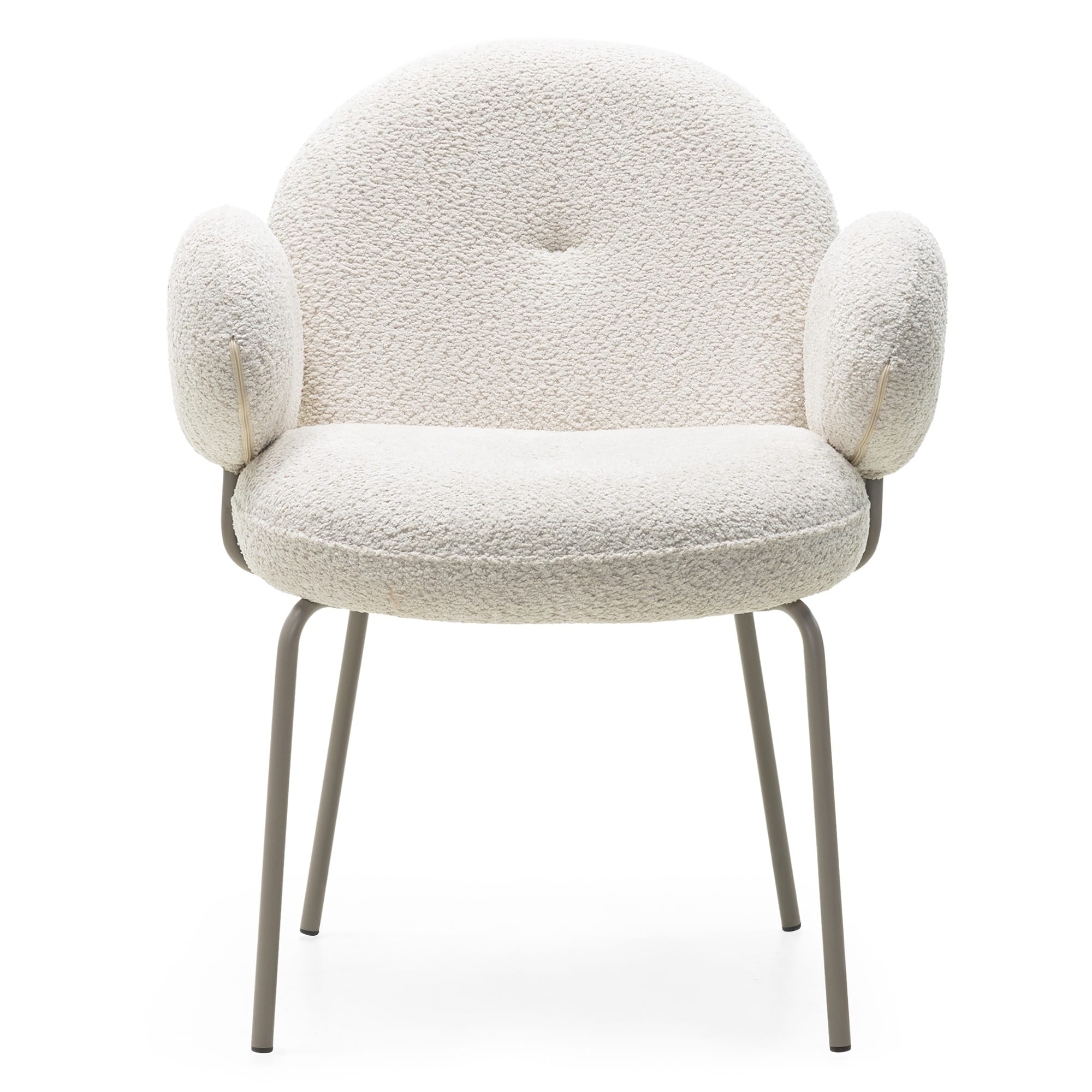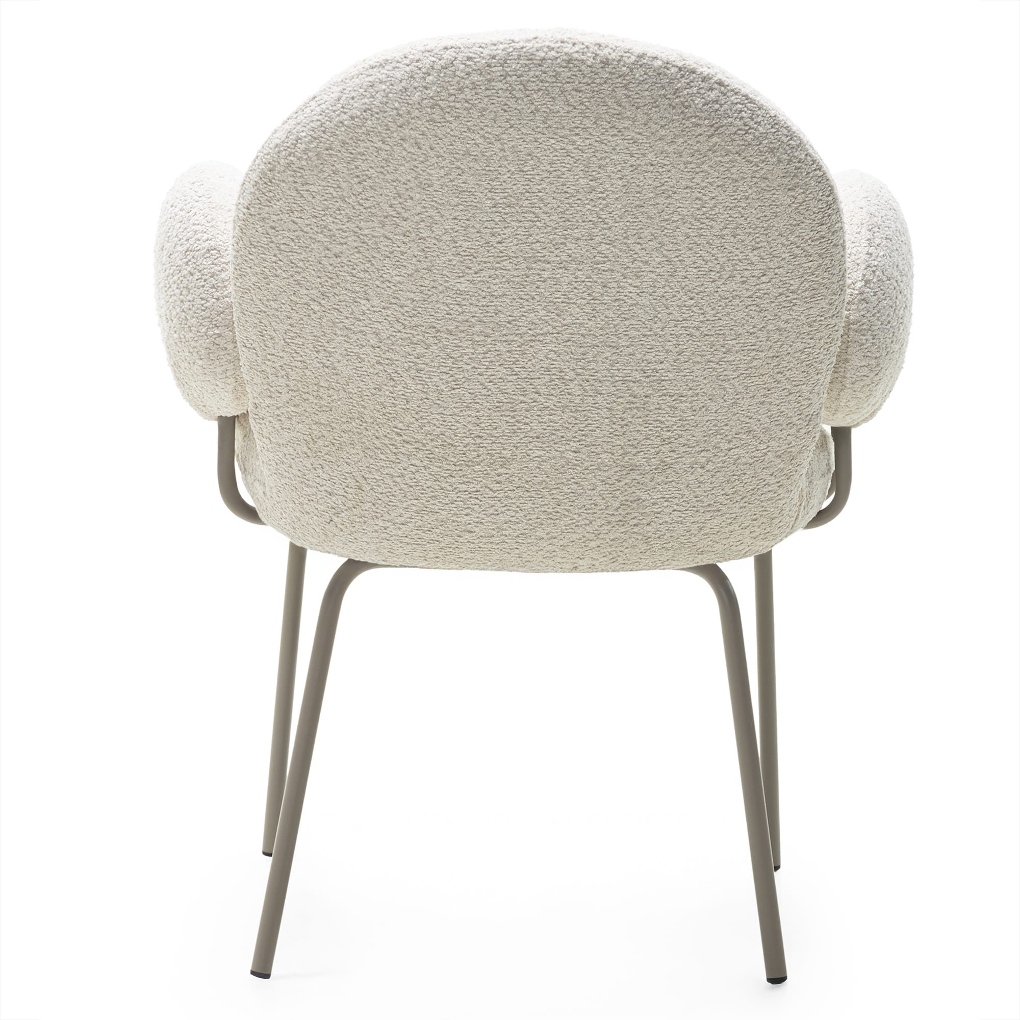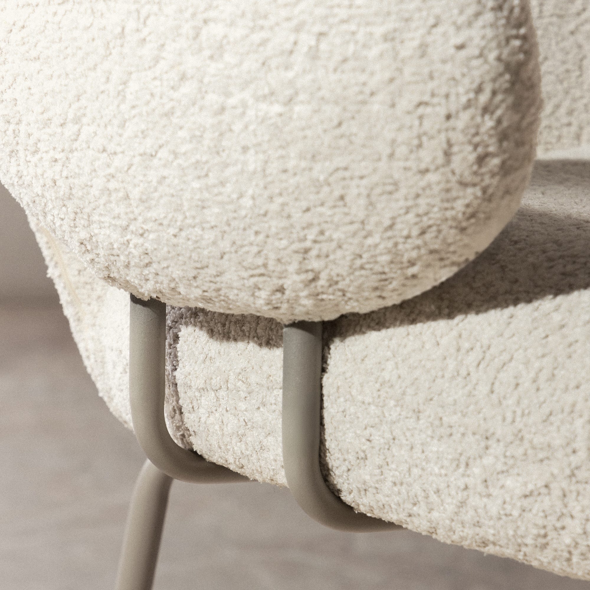 Fiori Beige Bouclé krėslas – tai šiuolaikinio komforto manifestas, kuriame kiekviena detalė apgalvota: nuo atlošo kreivės iki audinio faktūros.