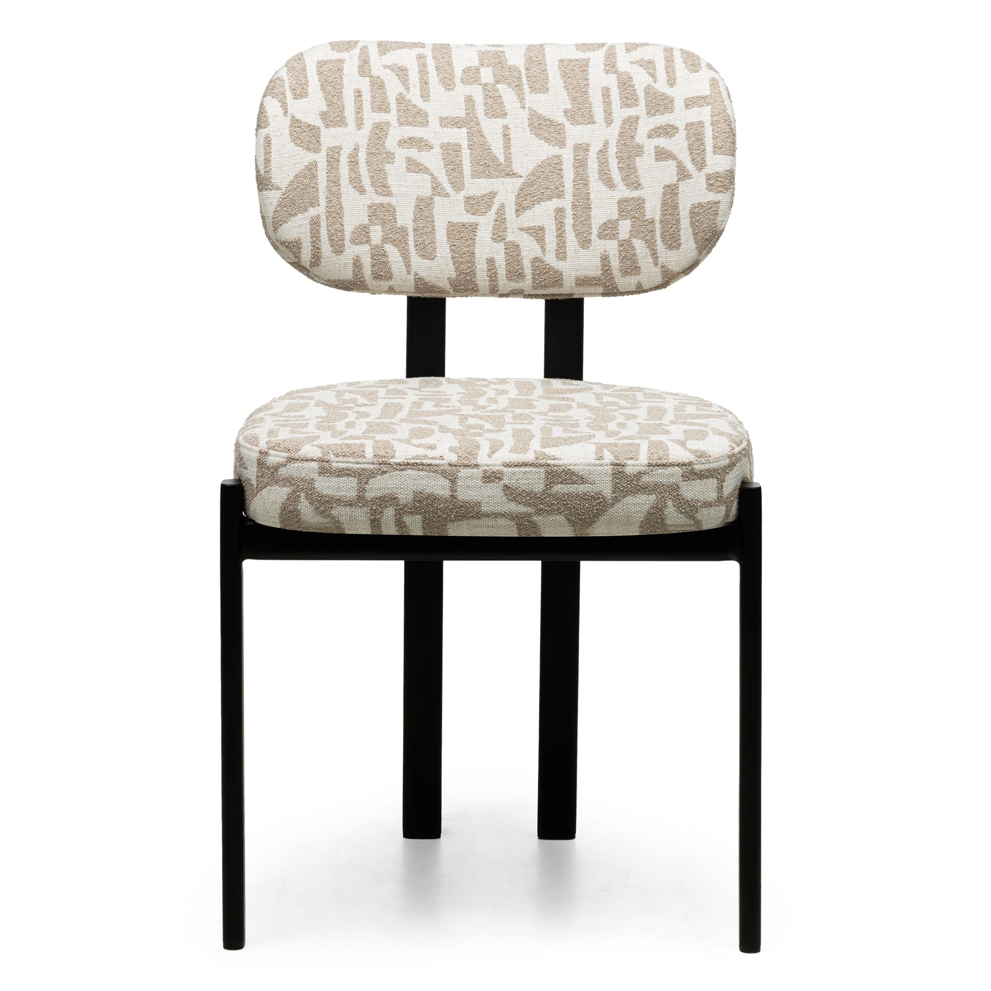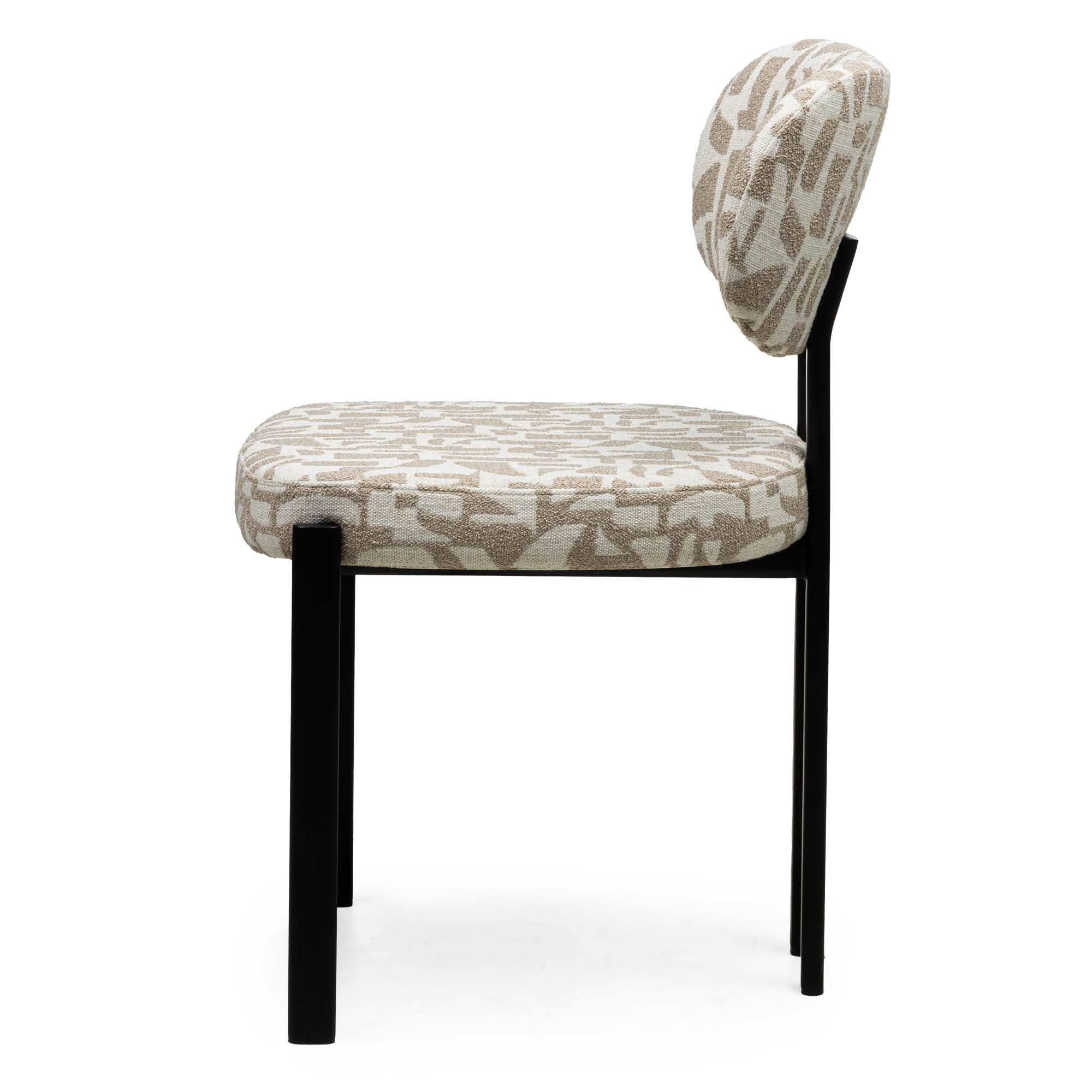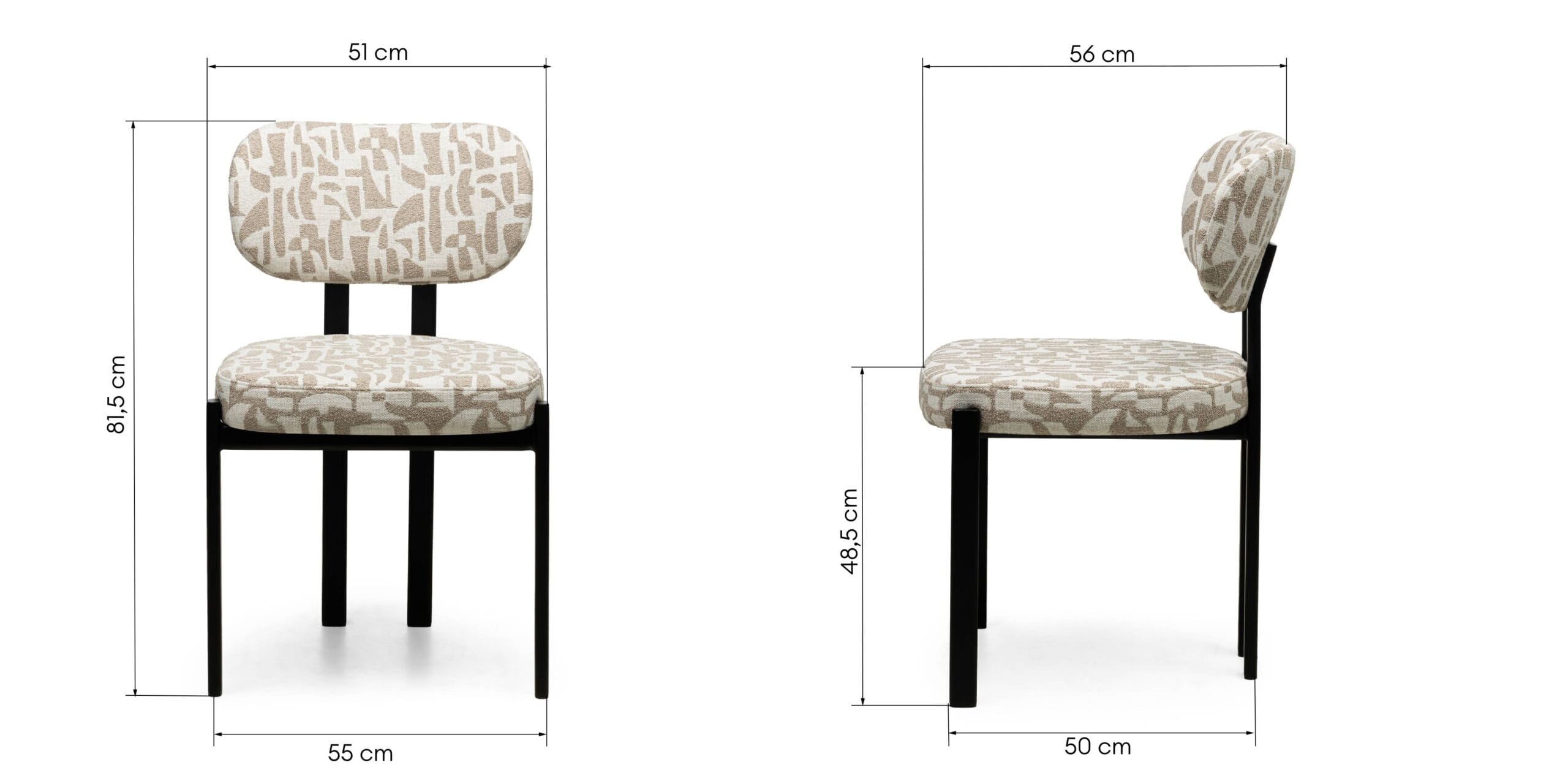Geometrinis smėlio ir kreminės spalvos audinys kuria subtilų raštą, kuris išryškėja tik priėjus arčiau. Spalvos ramios, šiltos, lengvai derinamos su natūraliais paviršiais, medžiu ar minimalistinėmis formomis. Kontūruotas atlošas ir sėdynė su švelniu paminkštinimu palaiko kūną ir leidžia patogiai sėdėti ilgiau, nesukuriant masyvumo pojūčio. Juodos spalvos, milteliniu būdu dažyta metalinė konstrukcija suteikia stabilumo ir aiškią vizualinę bazę.