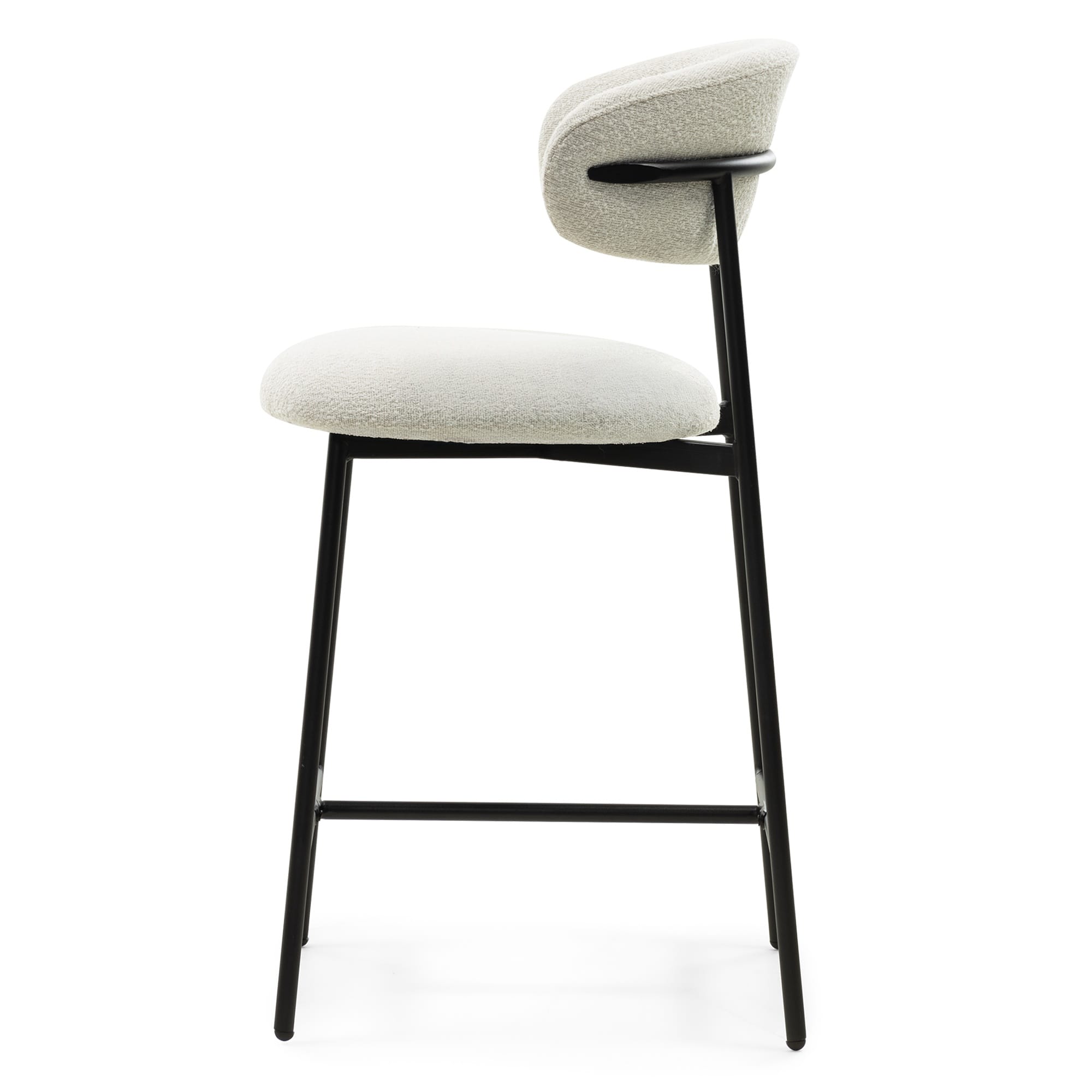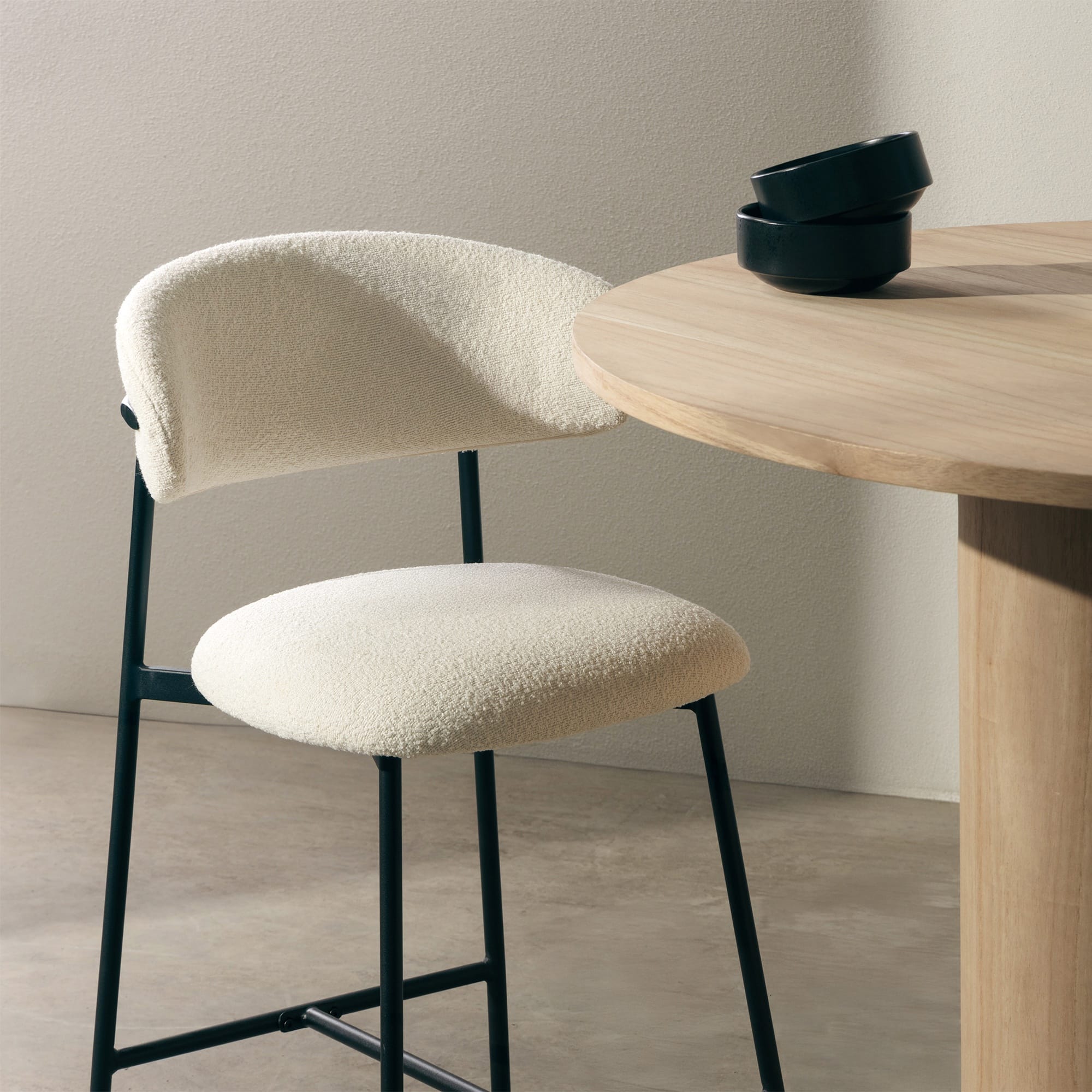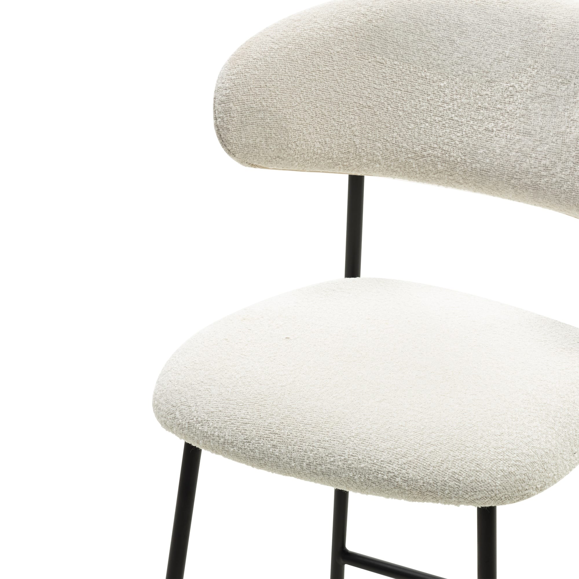 Fresno baro kėdė – šviesaus bouclé audinio ir juodo metalo kontrastas, kuris suteikia interjerui modernumo ir elegantiško balanso pojūtį.
