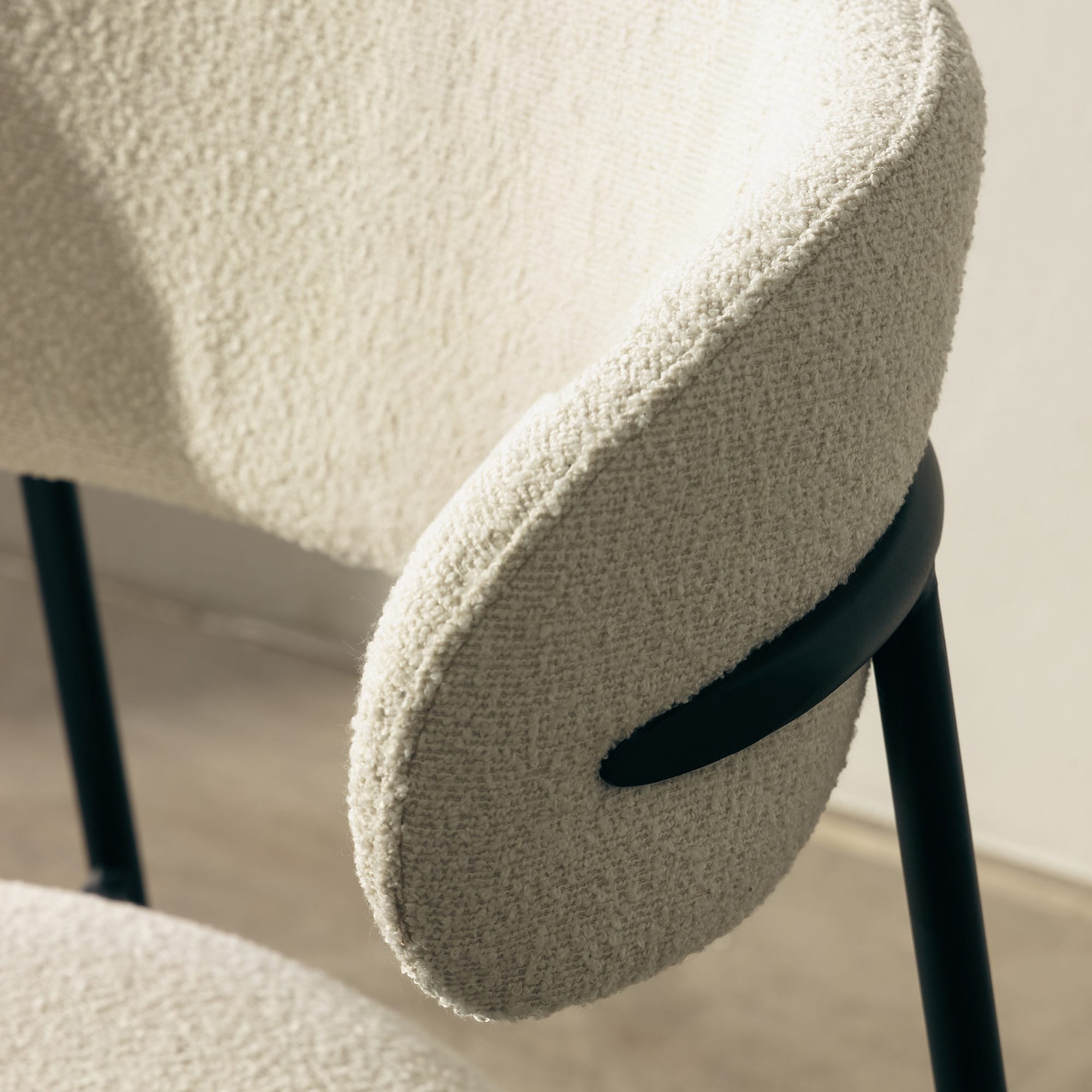 Šviesus, kreminis bouclé audinys ir juodo metalo konstrukcija sukuria modernų, vizualiai įtraukiantį balansą – minkštumo ir tvirtumo, jaukumo ir struktūros.