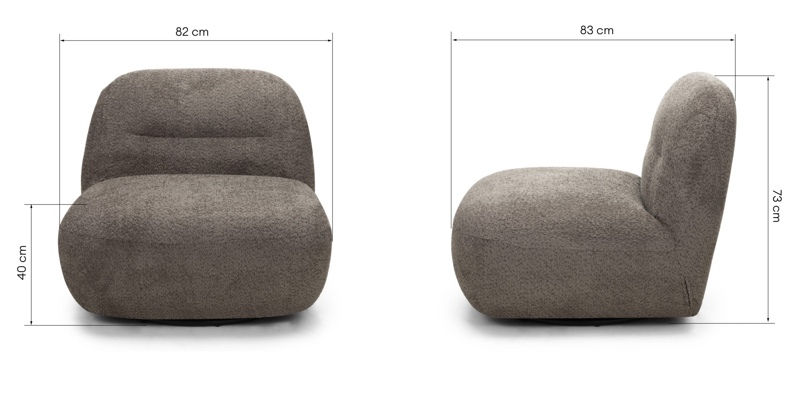 Giorgia fotelis – rudai pilkas švelnumas, apvalios formos ir laisvo judesio komfortas, kuris kuria modernų jaukumo pojūtį tavo interjere.