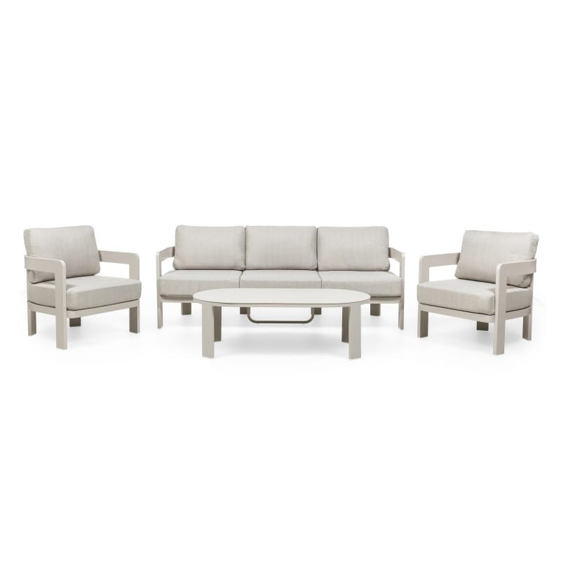 Komplektą sudaro trivietė sofa, du foteliai ir ovalus stalas, sujungti viena idėja – minkštos, apvalios linijos.