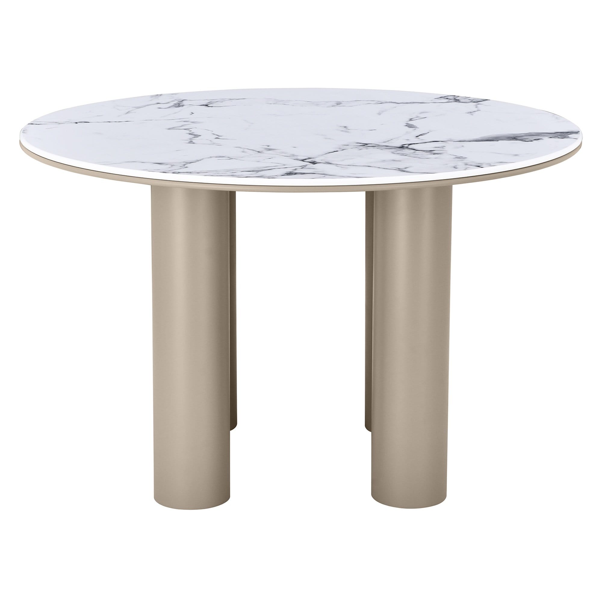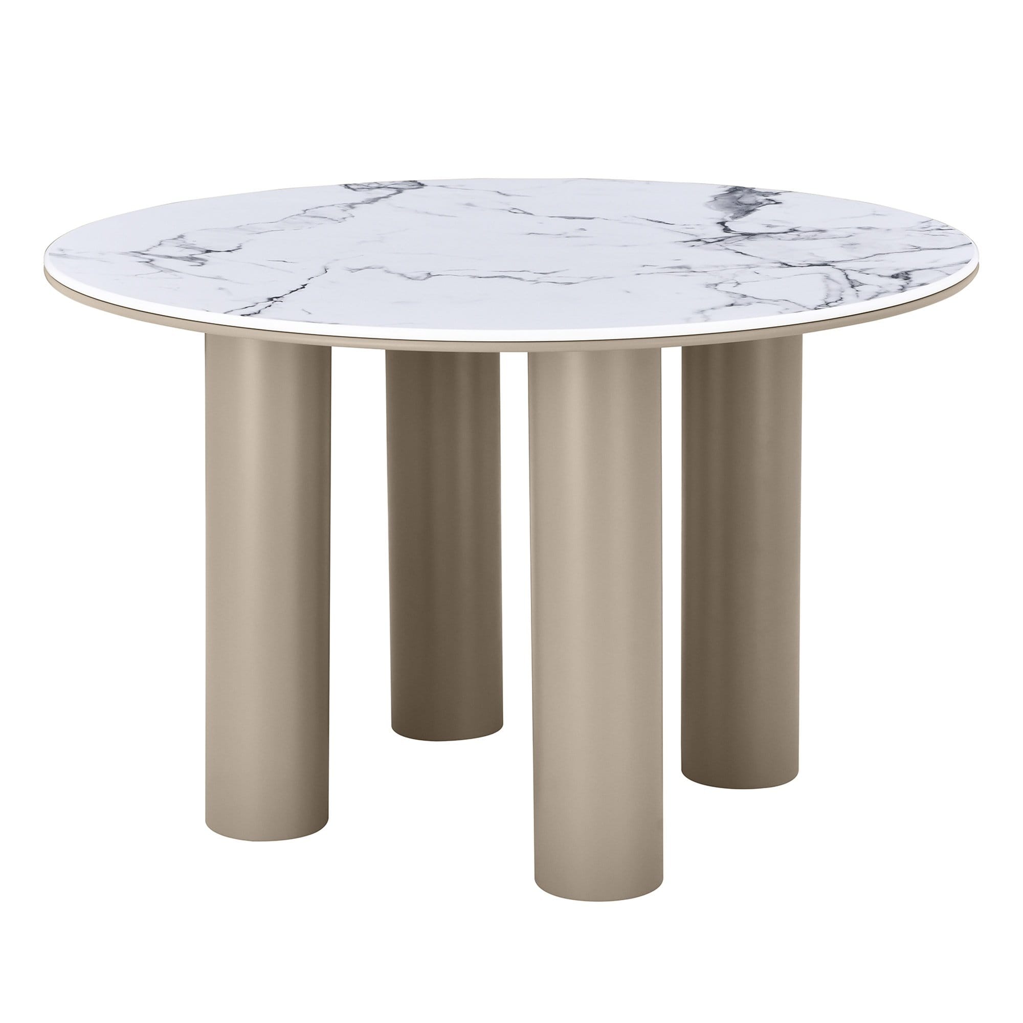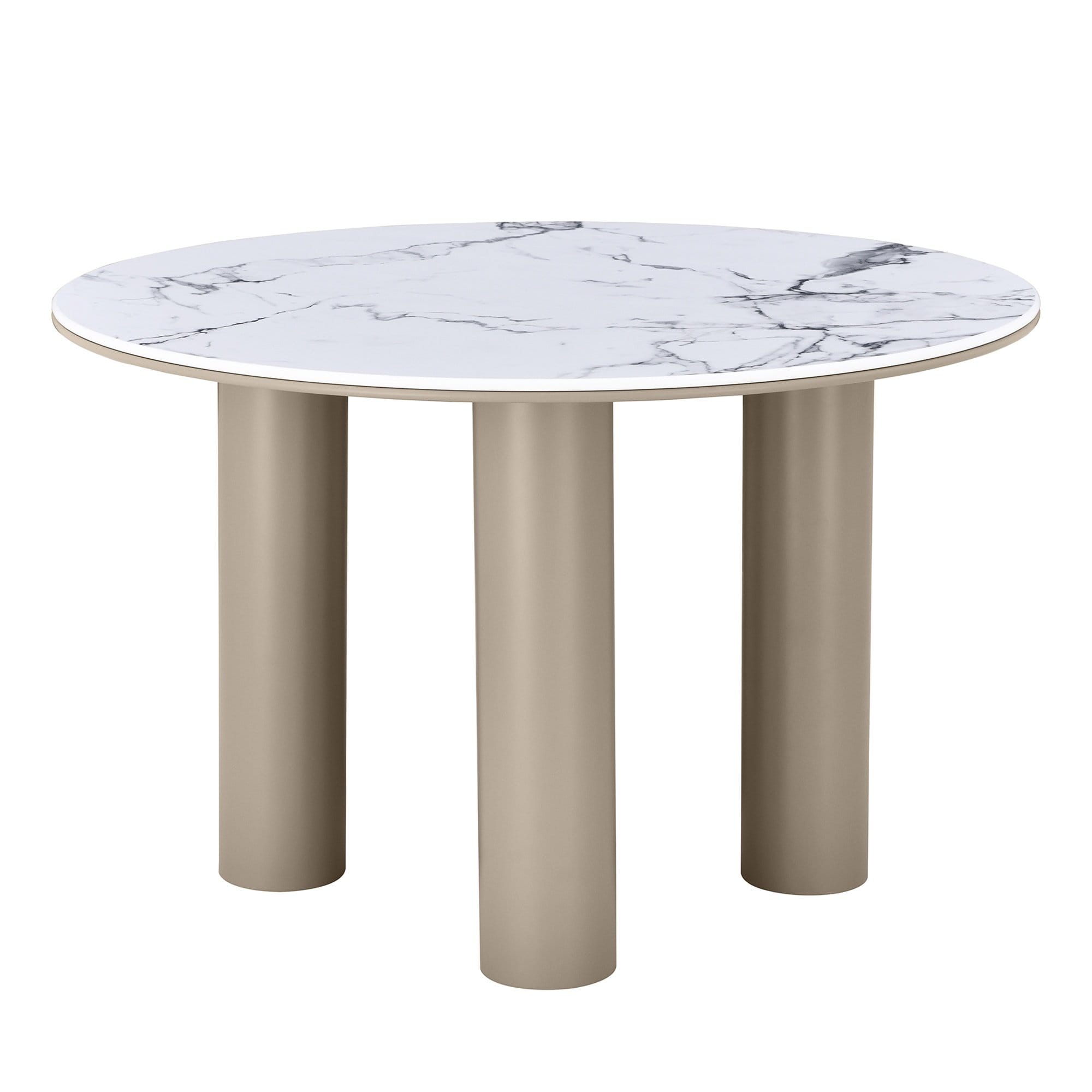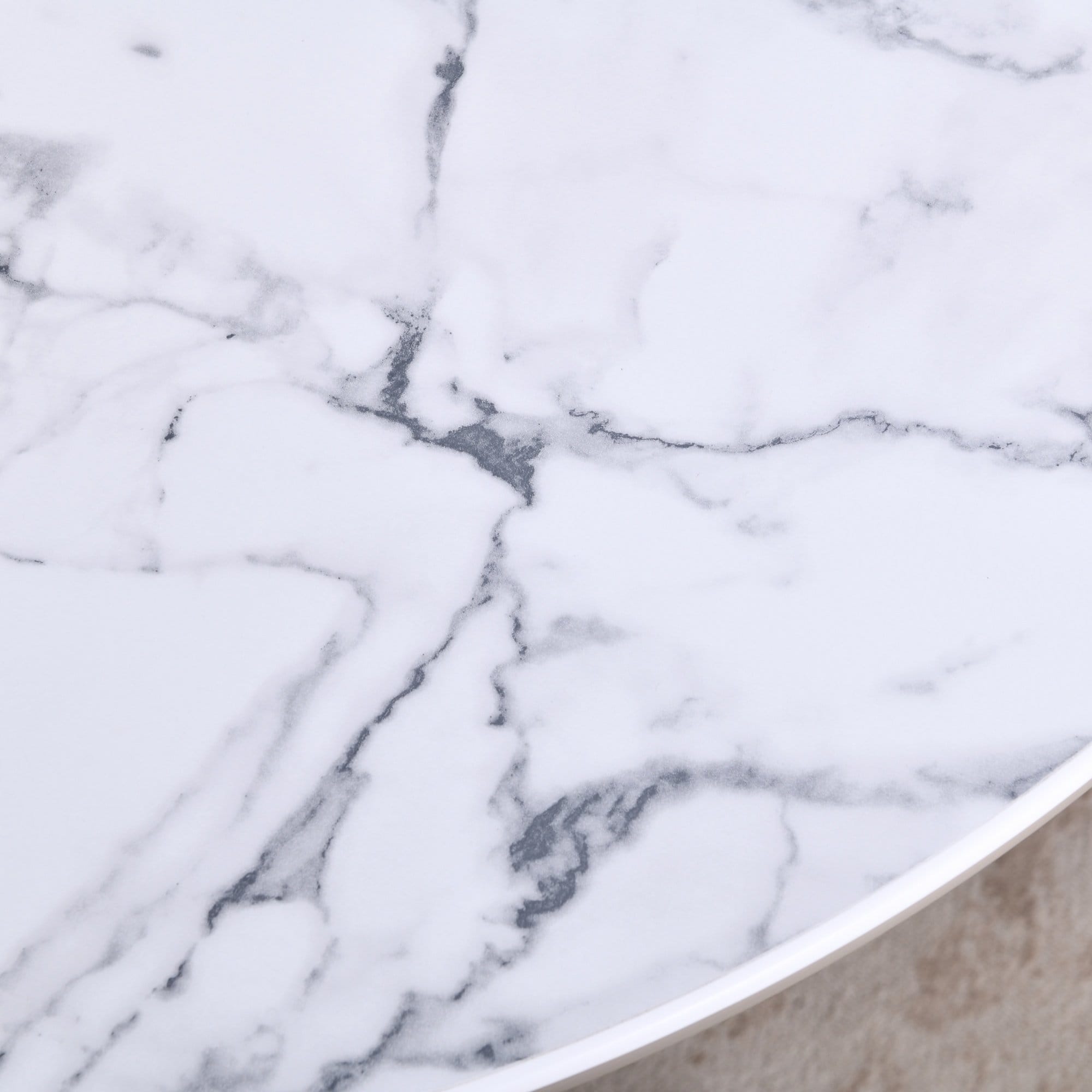 Kairo marmurinis valgomojo stalas – tai šiuolaikinės elegancijos simbolis, kuriame subtilus dizainas dera su praktišku funkcionalumu. Jo apvalus balto marmuro dekoruotas stalviršis, pagamintas iš melaminu dengtos MDF plokštės, sukuria rafinuotą vizualinį įspūdį ir tampa akcentu, kuris iš karto traukia žvilgsnį.