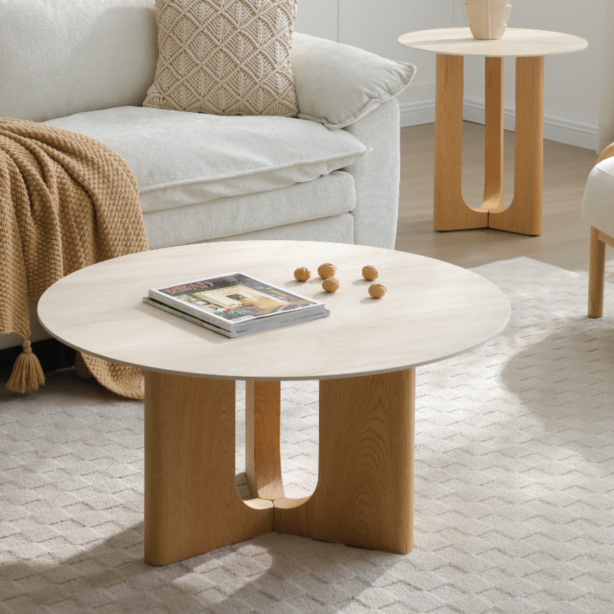 Forma apvali, vizualiai minkšta, tačiau ne atsitiktinė. Ji leidžia staliukui lengvai įsilieti tiek į minimalistines, tiek į labiau išraiškingas svetaines. Travertino imitacija suteikia gylio ir tekstūros, bet neperkrauna bendro vaizdo.