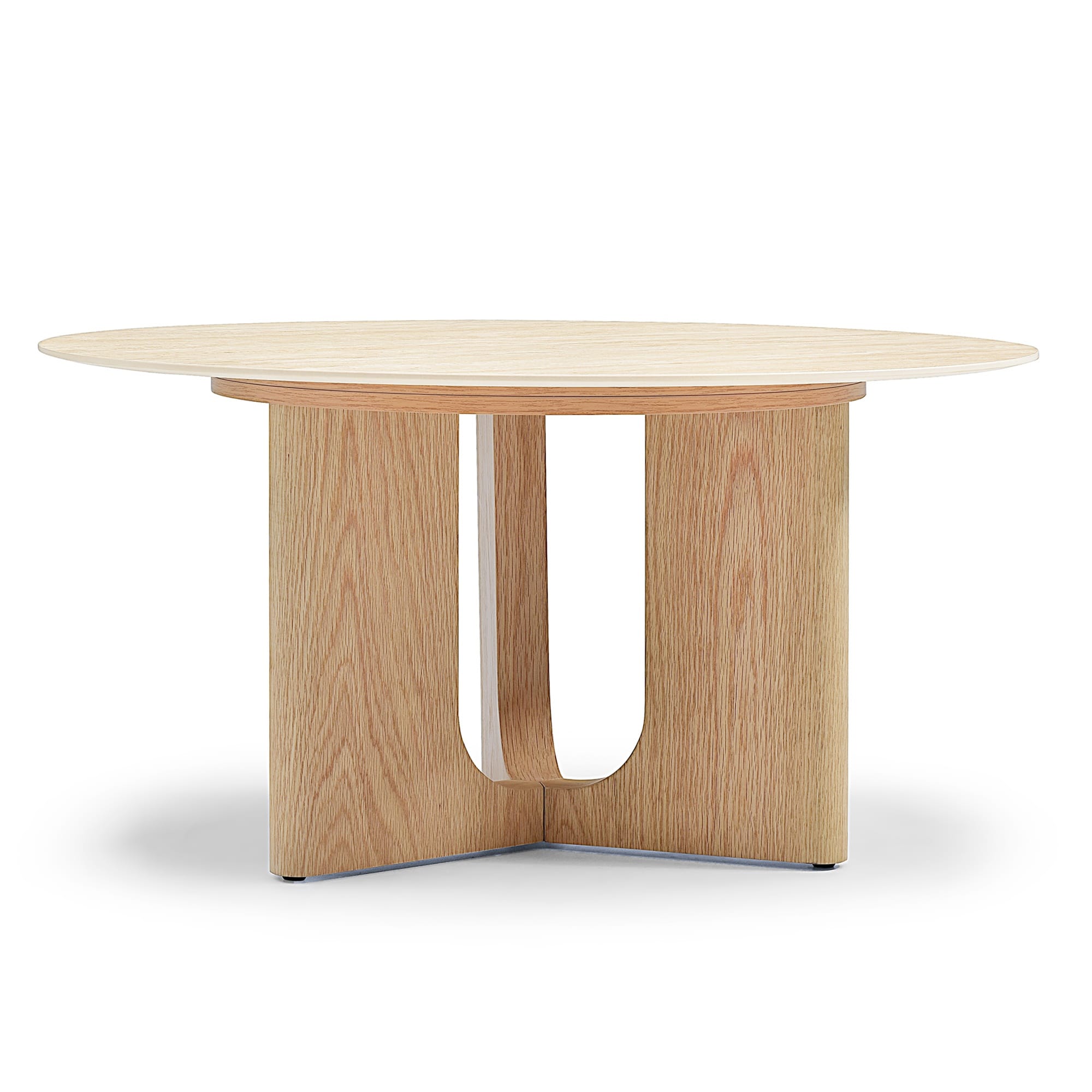 Apvalus travertino imitacijos stalviršis ir skulptūriškas ąžuolo faneruotas pagrindas. Staliukas, kuris tampa erdvės centru.