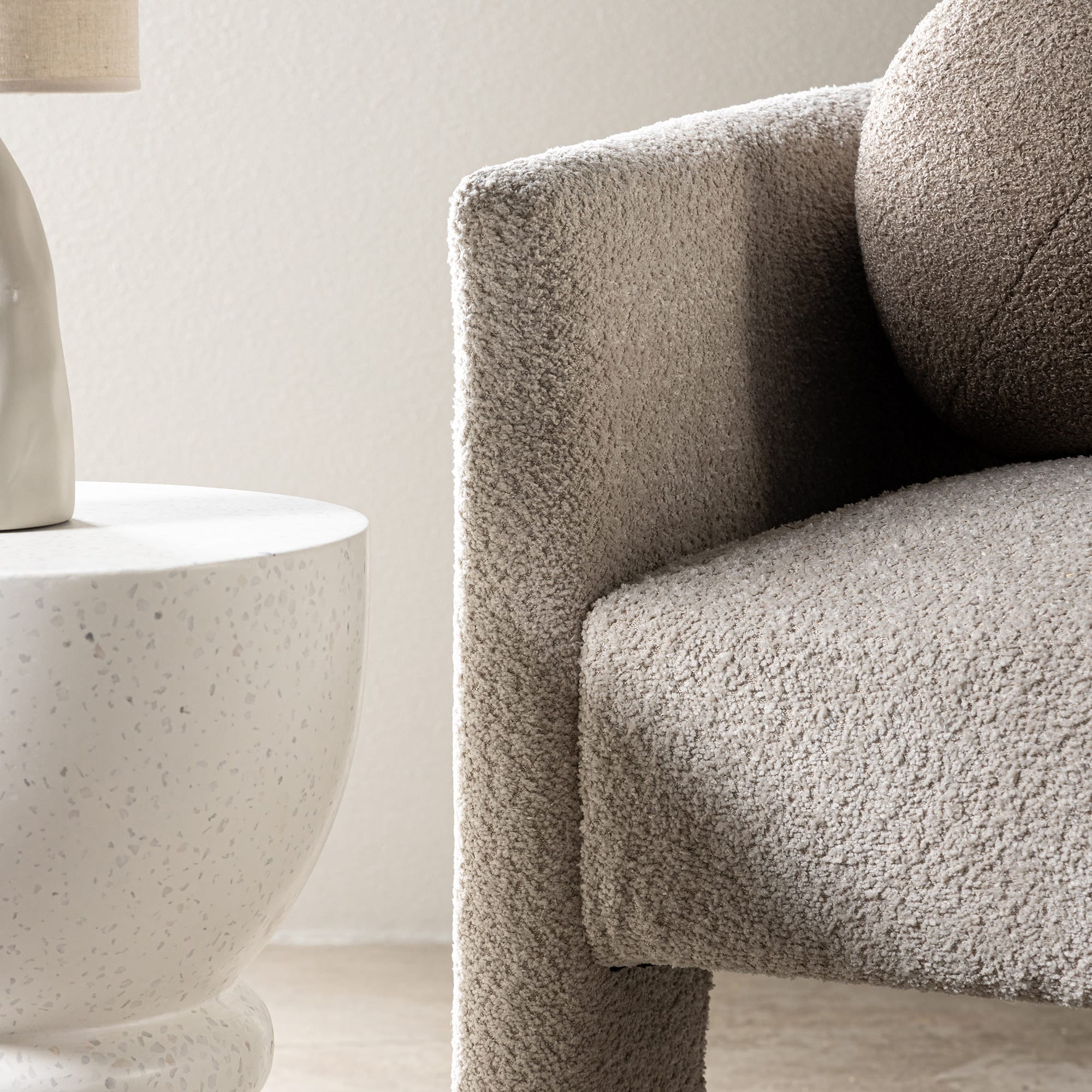 Lorraine fotelis – švelnumo ir dizaino duetas. Jo apvalios formos ir boucle audinys sukuria jausmą, tarsi kasdien patirtum ramybės akimirką.