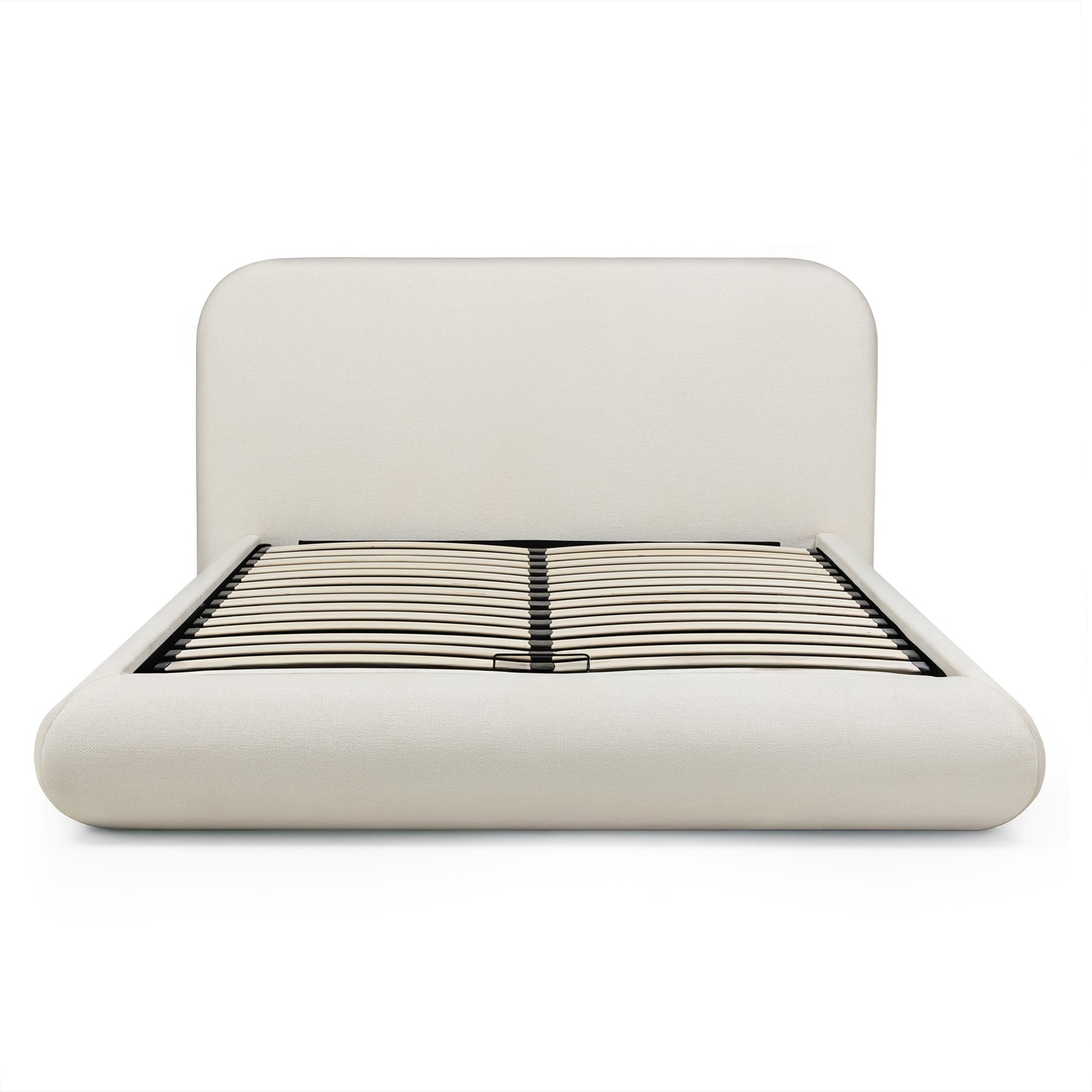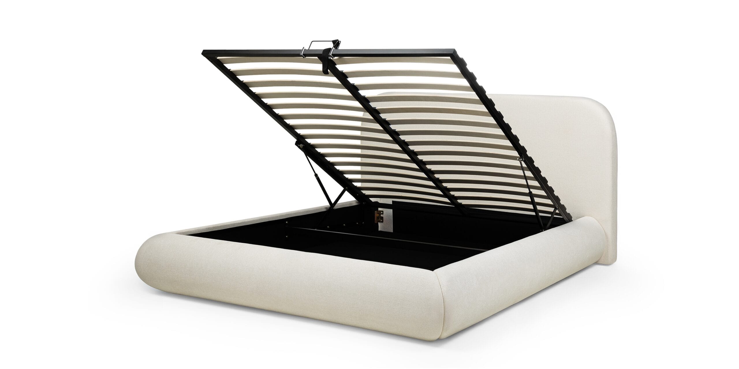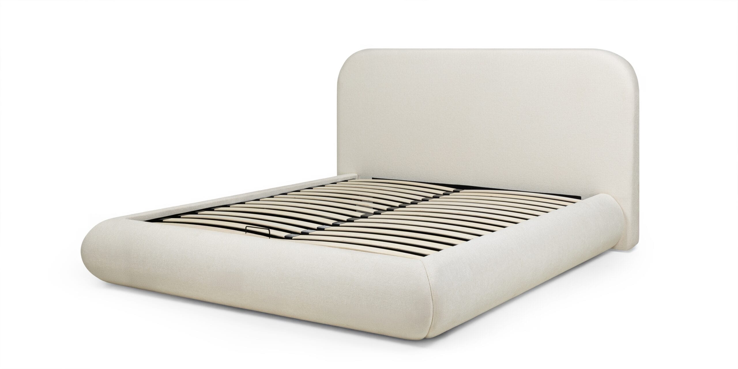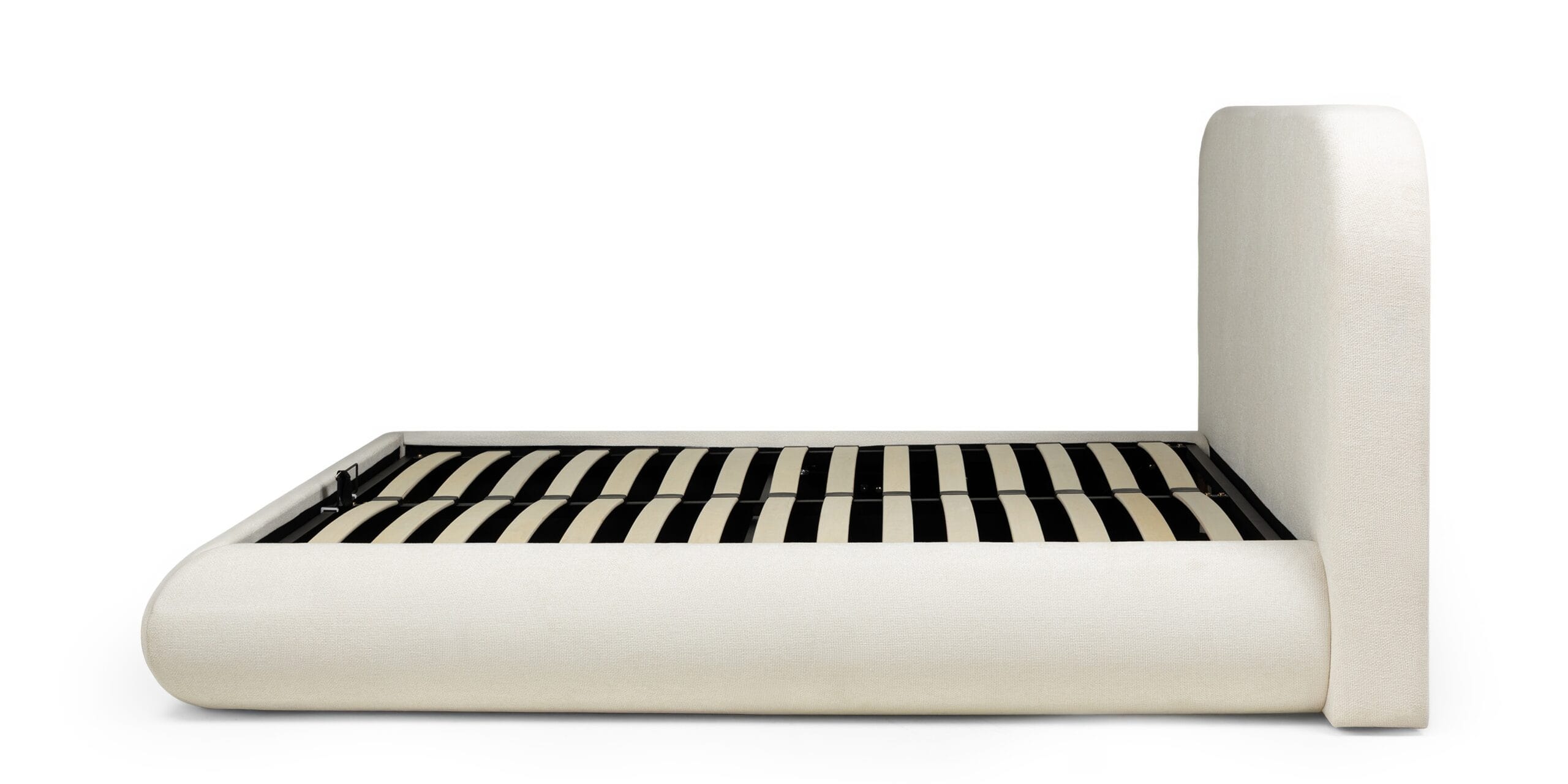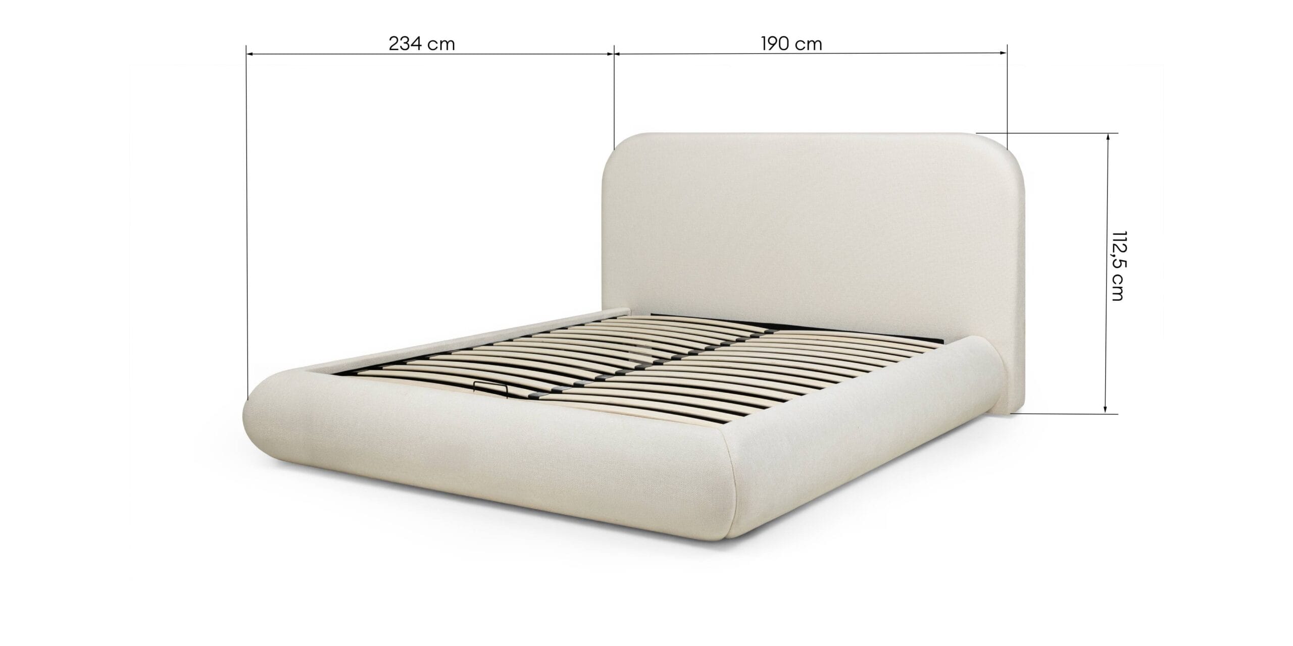 Minkšto audinio apmušalai, apvalus galvūgalis ir paslėpta patalynės dėžė. Lova, kuri sujungia dizainą ir praktiškumą.