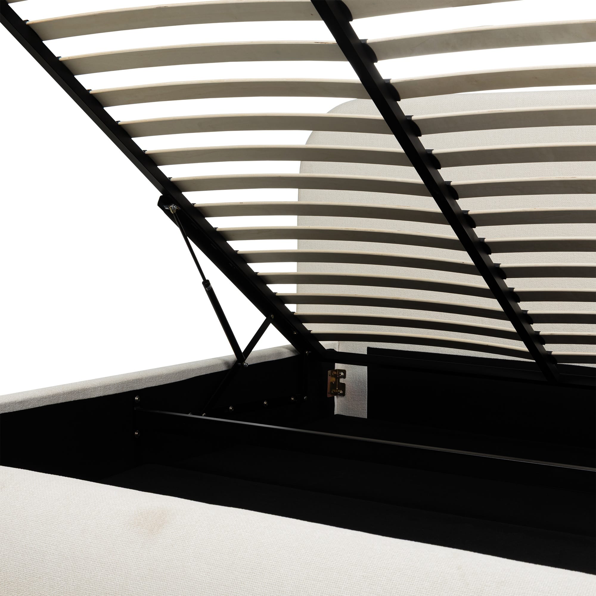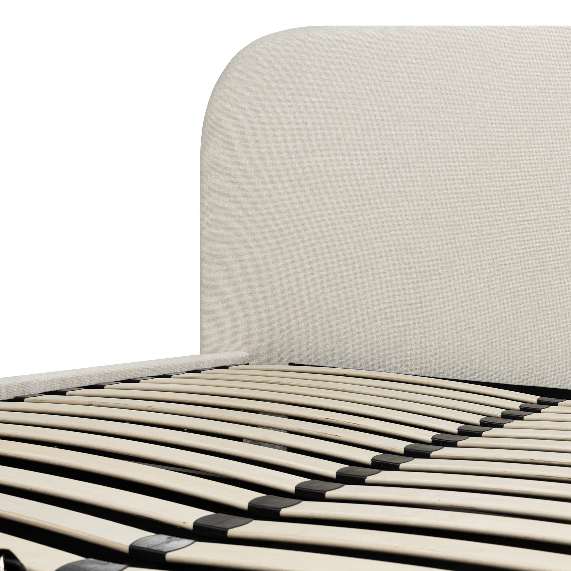 Šviesiai smėlio spalvos minkšto audinio apmušalai leidžia lovai atrodyti lengvai ir neutraliai. Spalva prisitaiko prie skirtingų interjero sprendimų ir nesukuria vizualinės įtampos. Tai pasirinkimas, kuris leidžia keisti tekstilę, sienų spalvas ar dekorą, nekeičiant pagrindinio baldo.