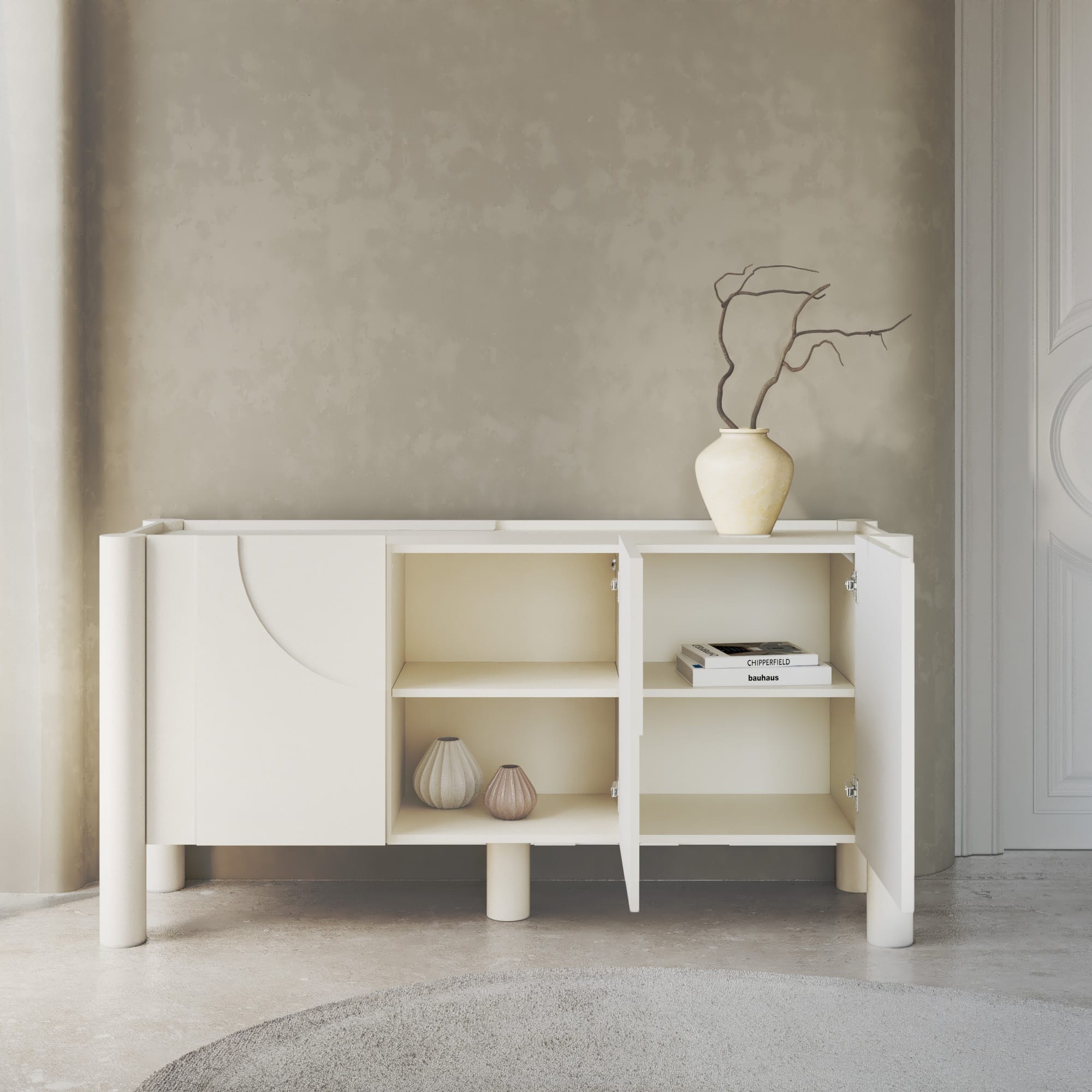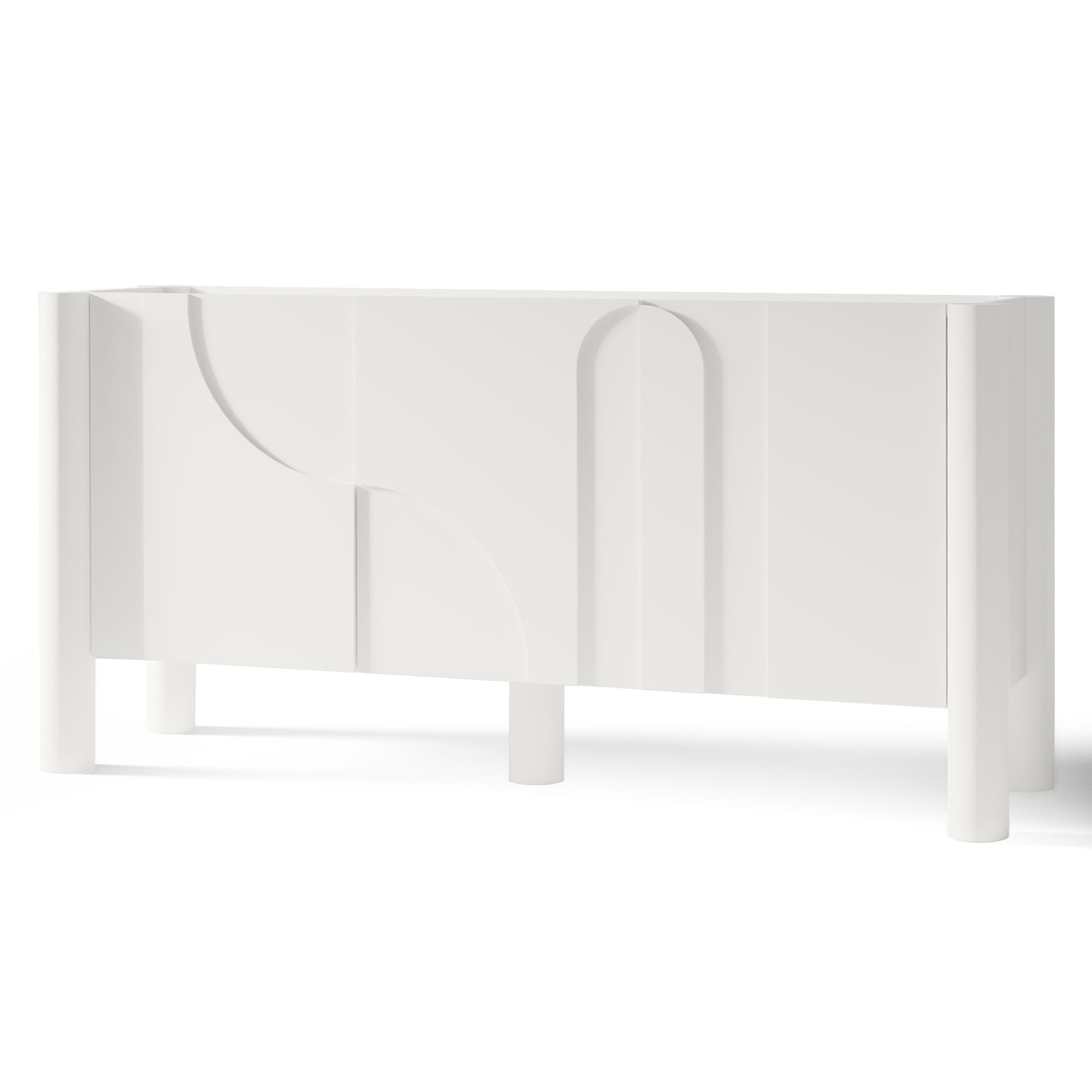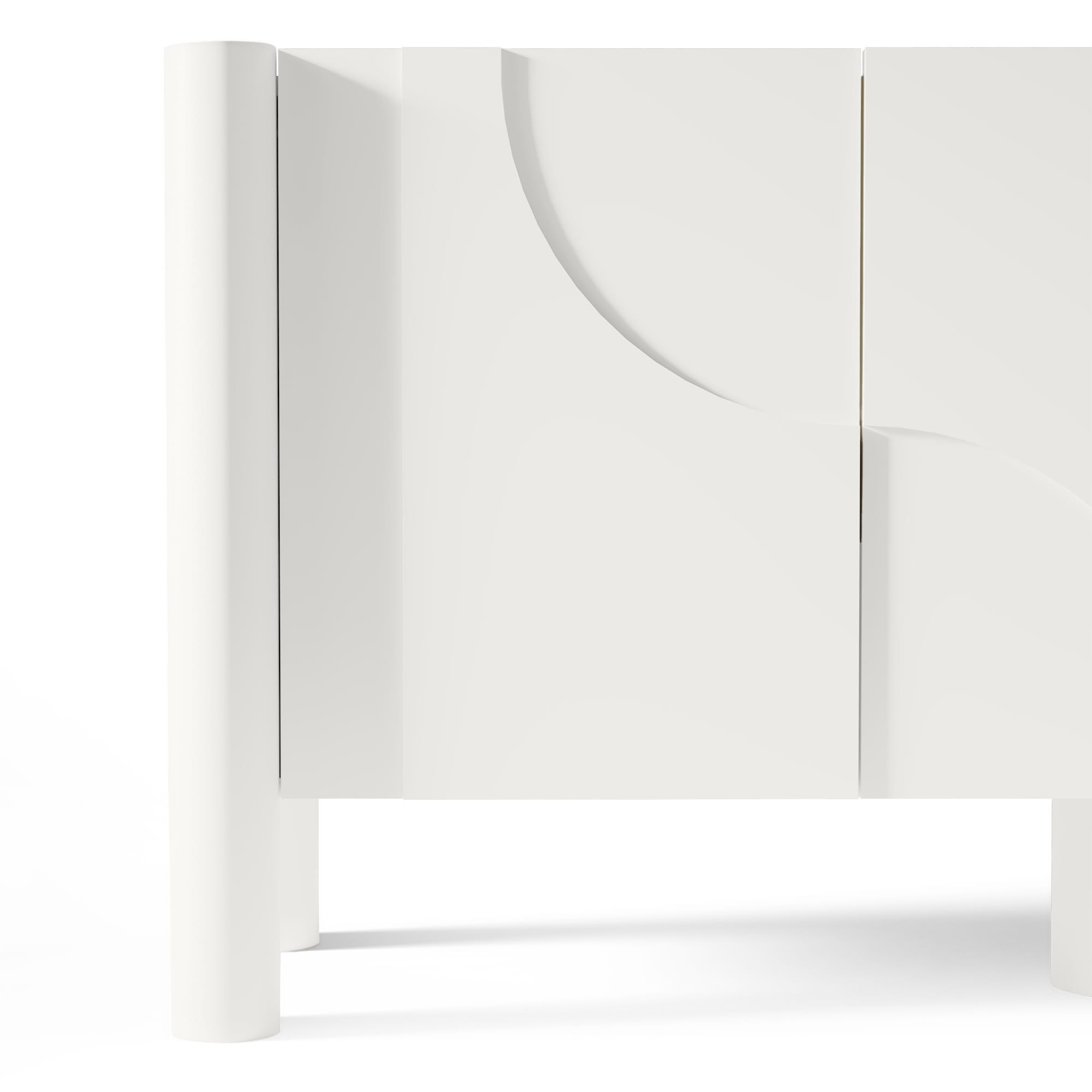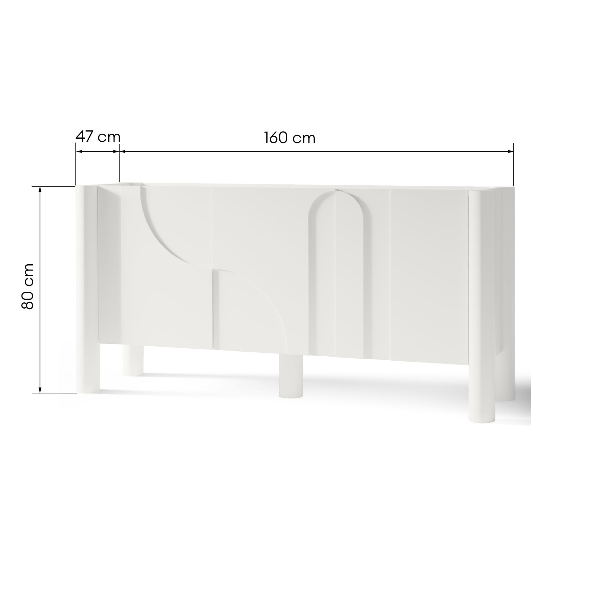 Lunaria – komoda, kurioje dizainas kuriamas ne per spalvą, o per paviršių. Klasikinis baltas fonas čia tampa pagrindu netaisyklingam, dekoratyviniam frezavimui, kuris kuria ritmą ir vizualinį gylį. Fasaduose atsirandančios linijos ir kreivės nėra simetriškos – tai sąmoningas sprendimas, suteikiantis baldui meninį, bet kontroliuojamą charakterį.