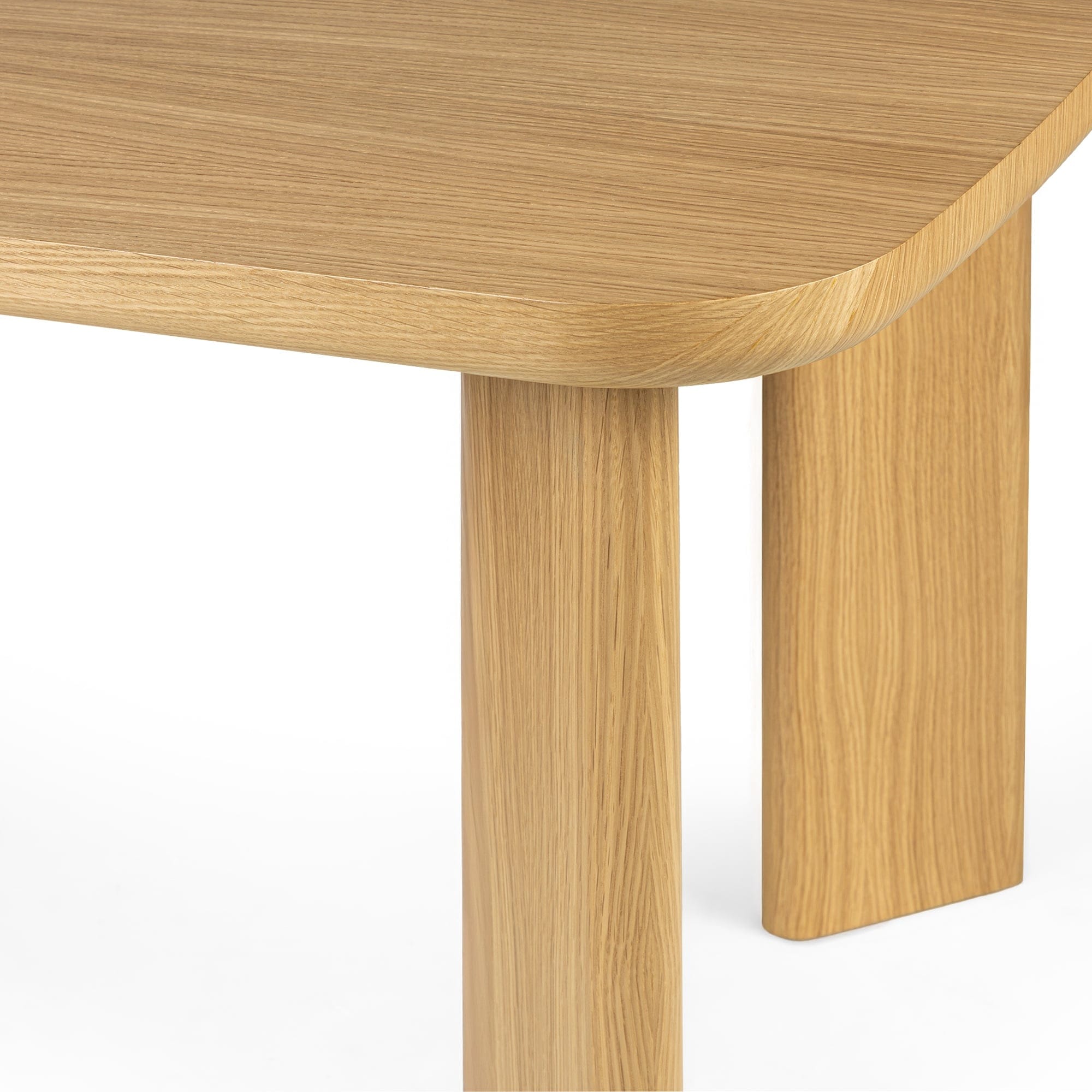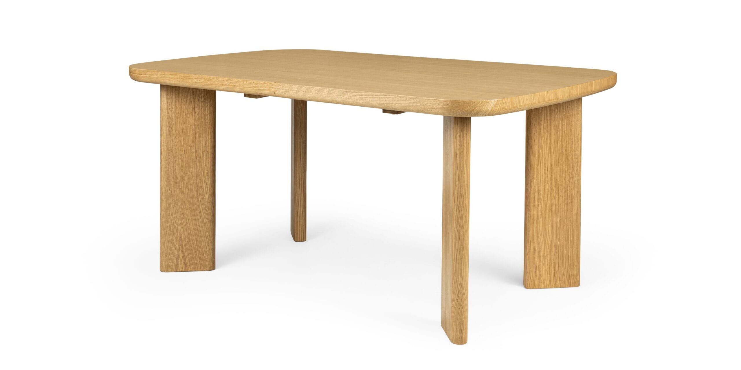 Švelniai užapvalinti stalviršio kampai suteikia vizualinio lengvumo ir leidžia stalui atrodyti minkštesniam bendrame interjere. Kojų konstrukcija tiesi, aiški, be dekoratyvinių pertekliaus elementų, todėl visas baldas išlaiko nuoseklų charakterį.