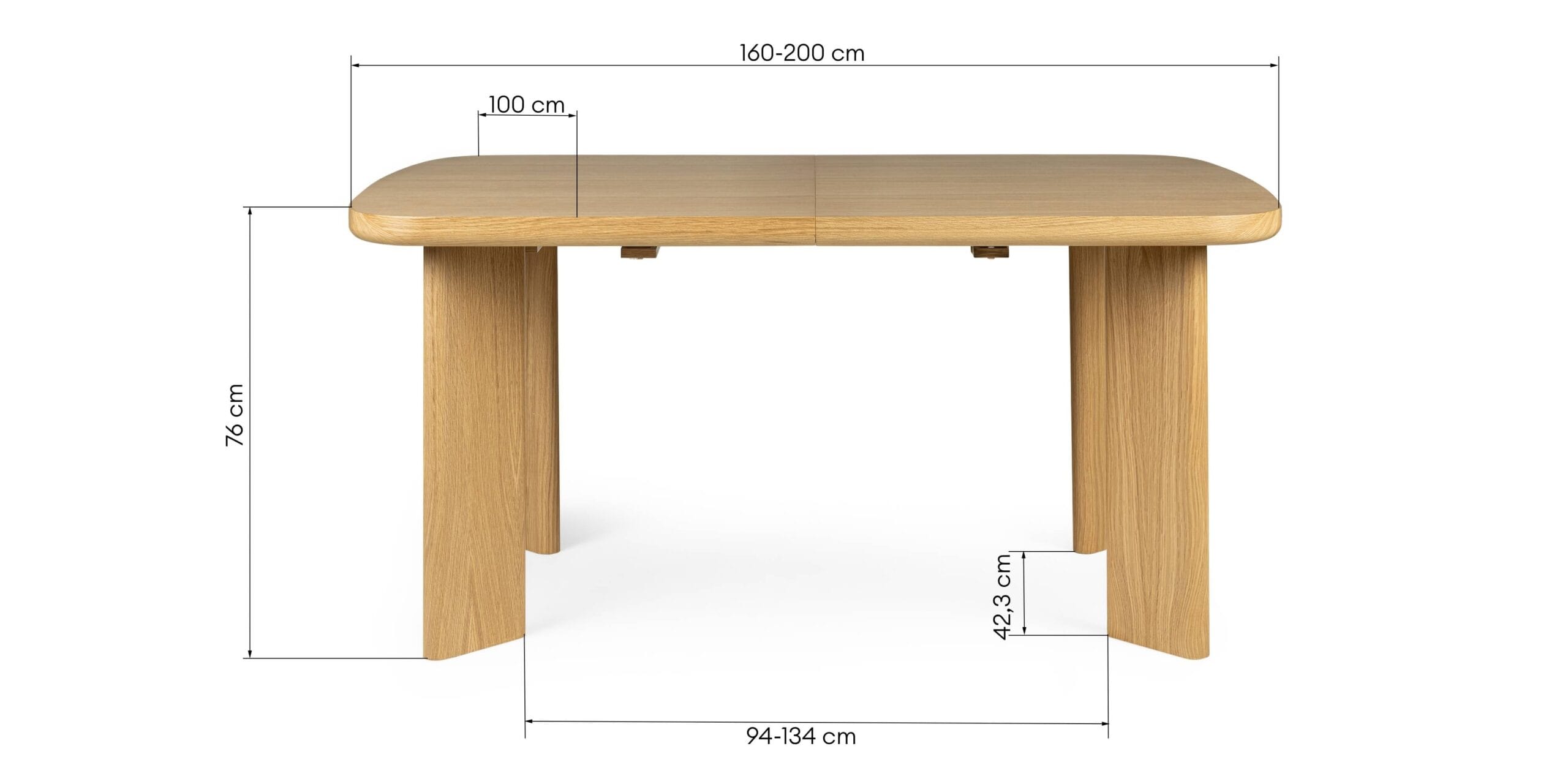 Išskleidimo mechanizmas paremtas nuimama prailginimo plokšte, leidžiančia padidinti stalviršio ilgį iki 200 cm. Sprendimas paprastas ir funkcionalus, be sudėtingų konstrukcinių elementų. Stalas išlieka stabilus tiek uždaras, tiek išskleistas, o keturios tvirtos kojos palaiko proporcijų balansą.