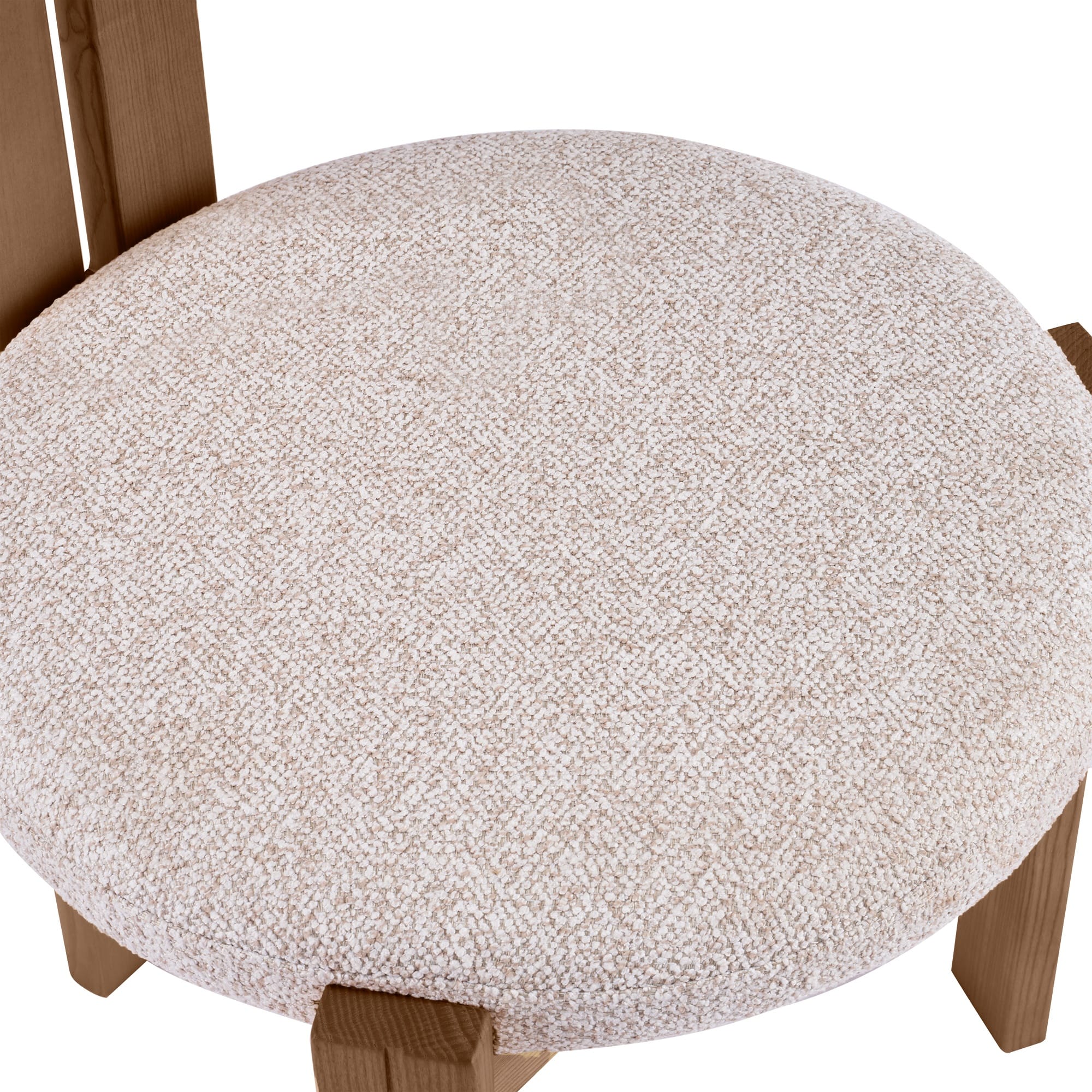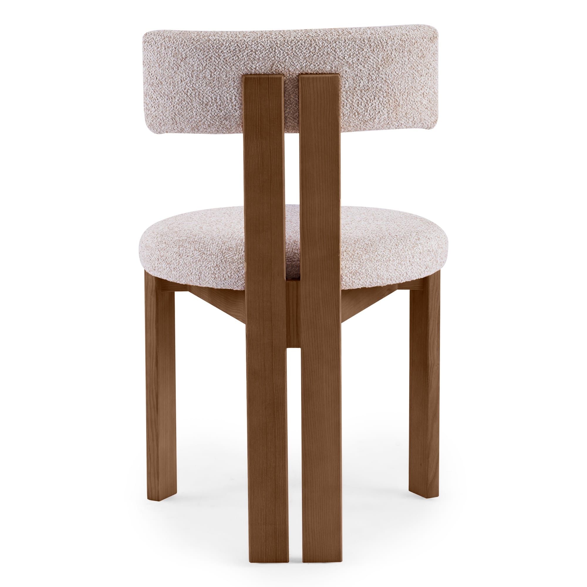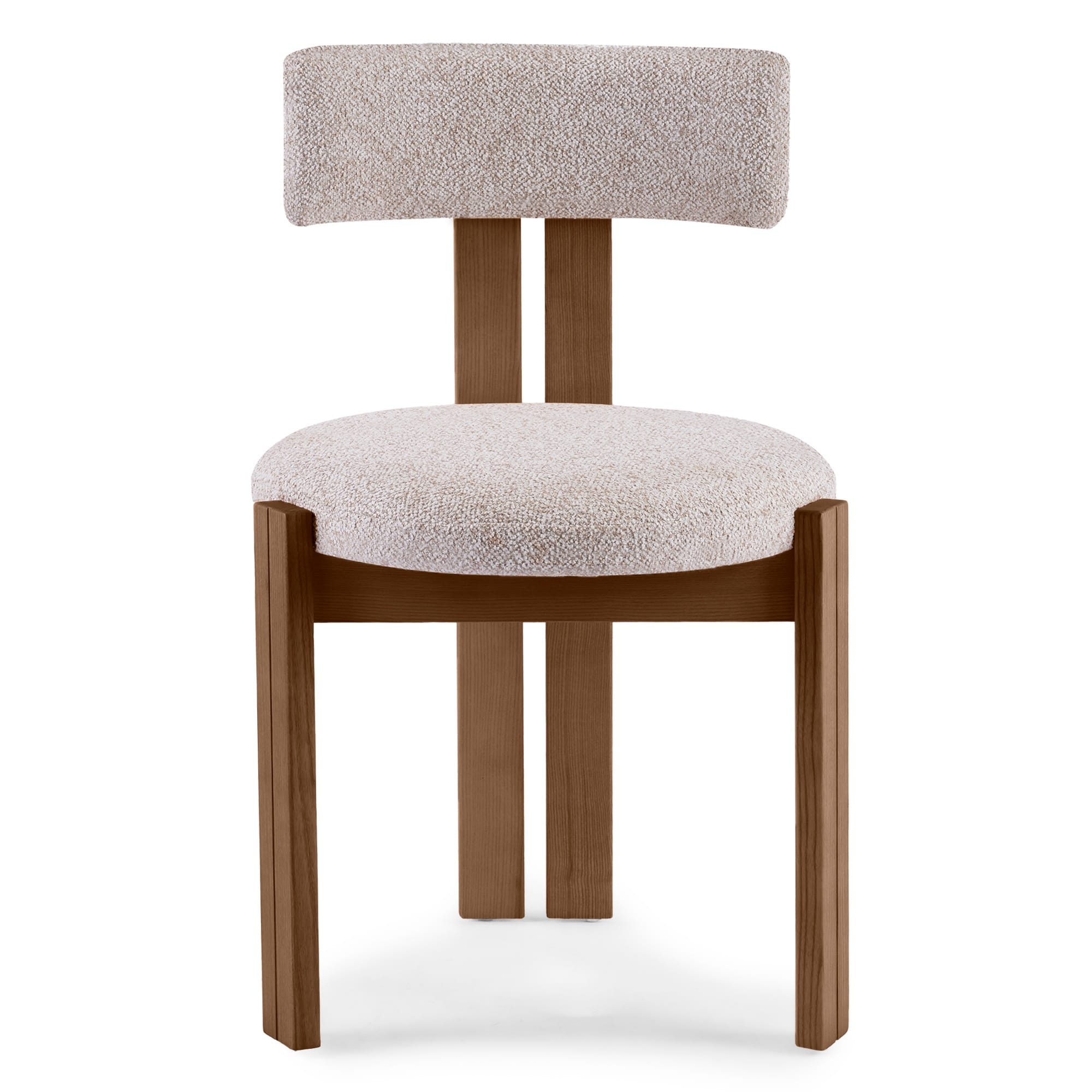 Sėdynė ir atlošas aptraukti smėlio ir kreminės spalvos audiniu, kuris vizualiai lengvas ir lengvai derinamas su skirtingais valgomojo stalais. Spalvinė gama neutrali, tačiau turinti gylio – ji neperkrauna erdvės ir leidžia kėdei išlikti aktualiai keičiantis interjero detalėms.