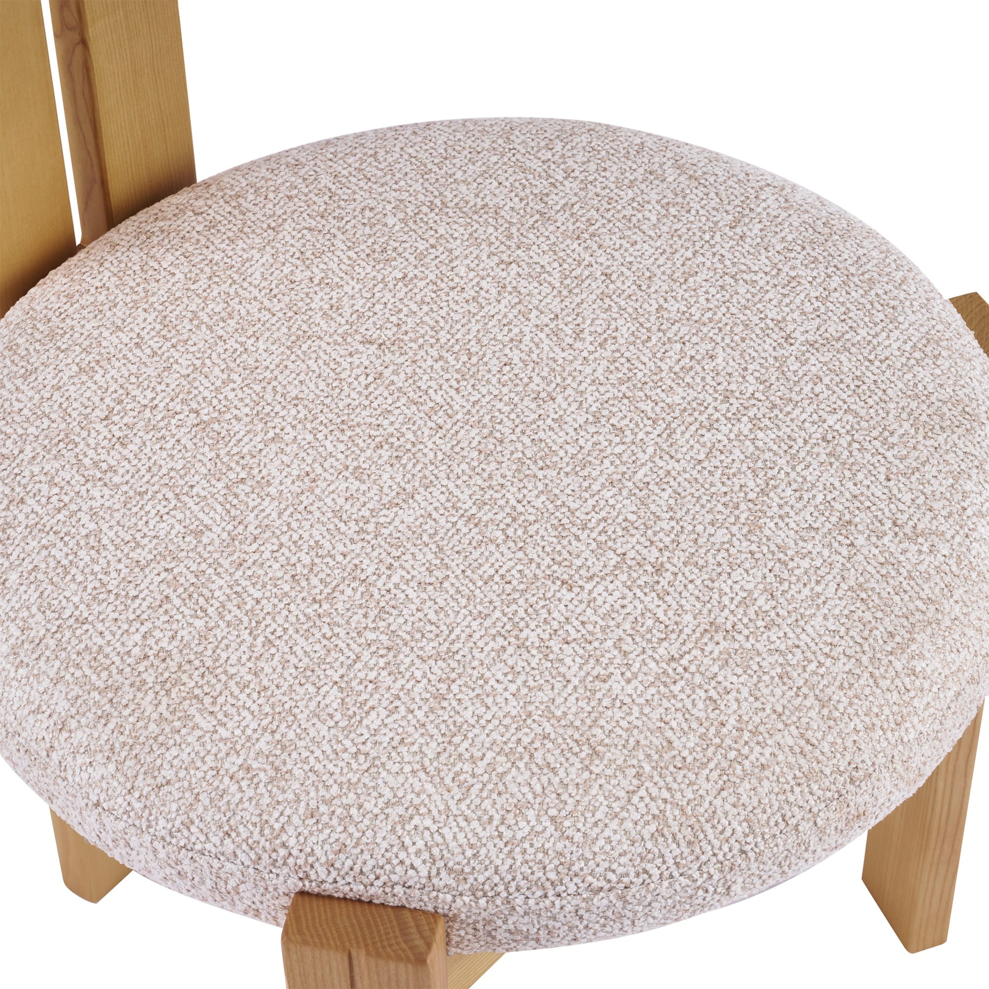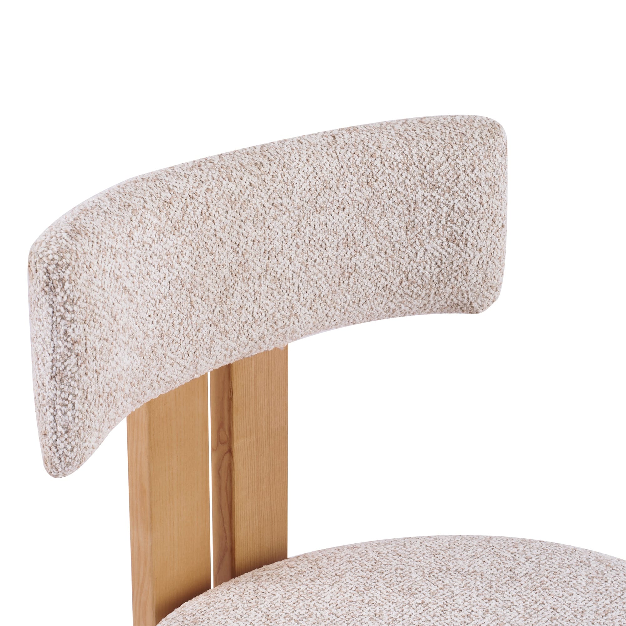 Sėdynė ir atlošas aptraukti smėlio ir kreminės spalvos audiniu. Spalvinė gama rami, švari ir lengvai derinama su skirtingais valgomojo stalais. Ji nekuria kontrasto, o leidžia išlaikyti vientisą, subalansuotą vaizdą net keičiantis aplinkai.