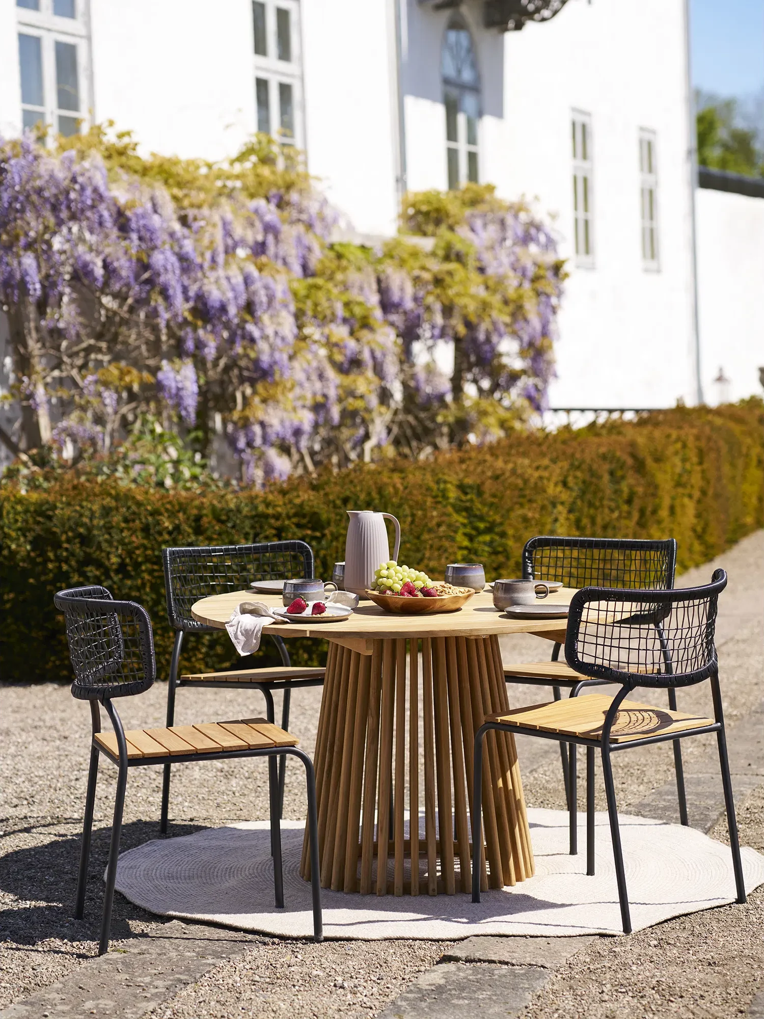 Menorca ovalus lauko kilimas suteikia terasos erdvei šilumos ir vientisumo.