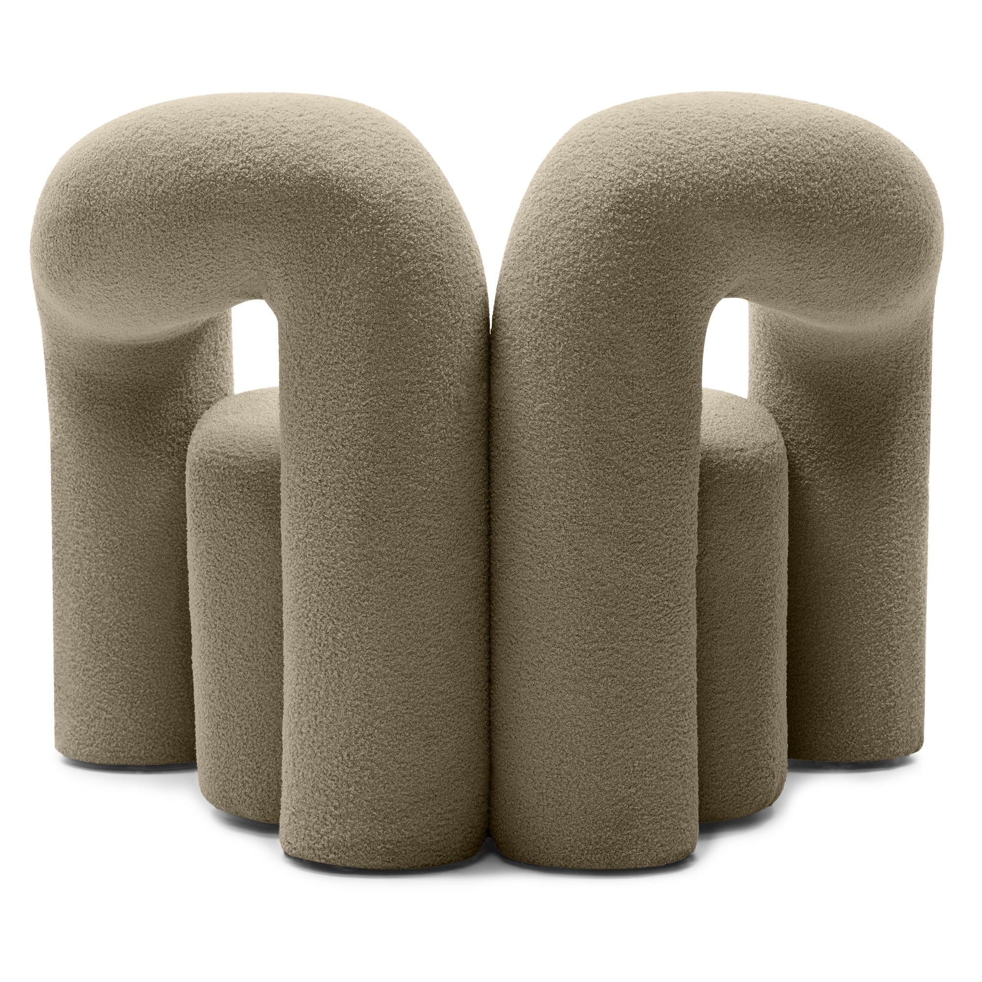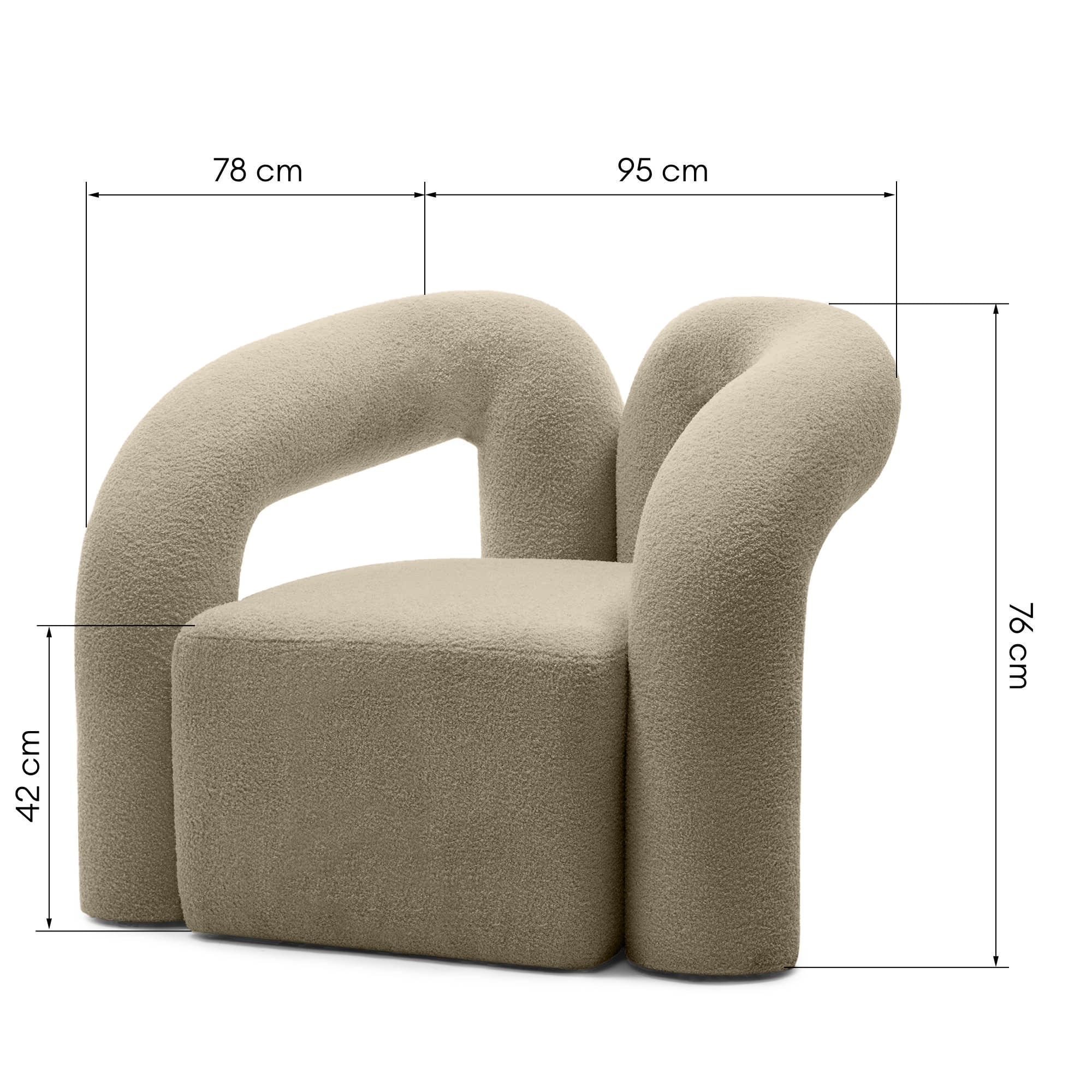 Merry Brown bouclé fotelis – tai baldas, kuris jungia šiuolaikinį dizainą ir neprilygstamą jaukumą. Jo apvalios, ovalios formos atspindi organiškų siluetų tendenciją, kuri šiuo metu yra viena ryškiausių interjero dizaino krypčių.