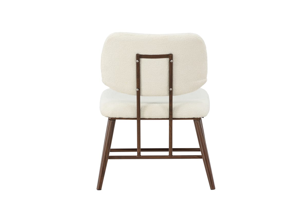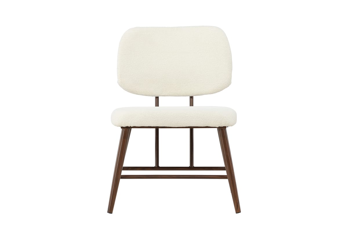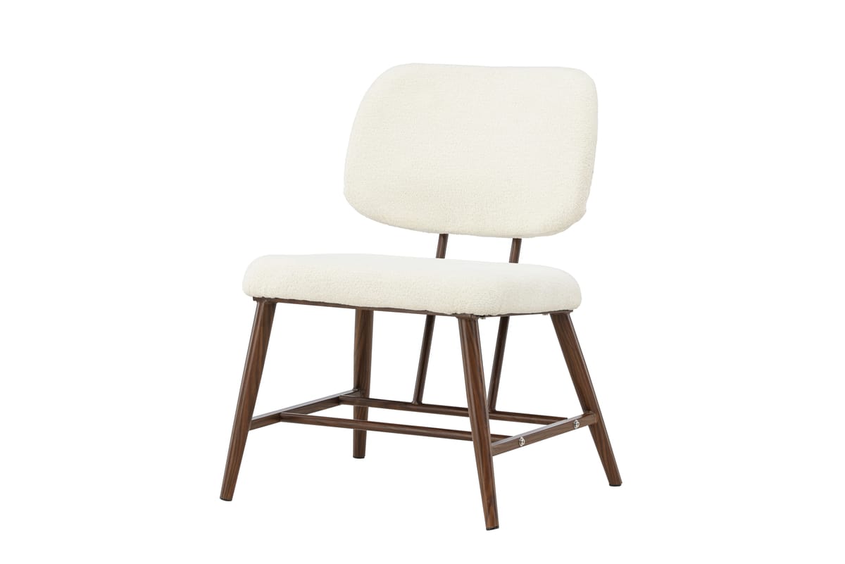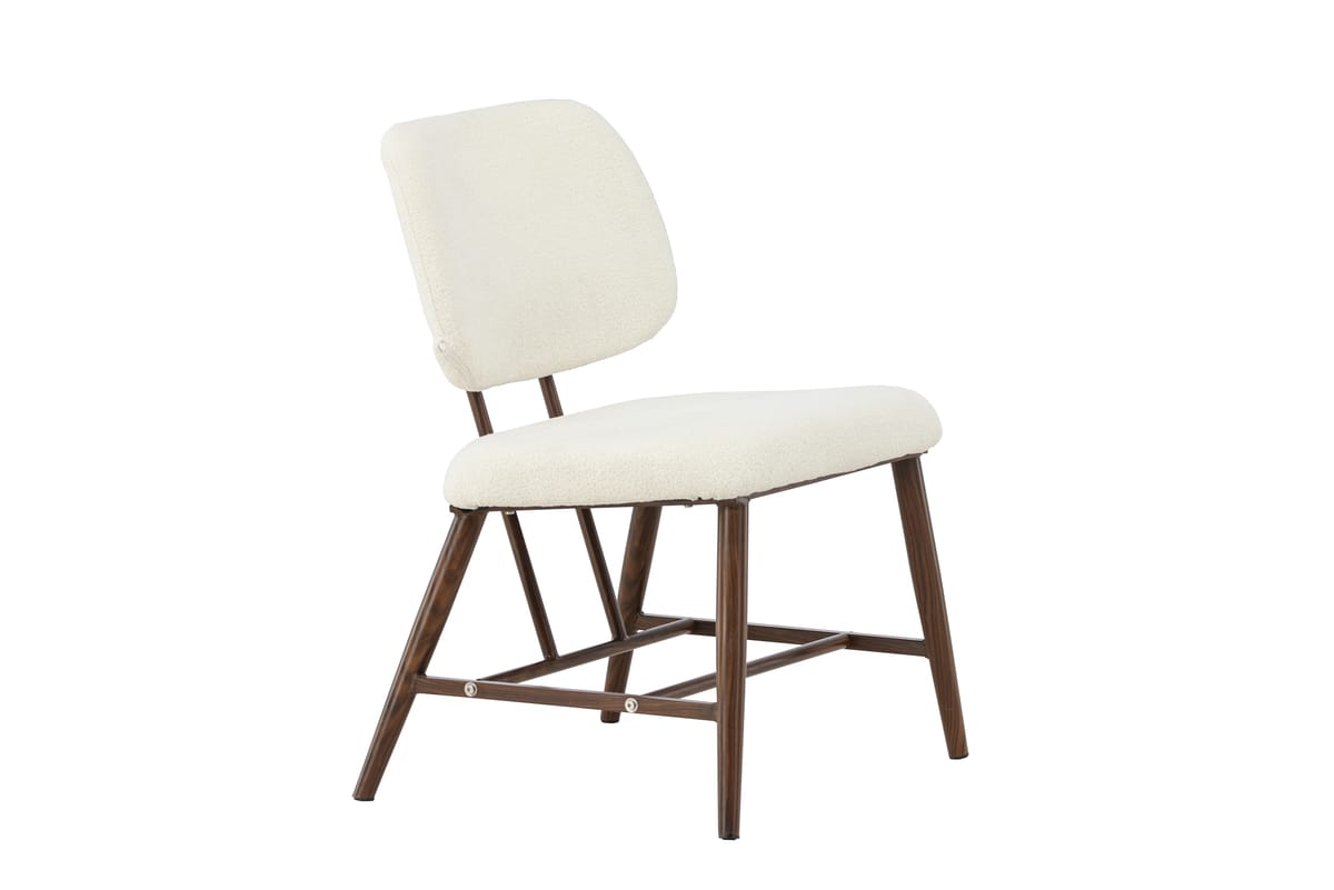 Šis krėslas išsiskiria savo baltos spalvos bouclé audiniu, kuris šiuo metu yra itin madingas interjero pasaulyje. Audinys yra ne tik švelnus ir malonus liesti, bet ir suteikia subtilios prabangos įspūdį. Lengvai platėjančios kojelės medžio atspalvio – tai šiuolaikiškas derinys, kuris šildo interjerą ir padeda lengvai integruoti krėslą į įvairias namų erdves.