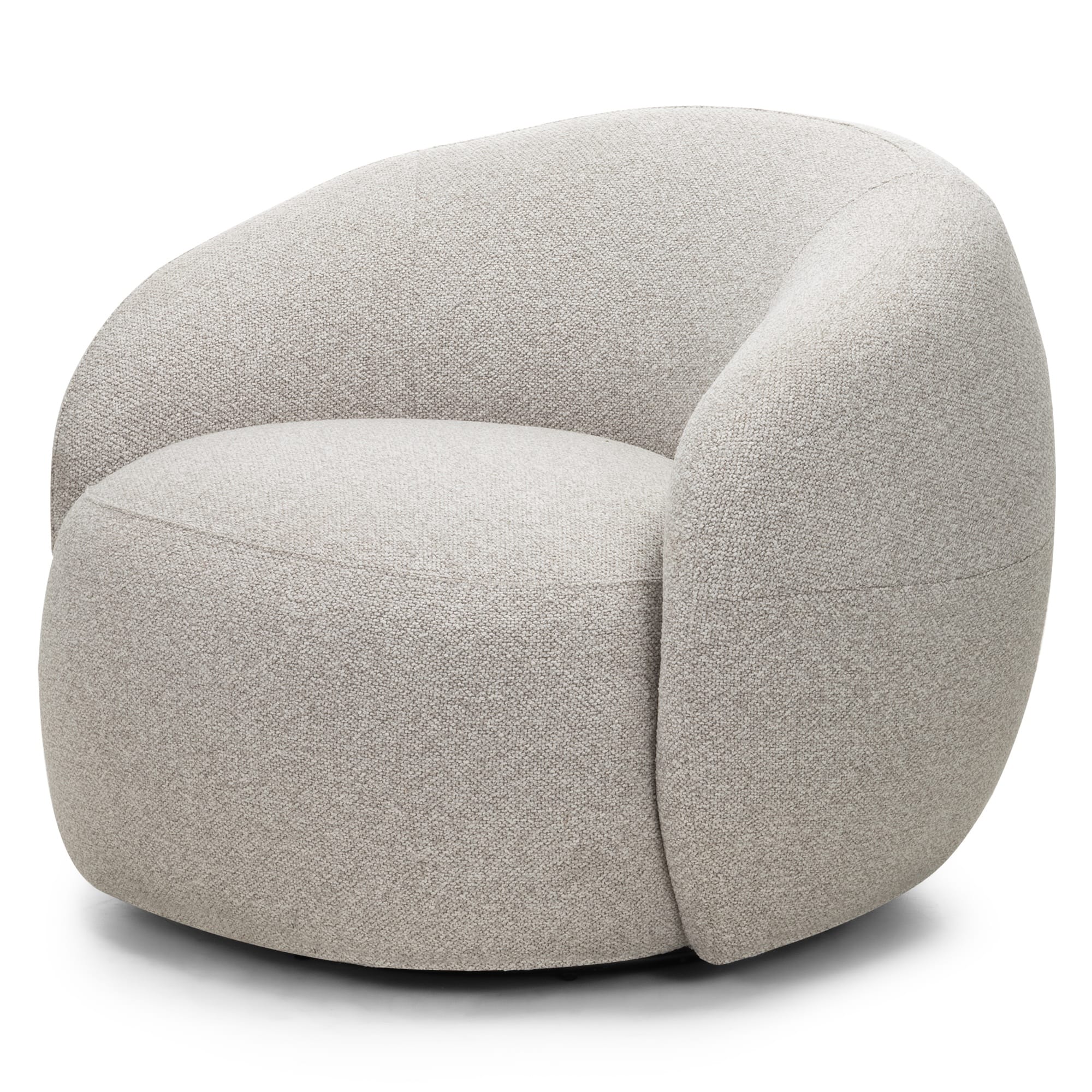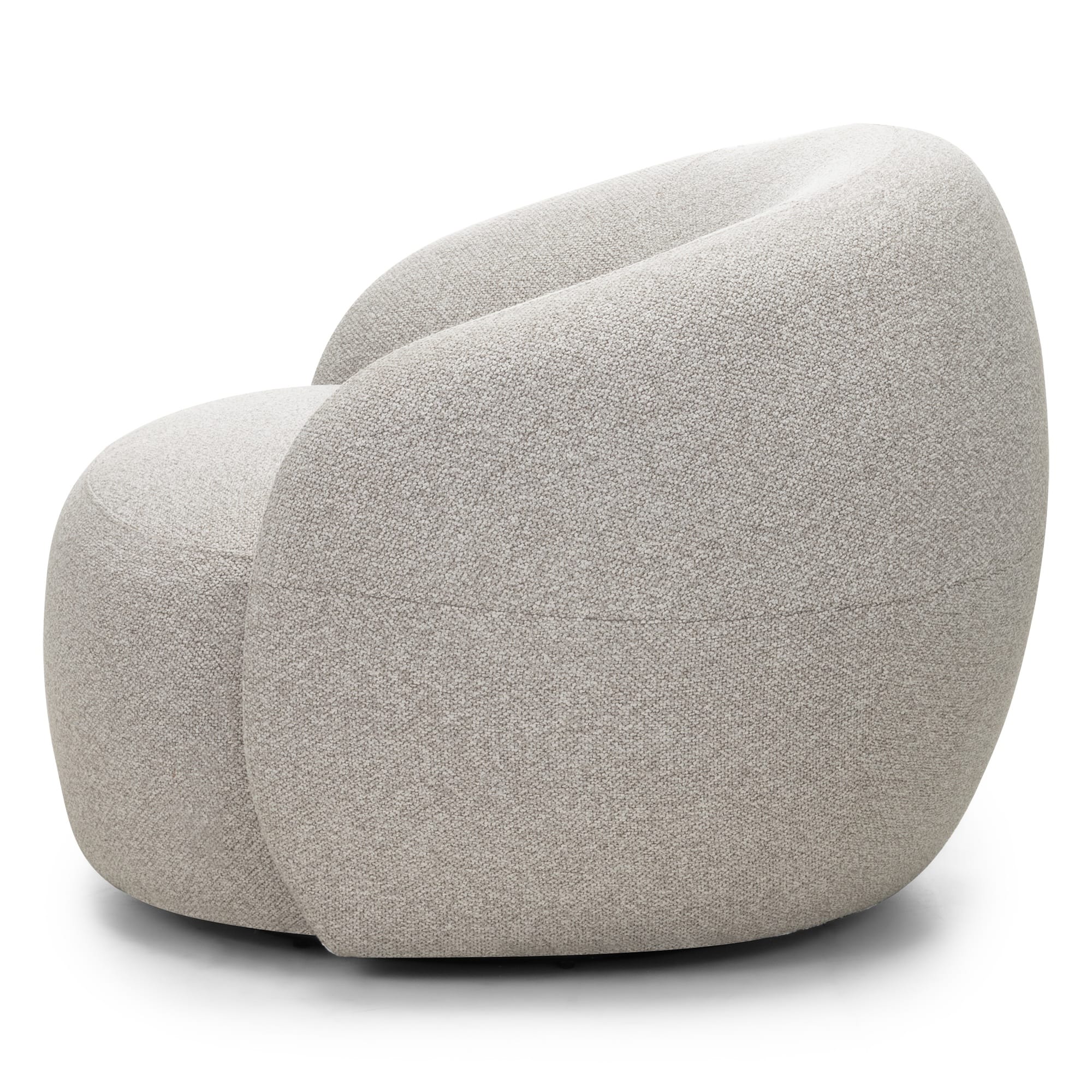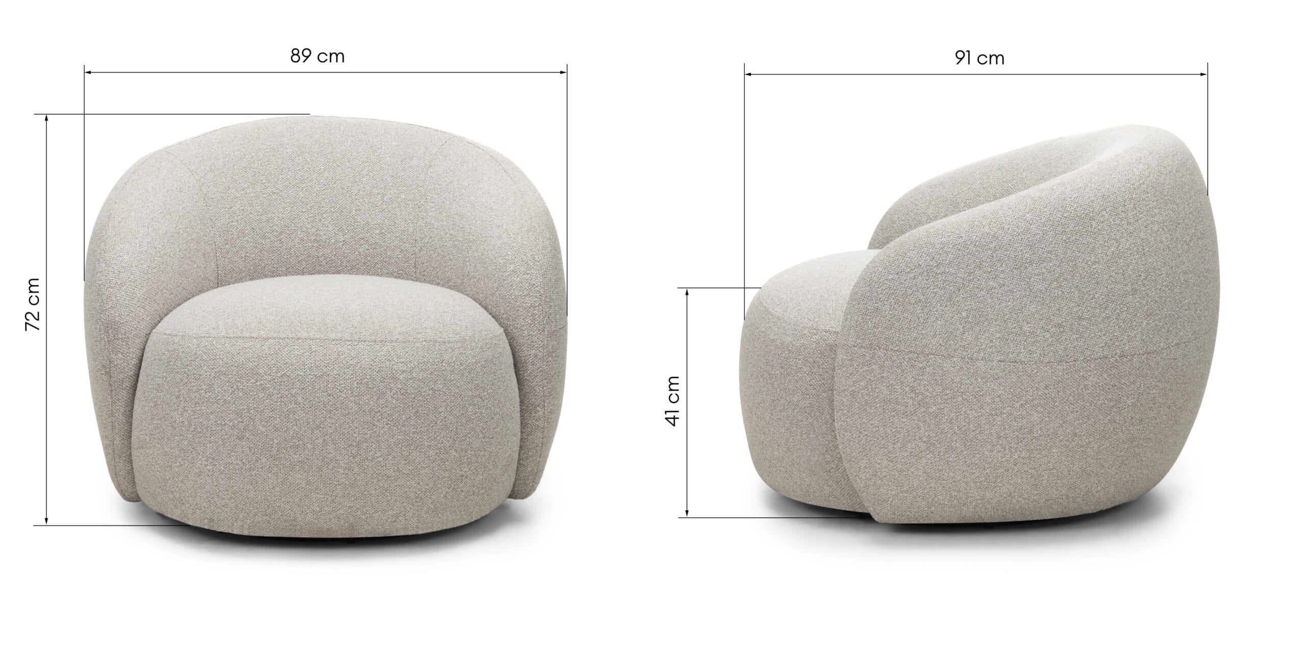 Apvalios formos ir minkšto audinio apmušalai suteikia foteliui vizualinį švelnumą, o subtili smėlio-pilka spalva harmoningai dera su šiuolaikinėmis interjero tendencijomis – nuo minimalistinių erdvių iki skandinaviškų svetainių.