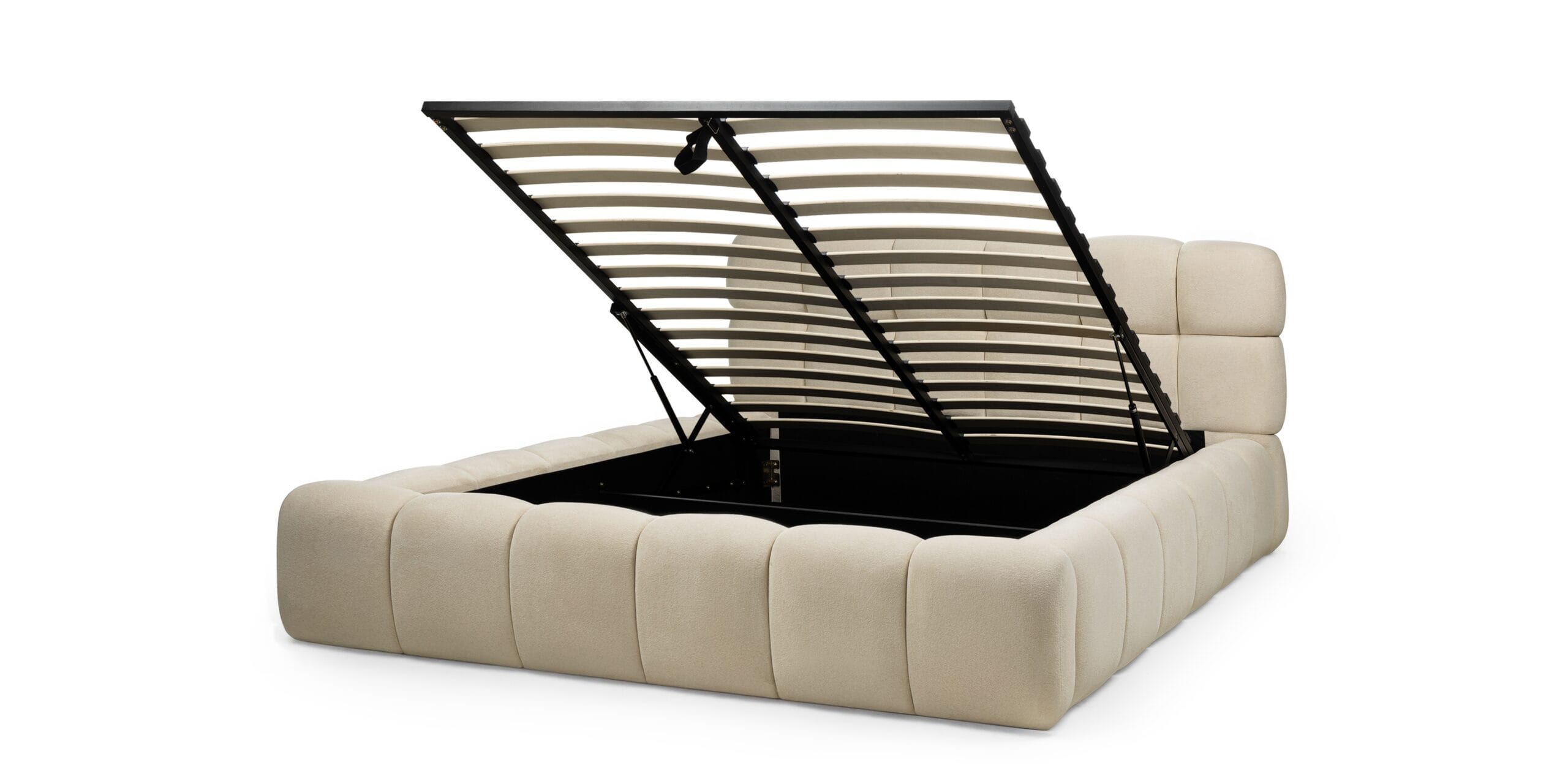 Po lova integruota audiniu išklota patalynės dėžė. Ji išlaiko bendrą estetiką ir leidžia praktiškai išnaudoti erdvę, neįvedant papildomų baldų. Pridedamas metalinis rėmas užtikrina konstrukcijos stabilumą ir ilgaamžiškumą. Lova komplektuojama be čiužinio, todėl ją lengva pritaikyti individualiems miego poreikiams.