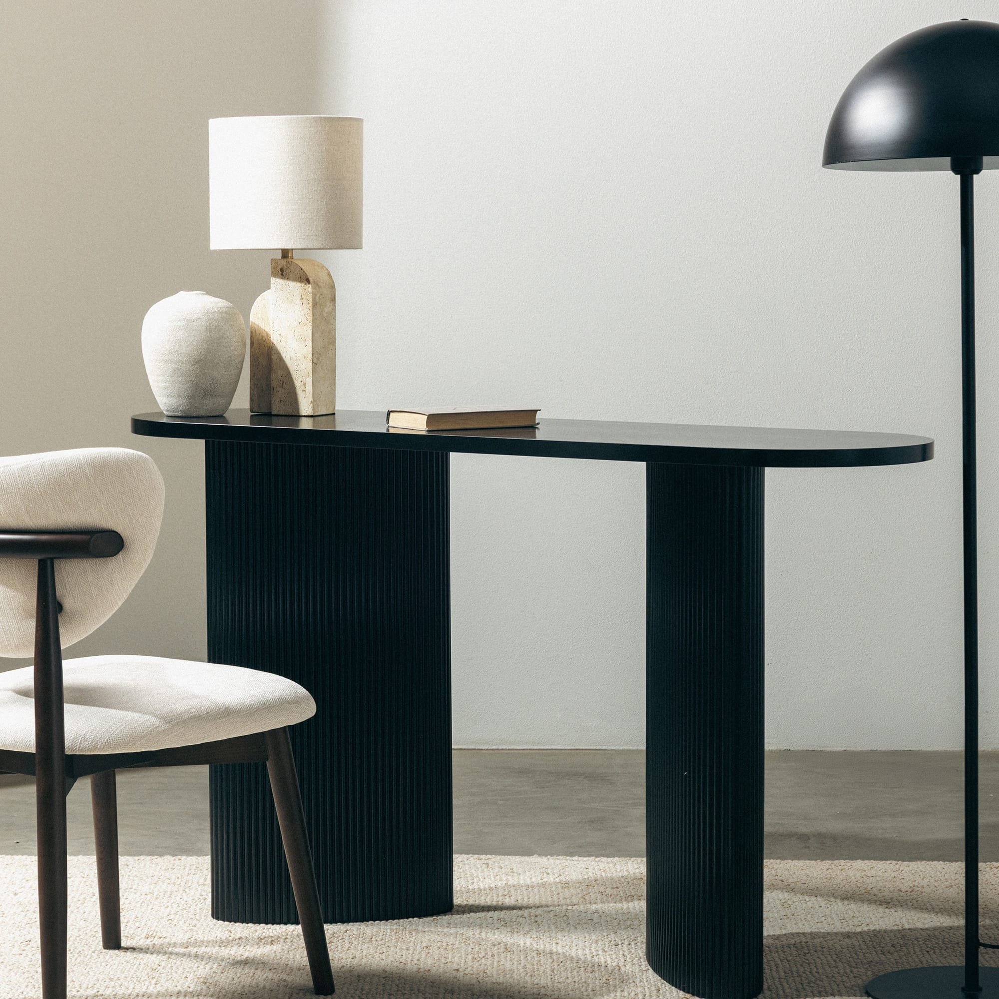 Ovalus stalviršis, dvi tvirtos kojos ir dekoratyvinės lamelės sukuria vizualinį balansą tarp tvirtumo ir lengvumo. Tamsus paviršius atspindi „tylios prabangos“ tendenciją – subtilią, nepretenzingą, bet aiškiai matomą kokybę.