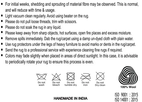 Kilimas pagamintas iš 100 % vilnos, kuri pasižymi natūralumu ir malonia tekstūra. Vilna suteikia šilumos pojūtį ir padeda sukurti jaukesnę erdvę.
