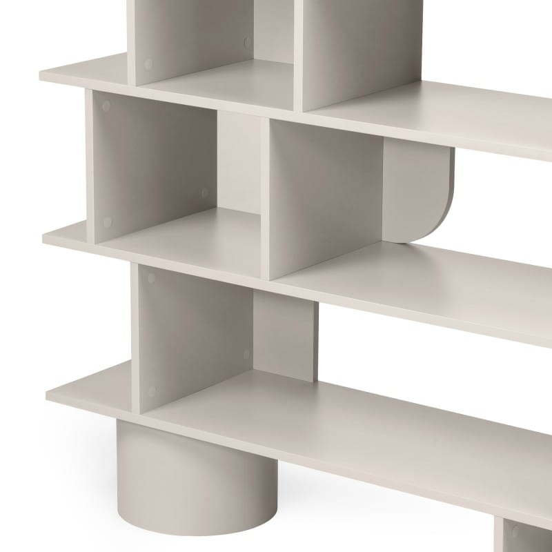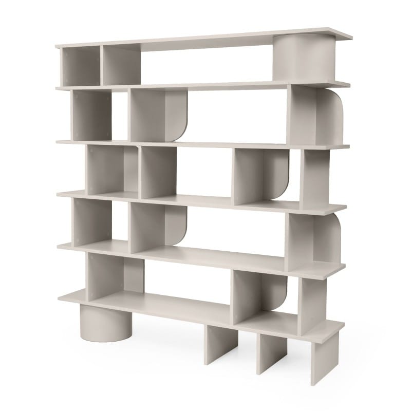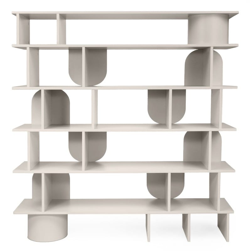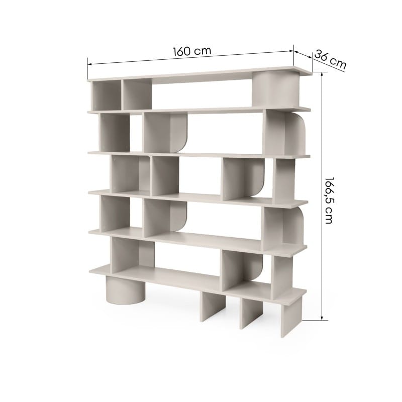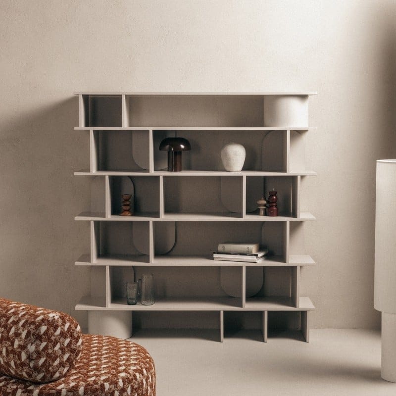 Šešios lentynos, dekoratyvinės arkos ir cashmere spalva – sprendimas, kuris padeda palaikyti tvarką ir kartu tampa interjero akcentu.