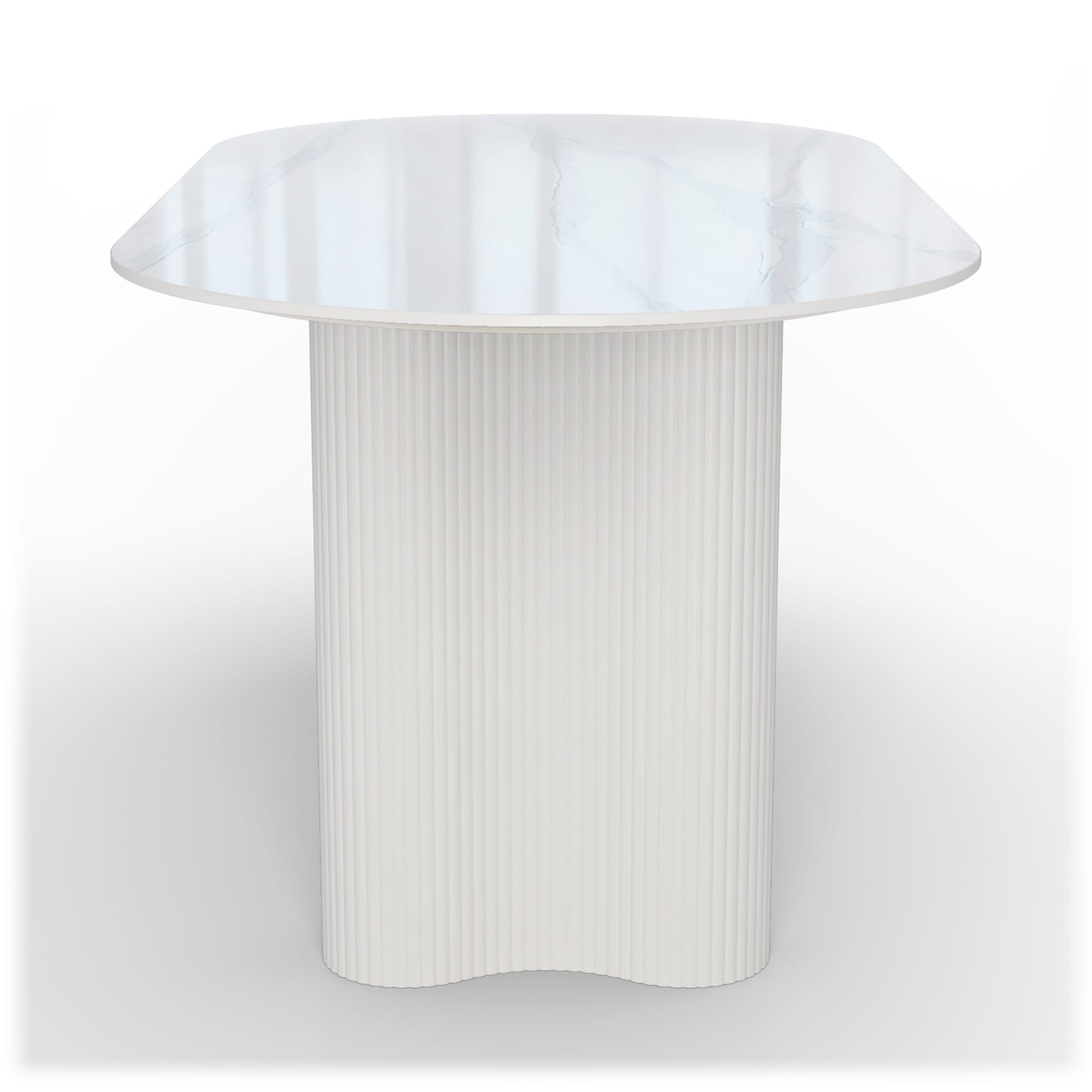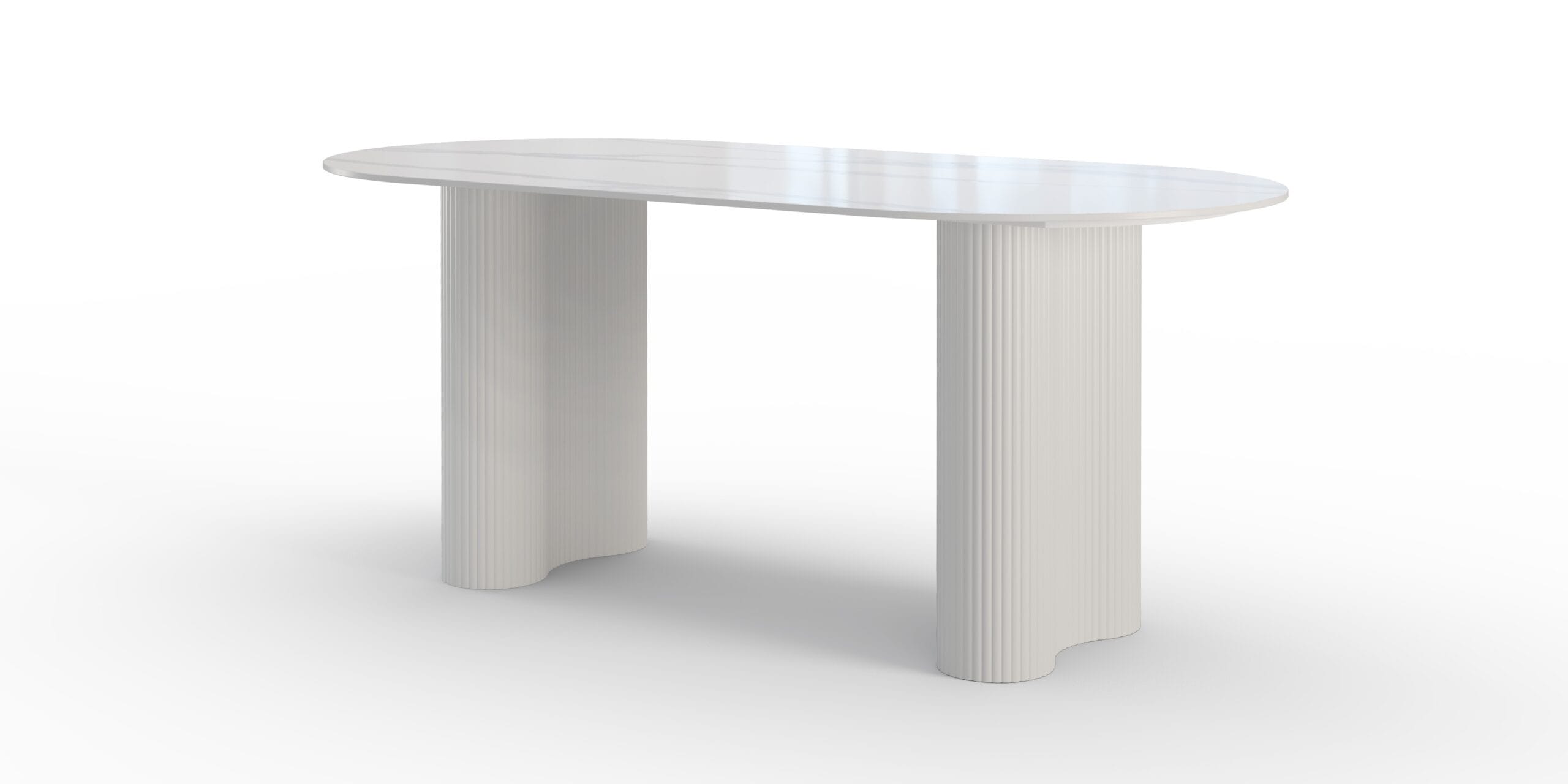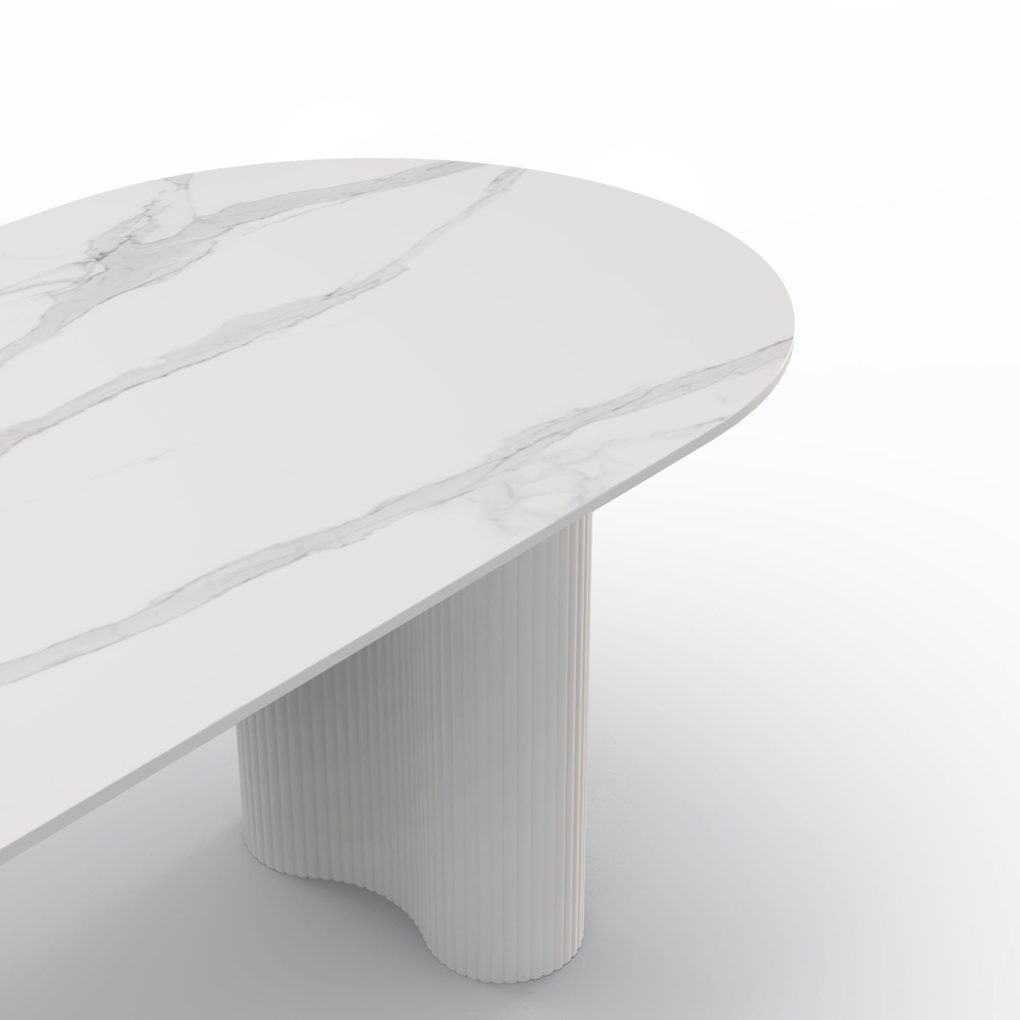 Ovalus stalviršis su marmuro imitacija ir skulptūriškas pagrindas. Stalas, kuris akimirksniu pakelia valgomojo lygį.