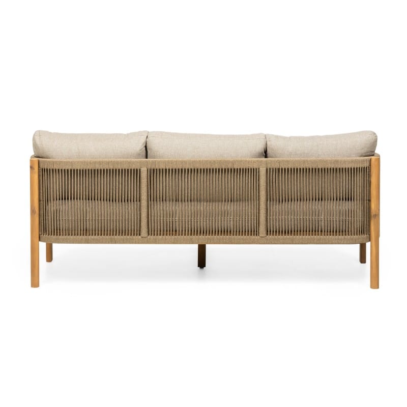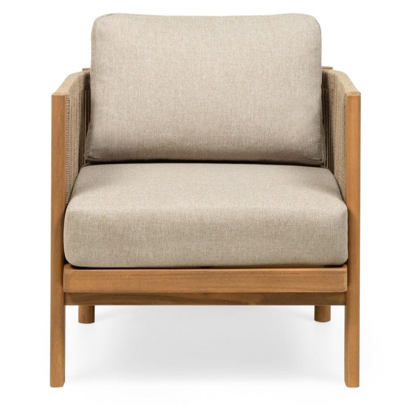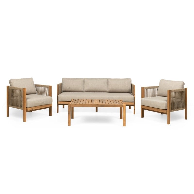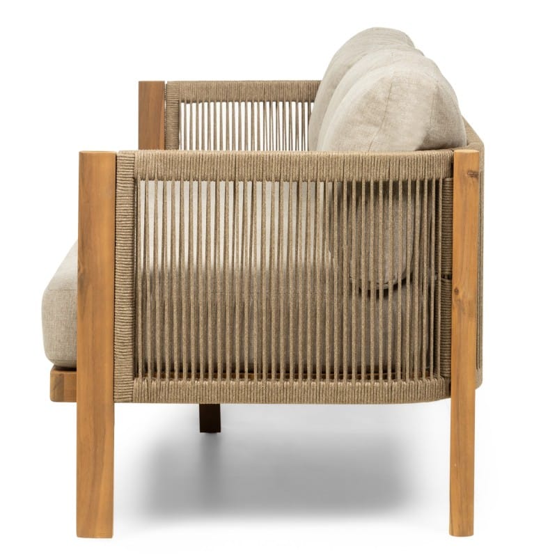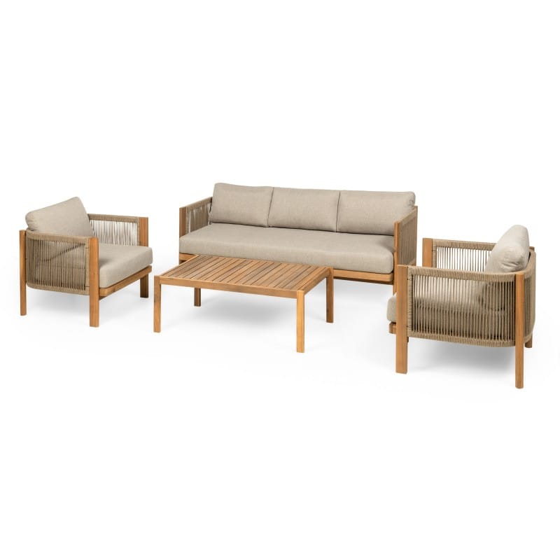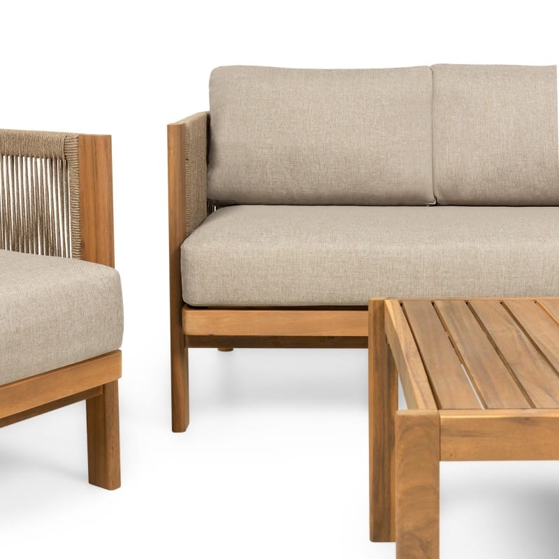 Rissota tobulai deranti akacijos mediena su išraiškingu virvės pynimu, sukuria lengvą, bet solidų vaizdą. Storos pagalvėlės ir tikmedžio apdaila užtikrina komfortą, o visas komplektas veikia kaip išbaigtas sprendimas stilingai terasai.
