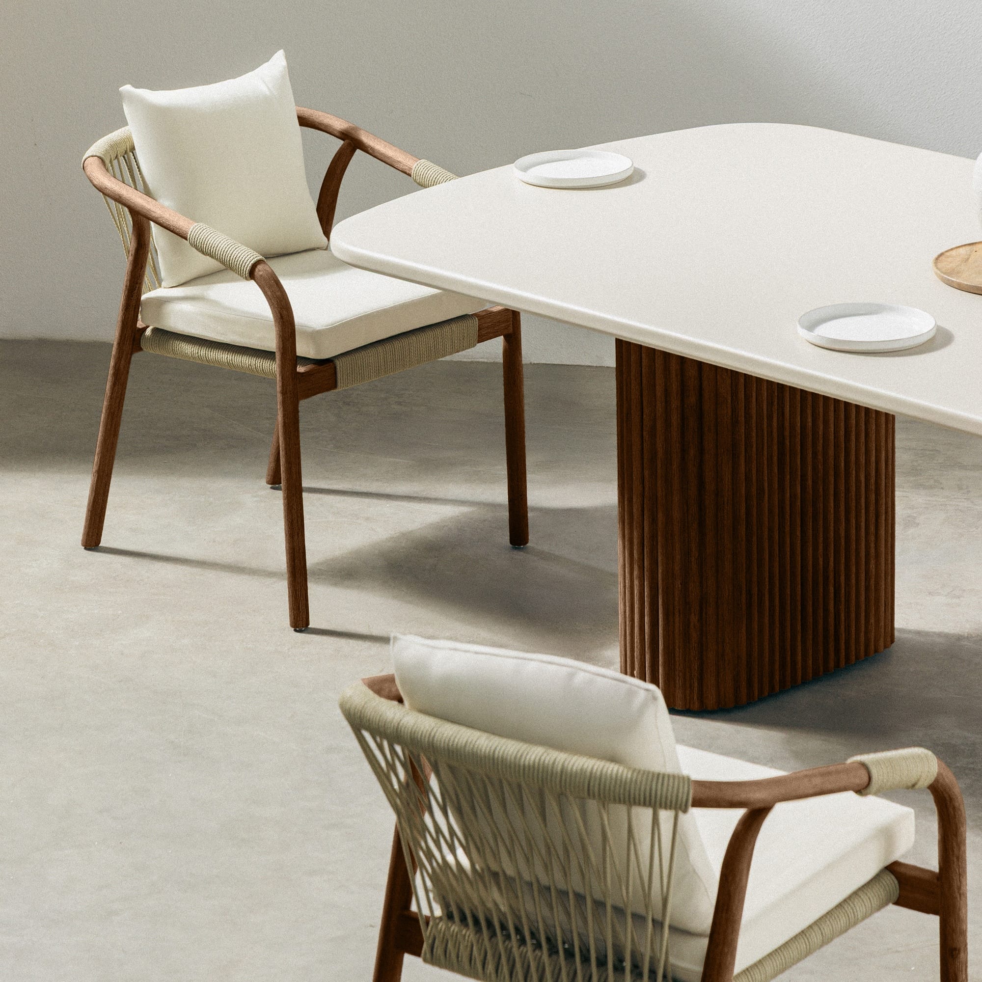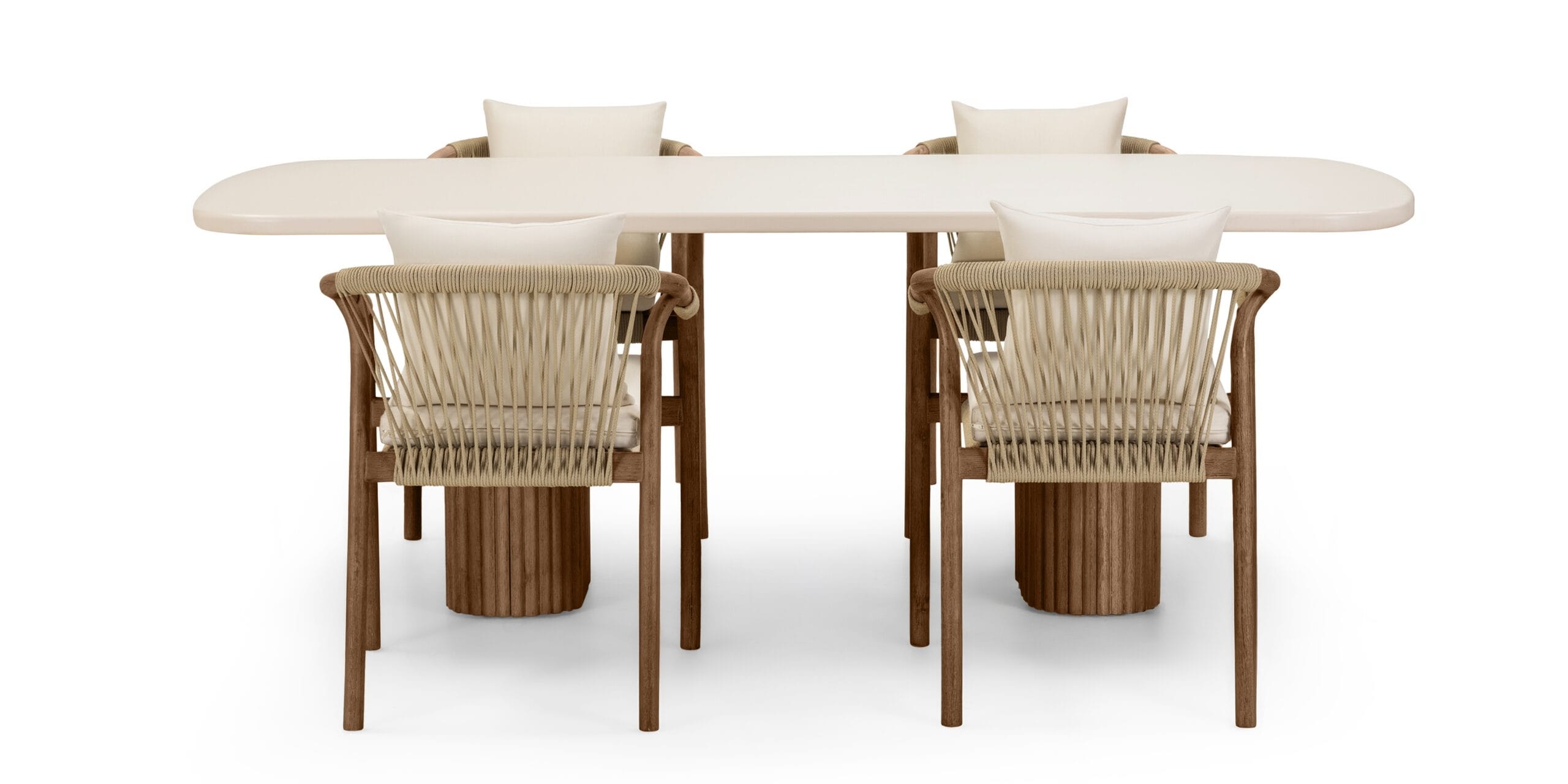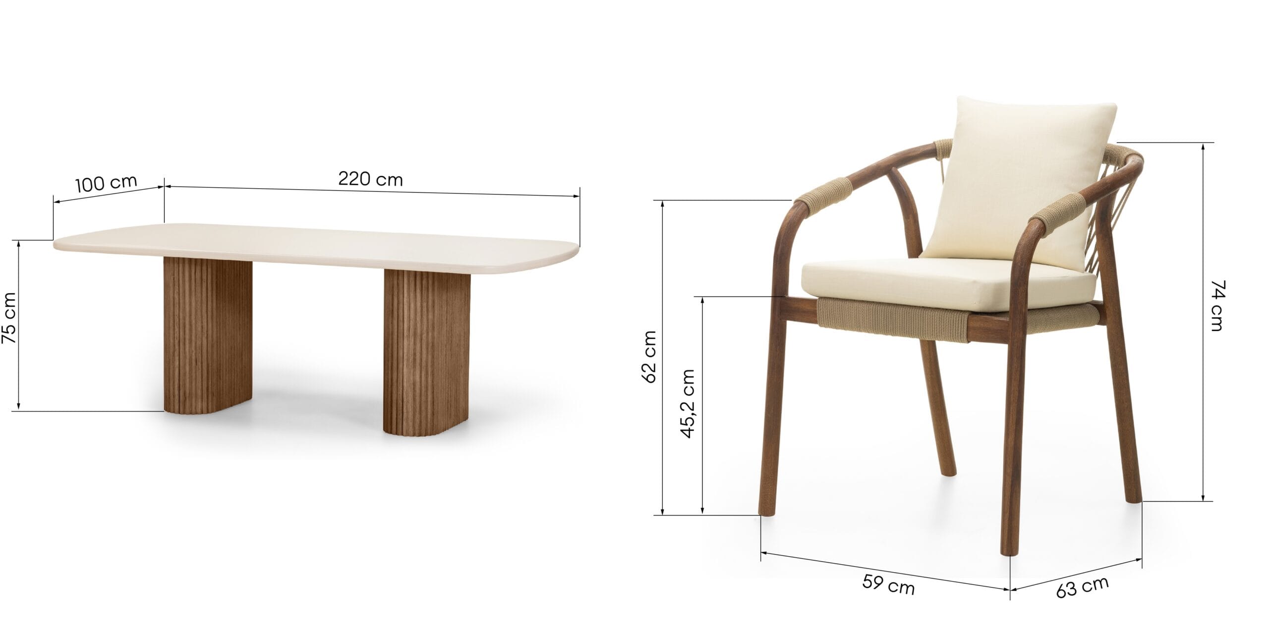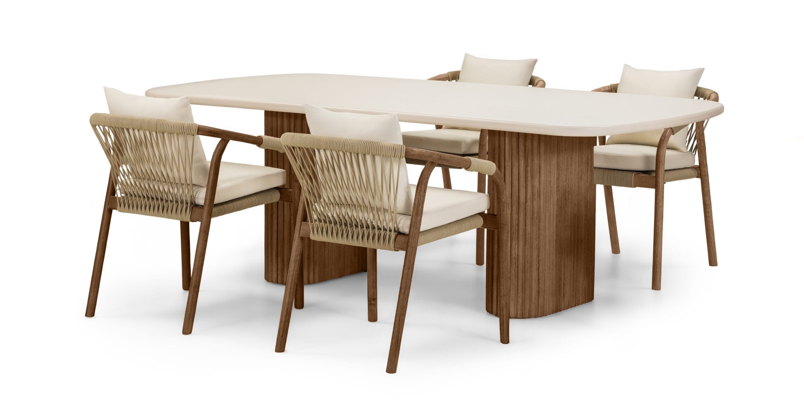Komplekto pagrindas – Superstone stalas, kurio šviesiai smėlio spalvos paviršius primena natūralų akmenį, tačiau yra kur kas atsparesnis aplinkos poveikiui. Subtiliai suapvalinti kraštai kuria lengvumo įspūdį, o masyvios akacijos medienos kojos suteikia natūralumo ir jaukumo. Tai stalas, kuris traukia žvilgsnį, bet netrukdo erdvei „kvėpuoti“.