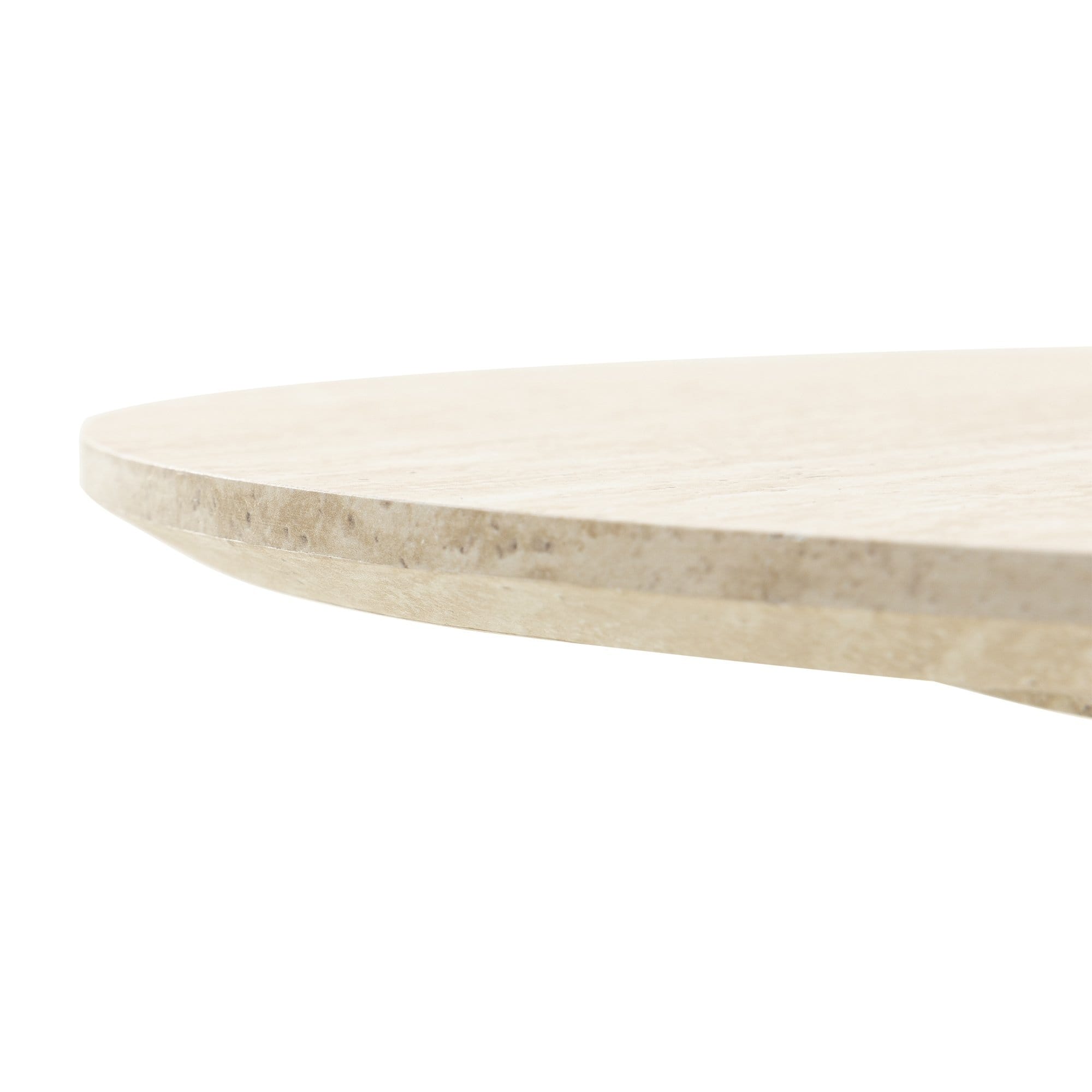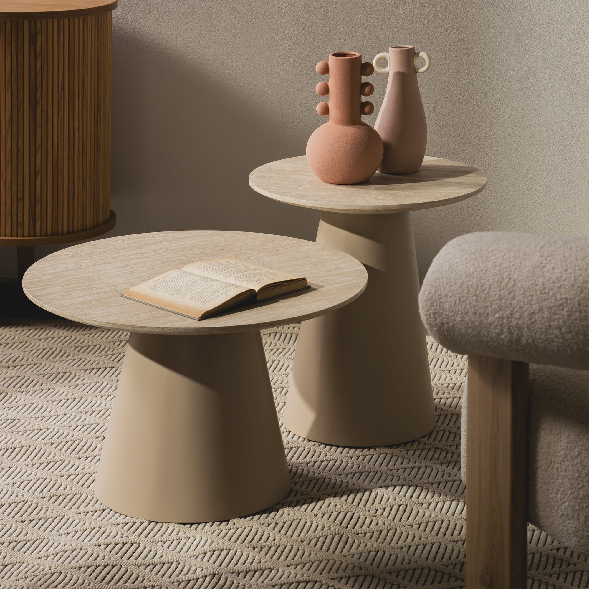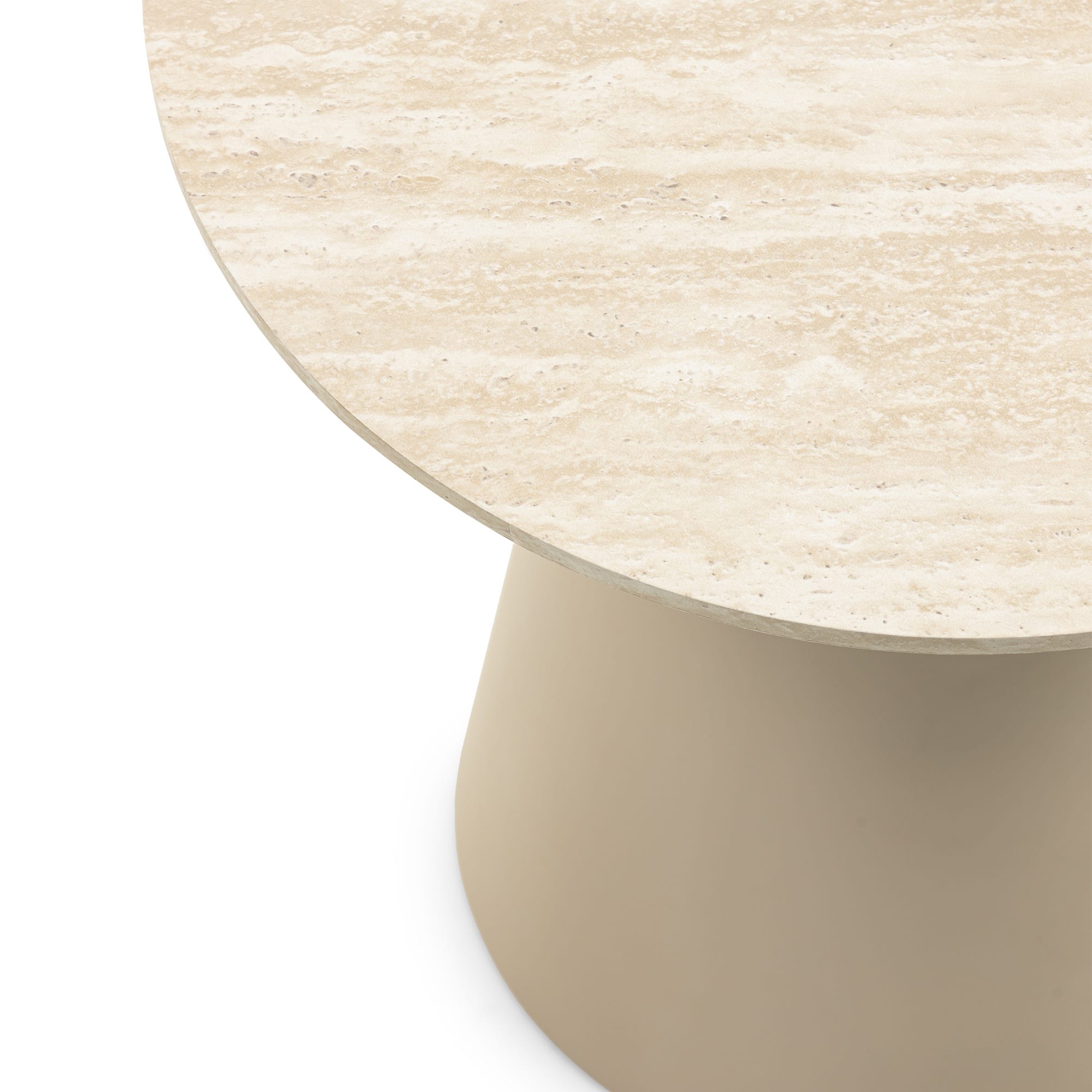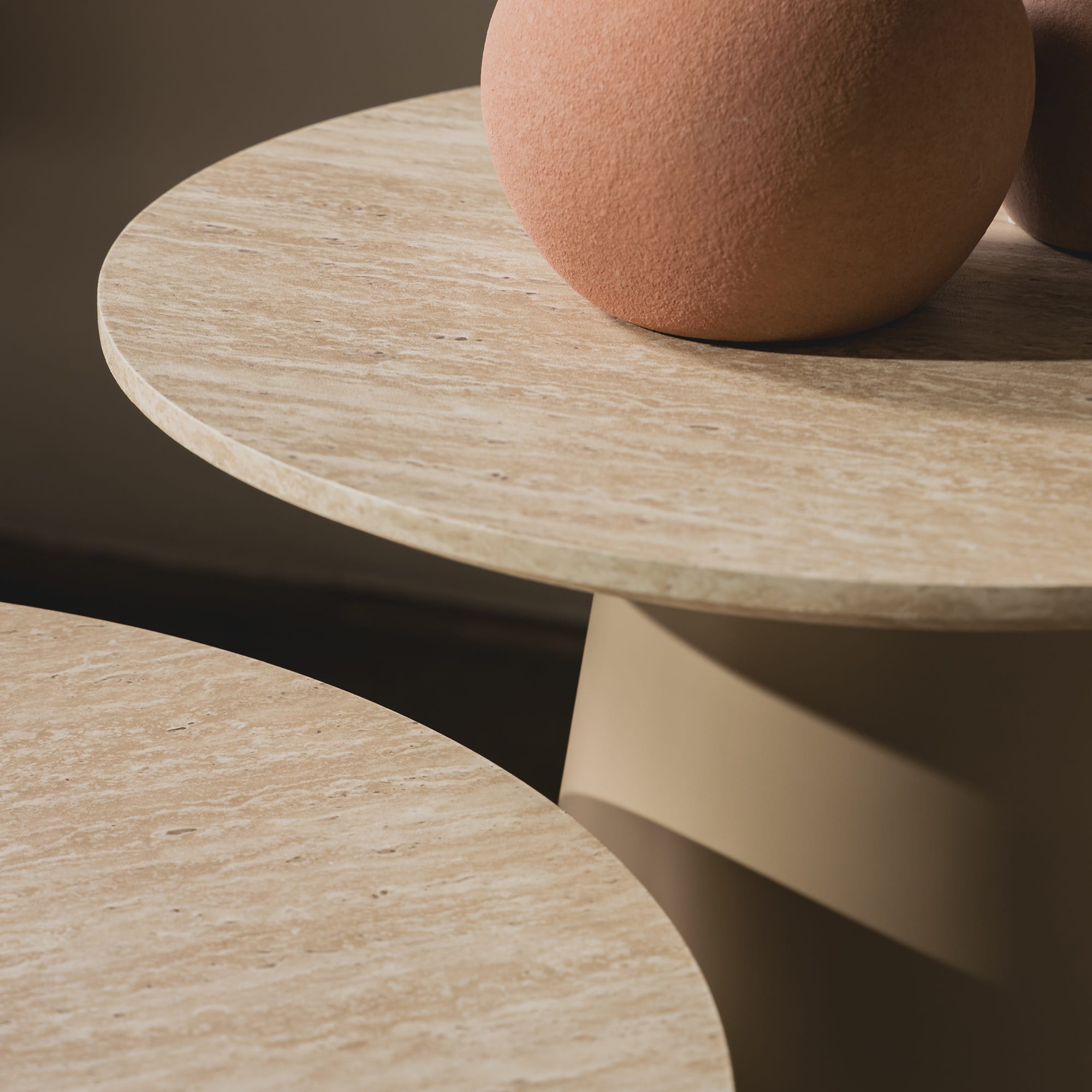 Apvali forma ir travertino imitacijos paviršius kuria ramų, nepastebimą akcentą šalia sofos.