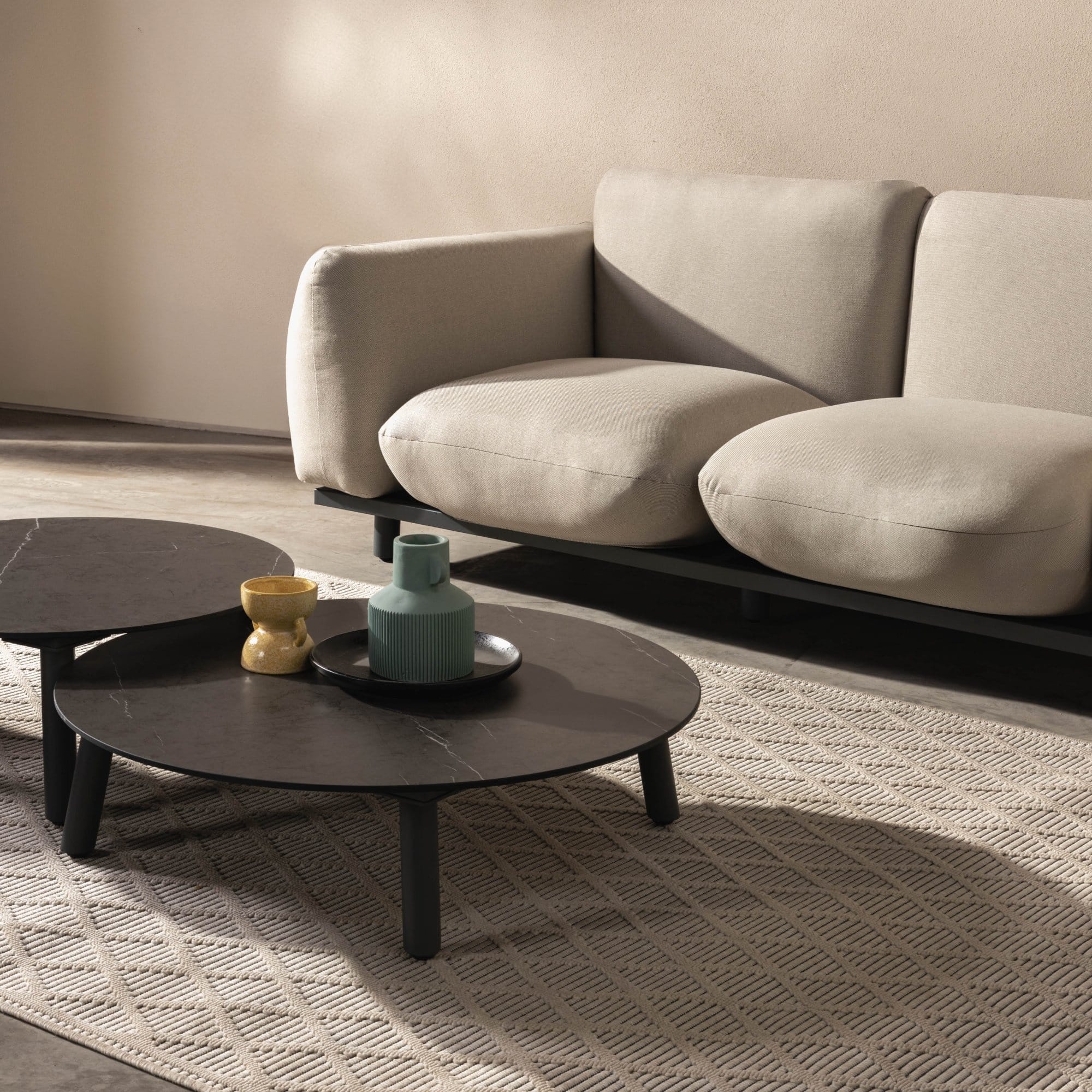 Apvalūs staliukai su marmuriniu dekoru yra ne tik funkcionalūs, bet ir vizualiai puošia komplektą. Jie puikiai tinka kavos puodeliui, knygai ar lengvam užkandžiui.