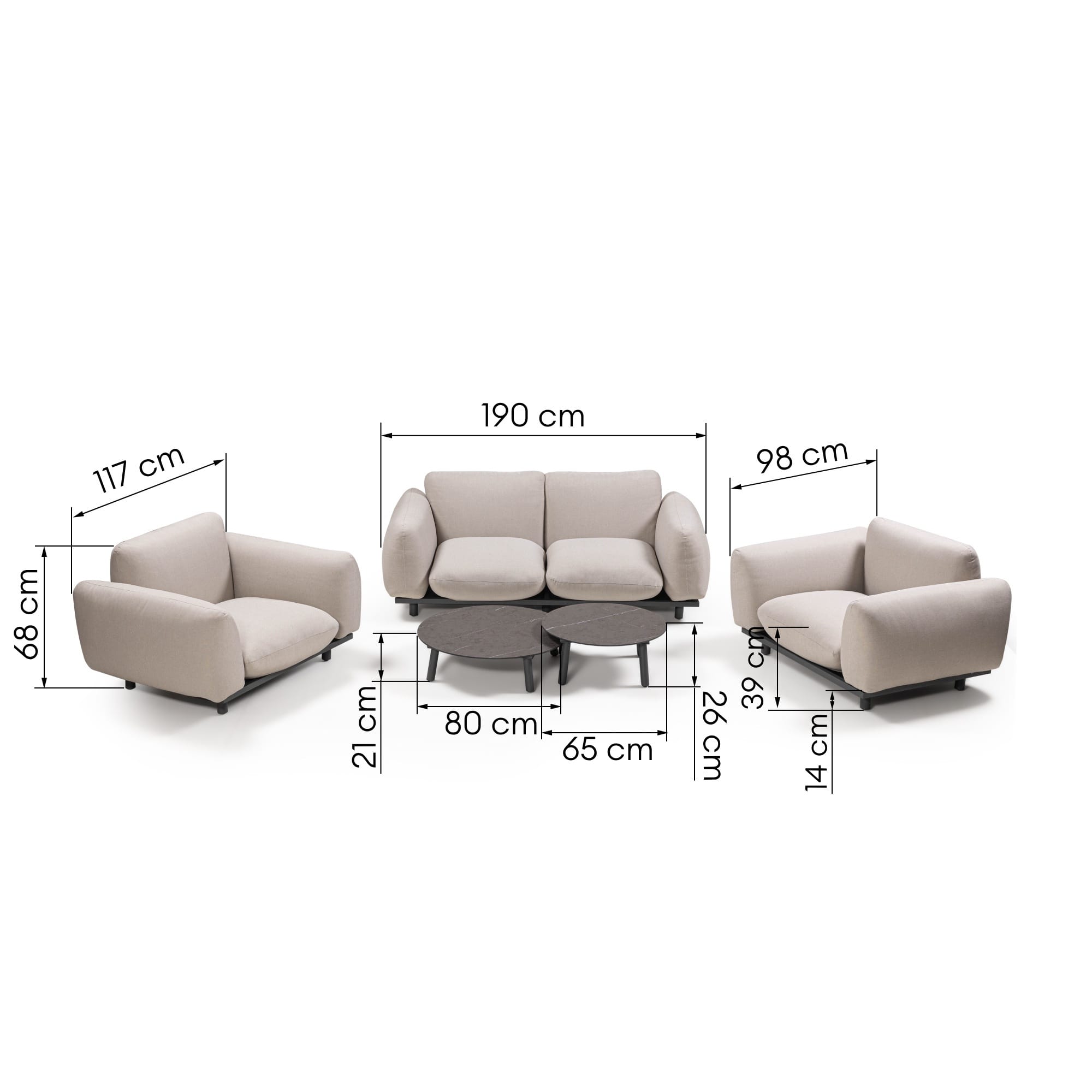 Komplektą sudaro dvivietė sofa, du patogūs foteliai ir du apvalūs staliukai su marmuro dekoru. Šis dizainas ne tik džiugina akį, bet ir leidžia mėgautis kiekviena akimirka gryname ore. Jūsų lauko erdvė taps jaukiu kampeliu poilsiui ar susitikimams su artimaisiais.
