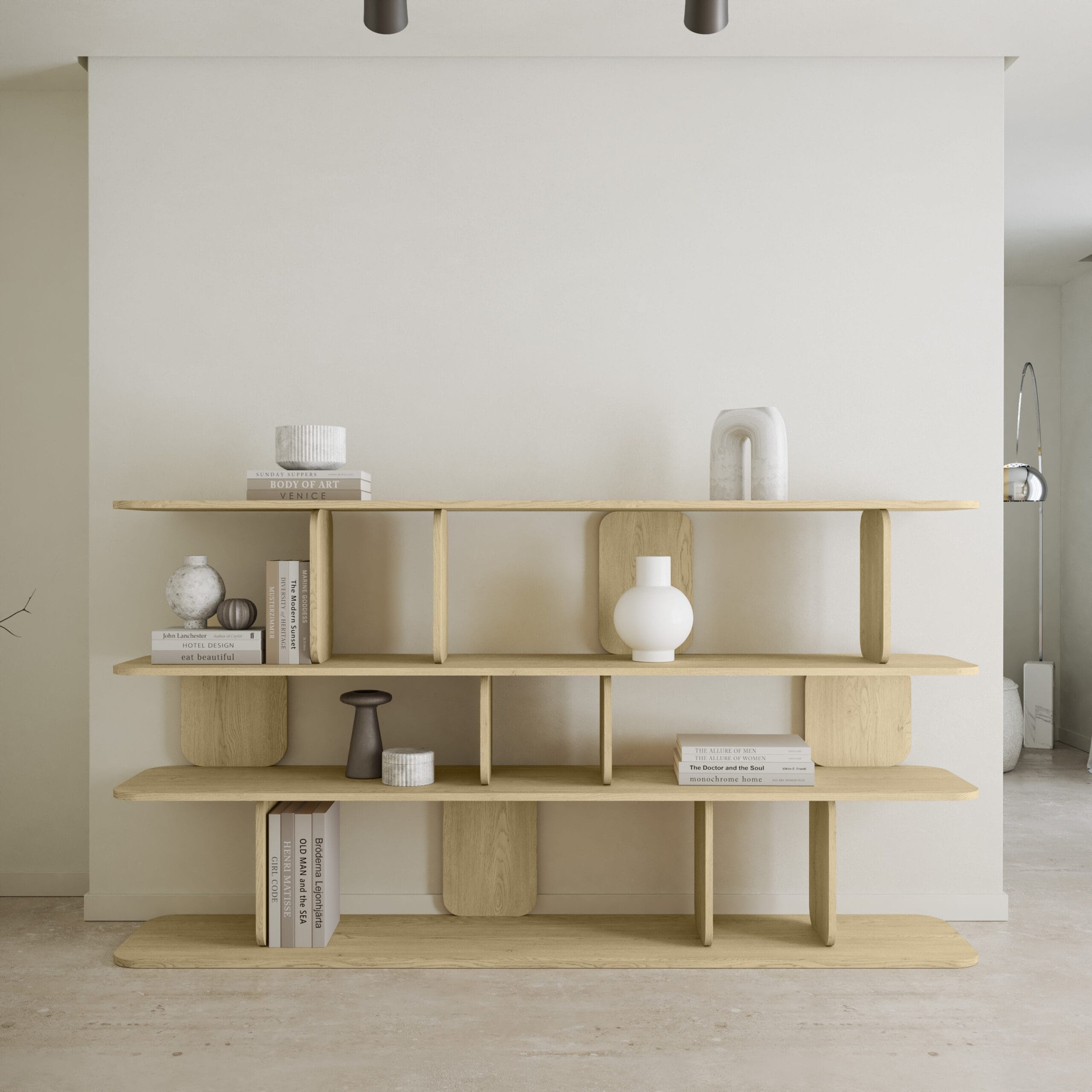 Keturių lygių konstrukcija su skirtingai išdėstytais skyriais leidžia kurti tvarkingą, bet gyvą kompoziciją. Tai lentyna, kurioje galima eksponuoti knygas, žvakes, vazas, rėmelius, dizaino detales ar net kasdienes smulkmenas, kurios paprastai kabintų akis. Tulumo Oak 200 leidžia viskam atrasti vietą – be chaoso, be perkrovimo.