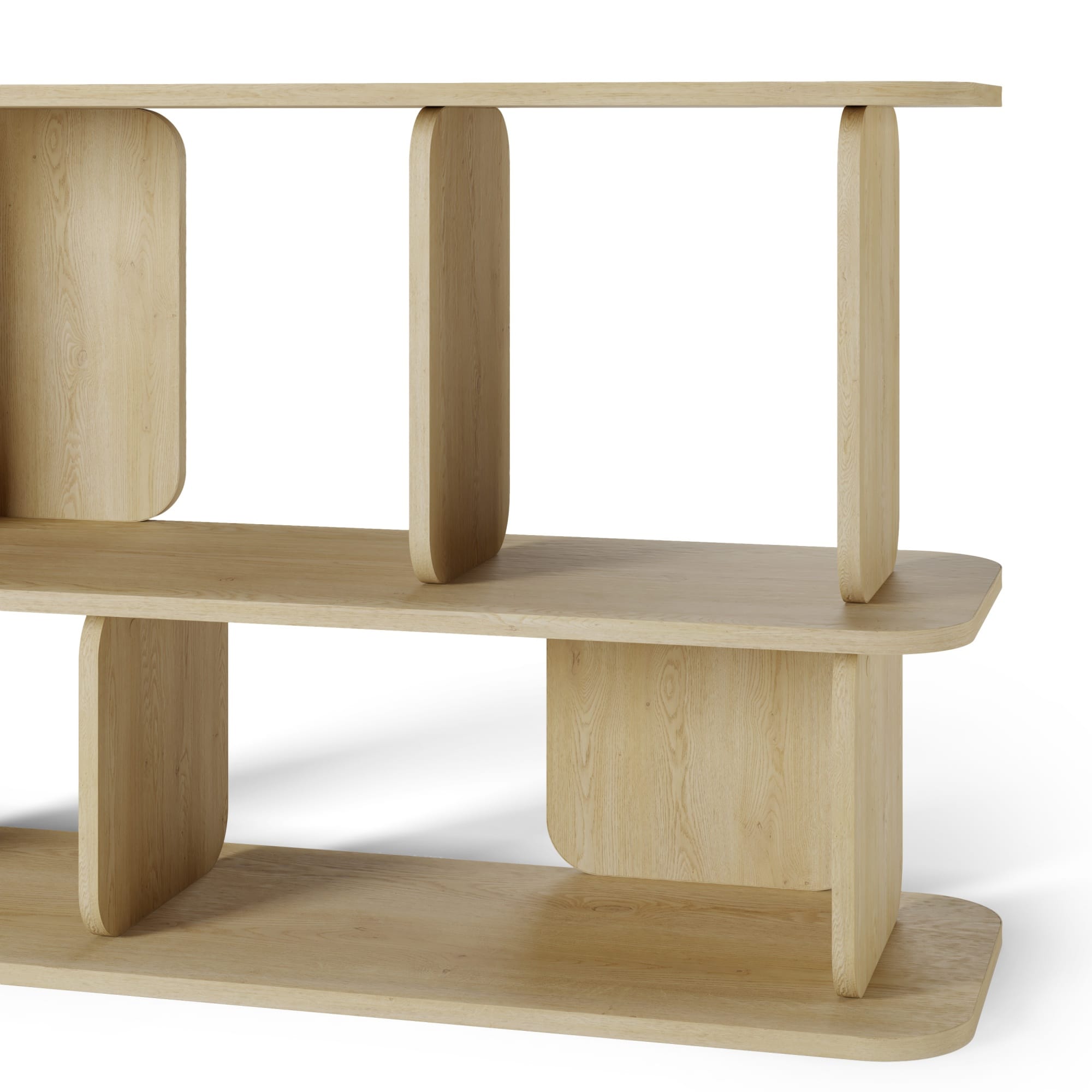 Geometrinė konstrukcija su užapvalintais kraštais suteikia lentynai vizualinės švelnybės. Tiesios linijos derinamos su subtiliu švelnumu – toks balansas šiuo metu labai mėgstamas interjero dizainerių, nes leidžia erdvei atrodyti tvarkingai, bet ne griežtai.