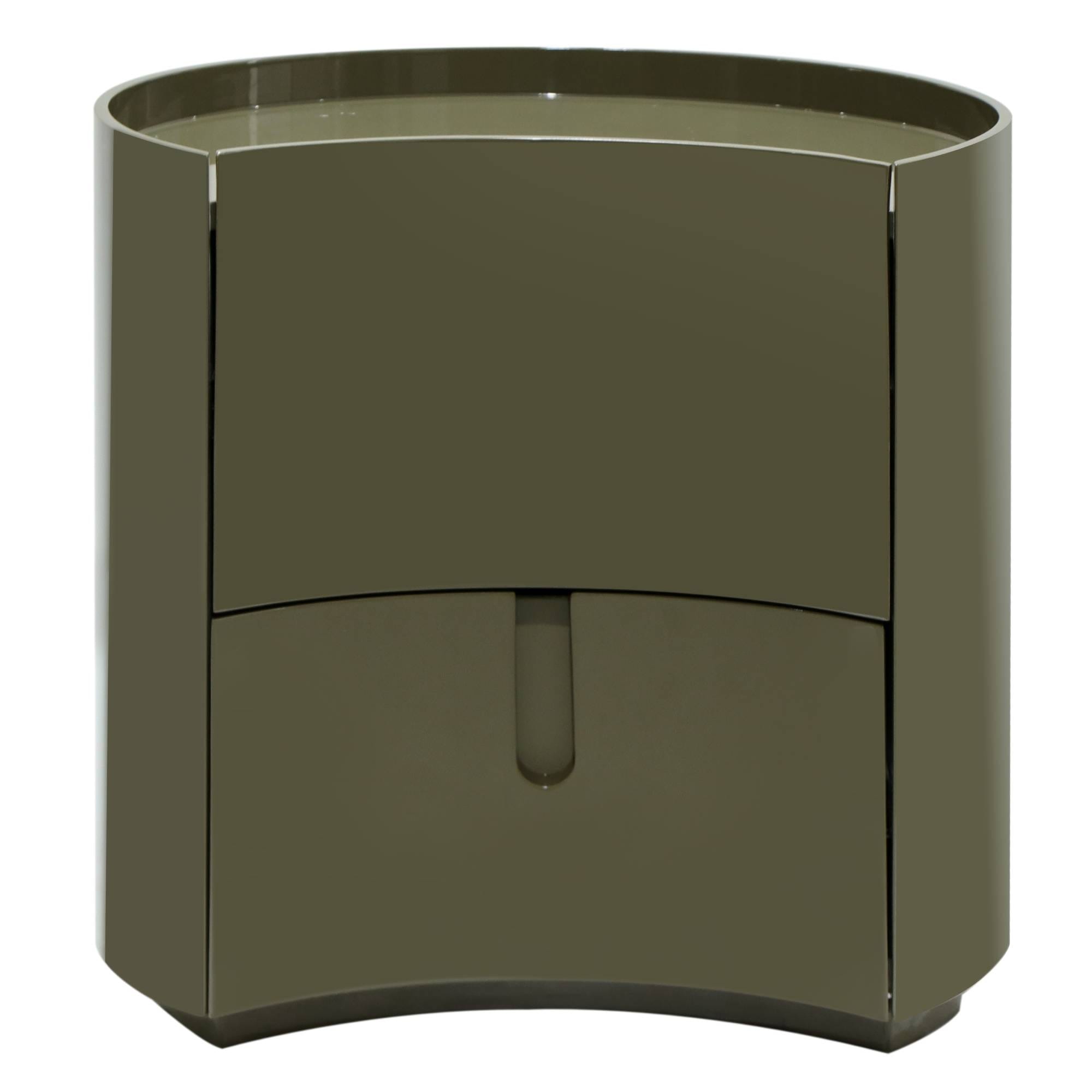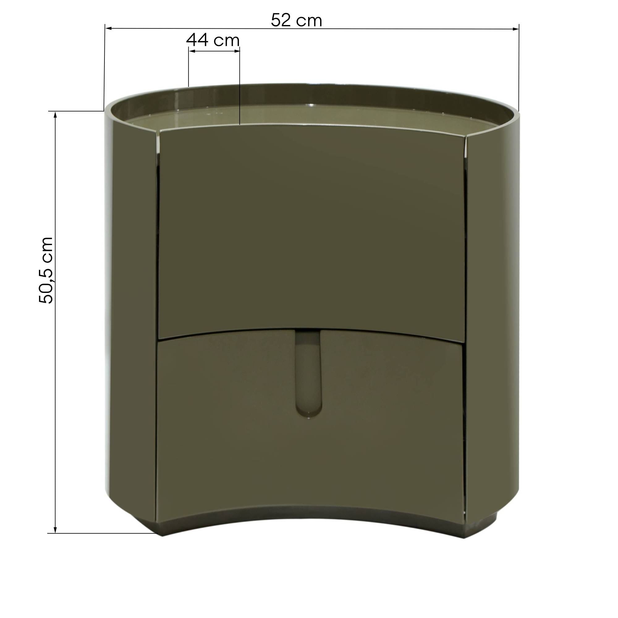 Apvali forma, blizgi žalia spalva ir du stalčiai. Naktinis staliukas, kuriame dizainas paremtas proporcijomis ir kasdieniu naudojimu.